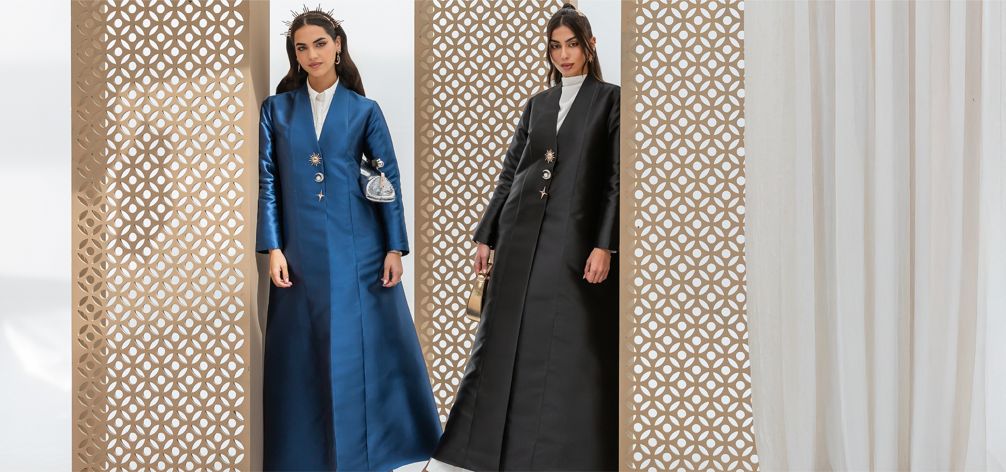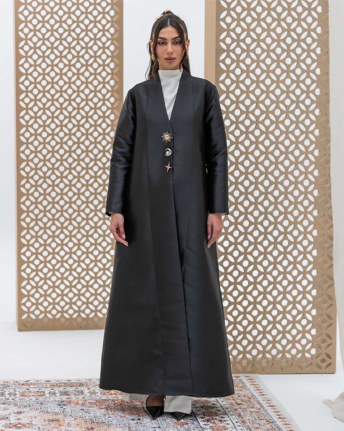 A-Line Mikado Blazer-Cut Abaya with Structured Panels, V-Neck Collar, and a Four Snap-Button Closure, Finished...