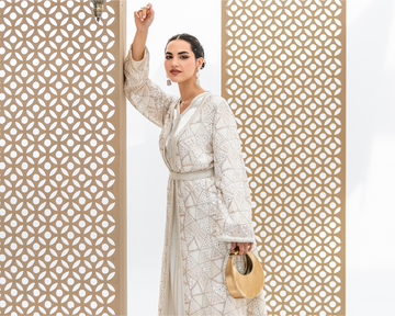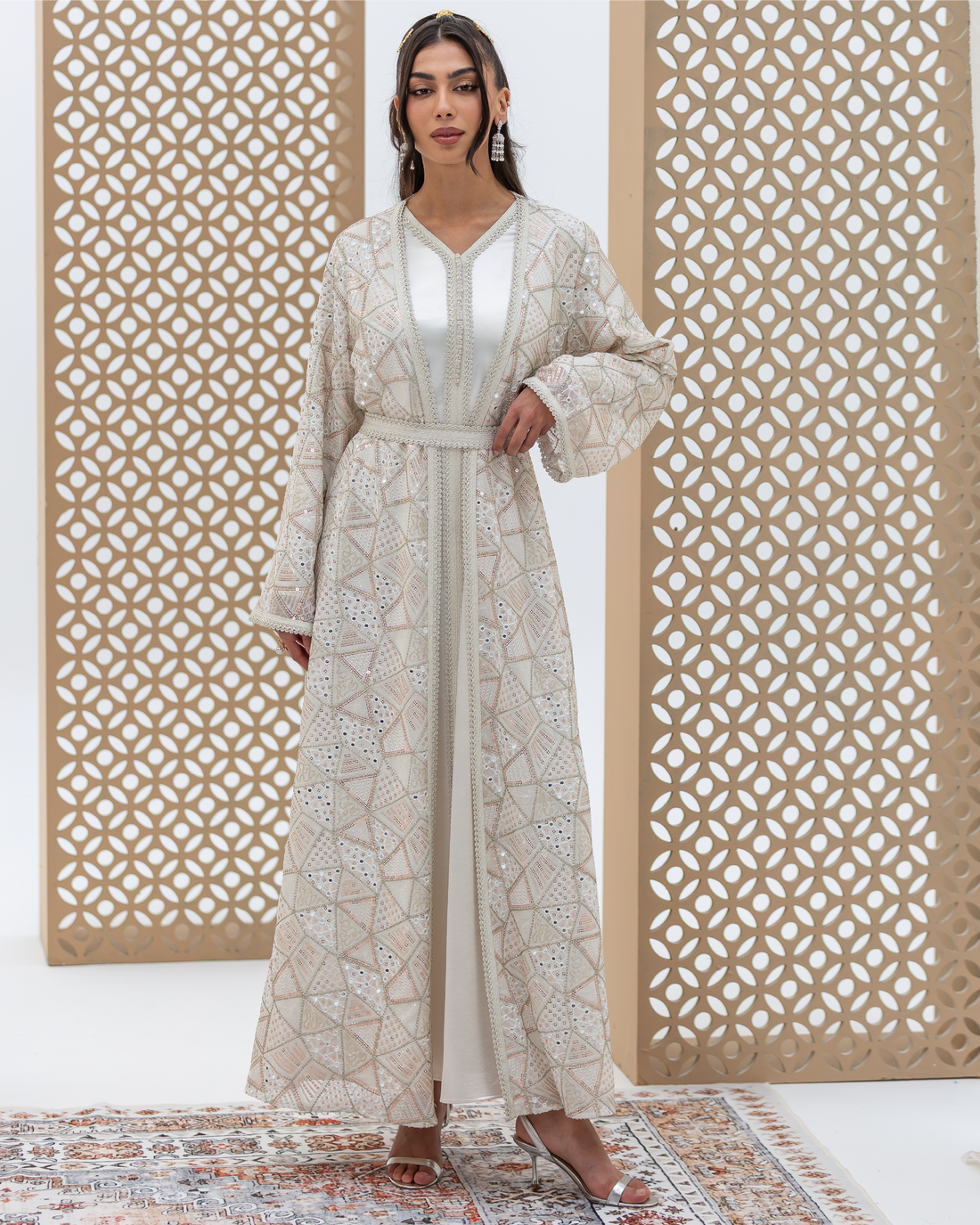 White Mira Kaftan Crafted from Embellished Mirror Chiffon Featuring Geometric Sequined Intricate All-Over Embroidery. Designed...