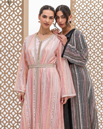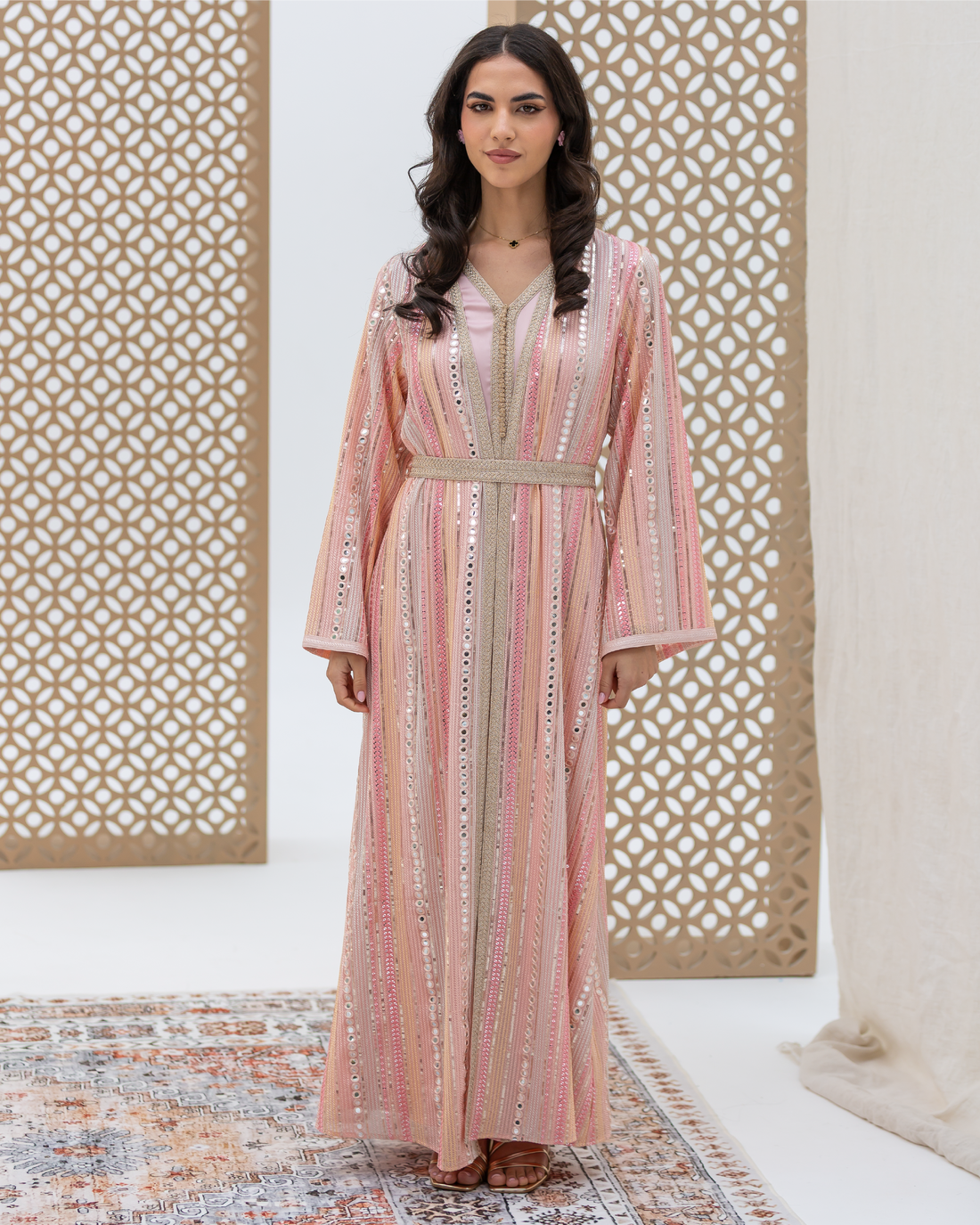 Pink Mira Kaftan Crafted from Embellished Mirror Chiffon Featuring Intricate All-Over Embroidery. Designed as a...