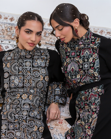 Black Jalabiya Featuring Botanical Indian Embroidery Stitched and Sequined on Luxury Velvet, Combined with a...