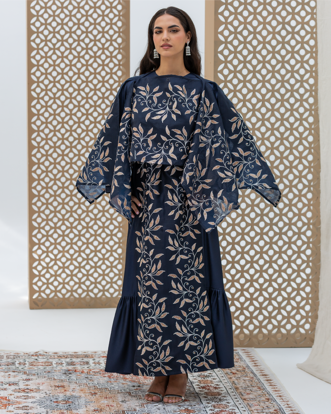 Teal Mira Kaftan Crafted from Embellished Mirror Chiffon Featuring Intricate All-Over Embroidery. Designed as a...