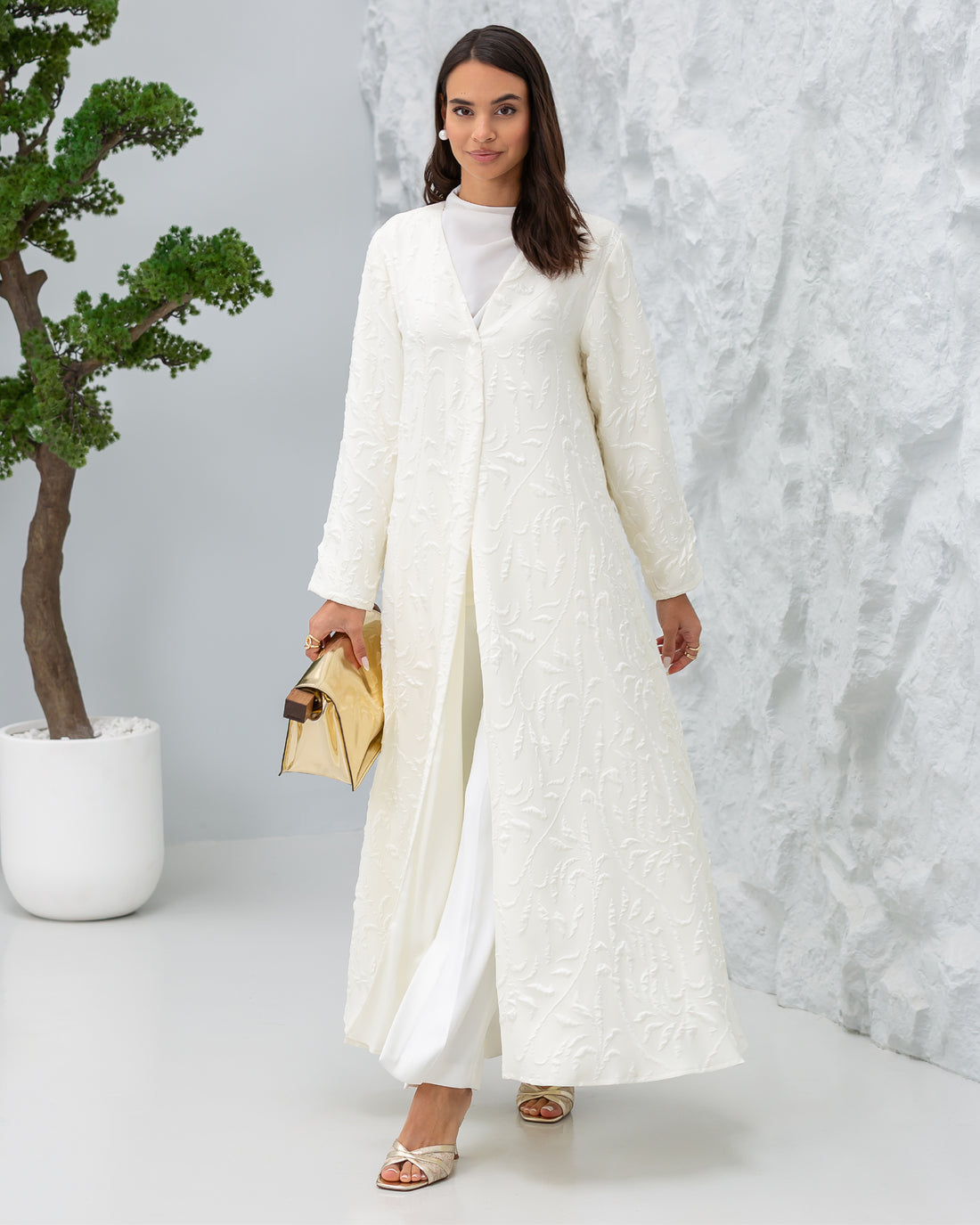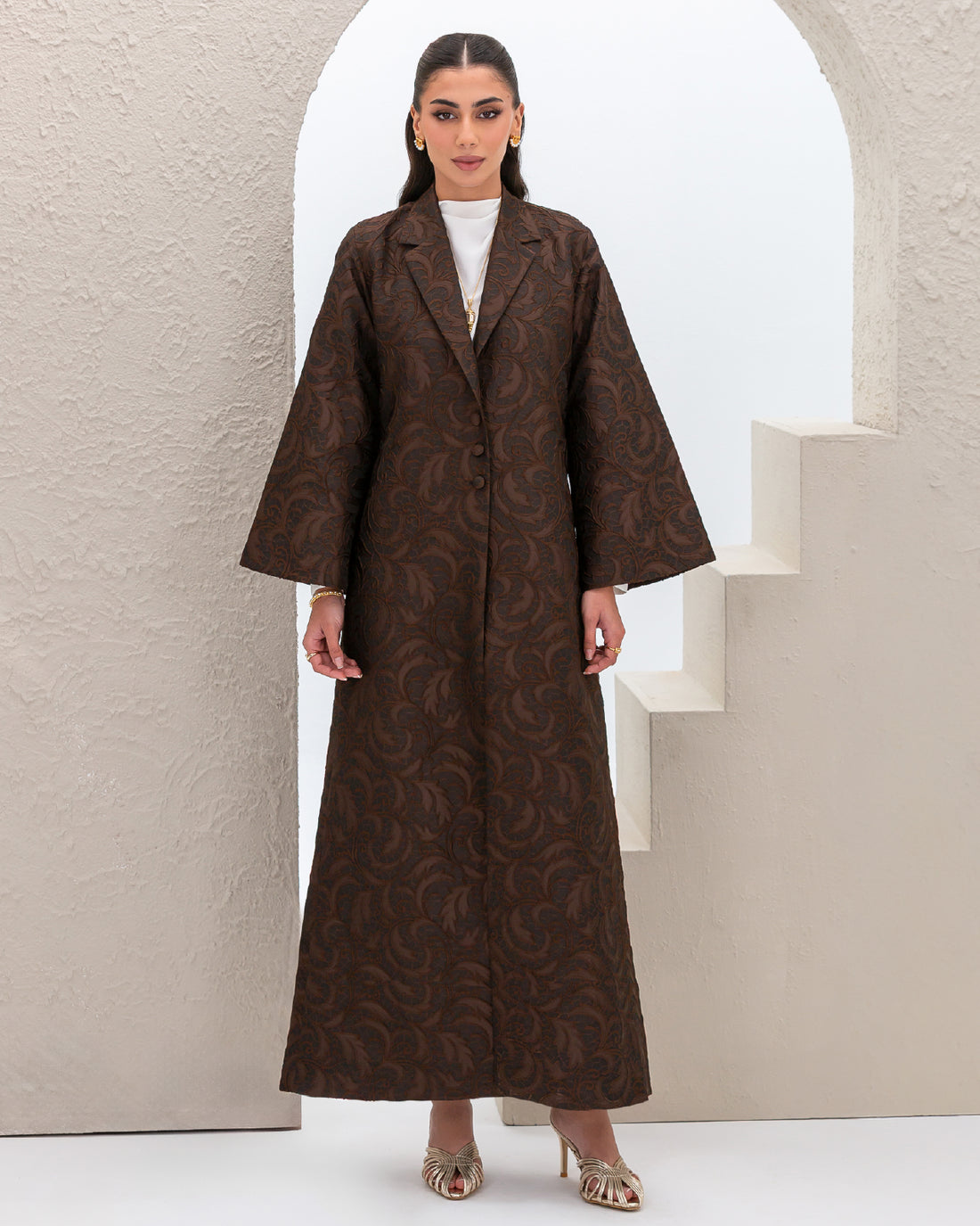 Guipure Crepe A-Line Abaya with a Blazer-Inspired Cut and Collar, Four-Button Closure, and Straight Sleeves.