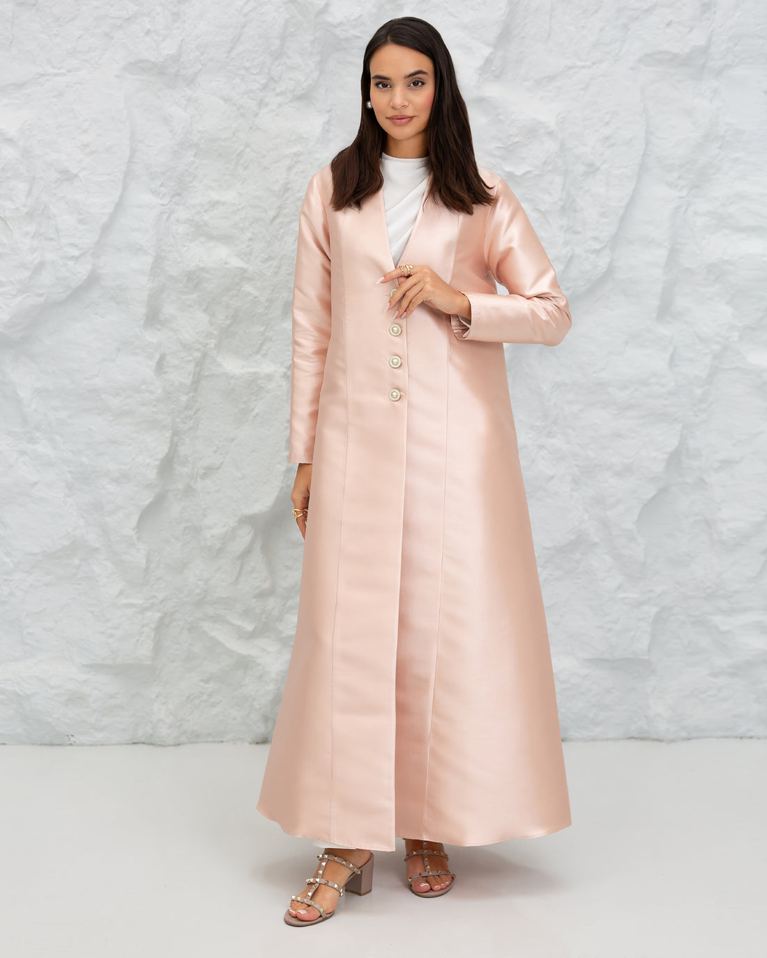 A Line Mikado Blazer-Cut Abaya with Structured Panels, V Collar and 4 Pearl Buttons Closure...