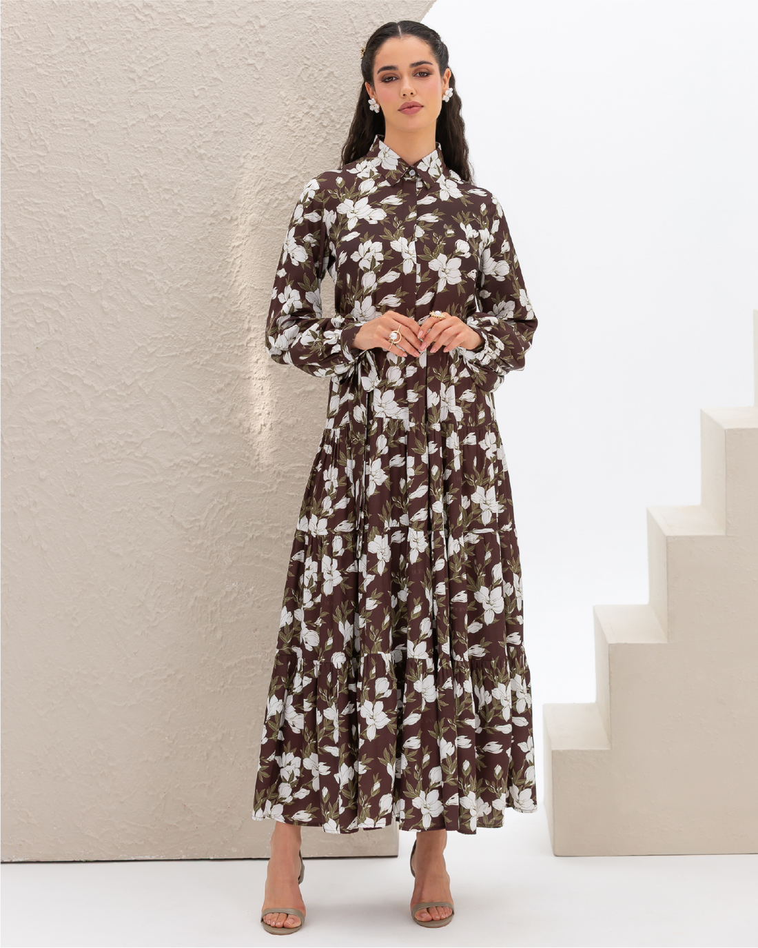 Palm Printed Shirt Dress with a Straight Cut, Wide Sleeves, and Hidden Buttons. The Printed...