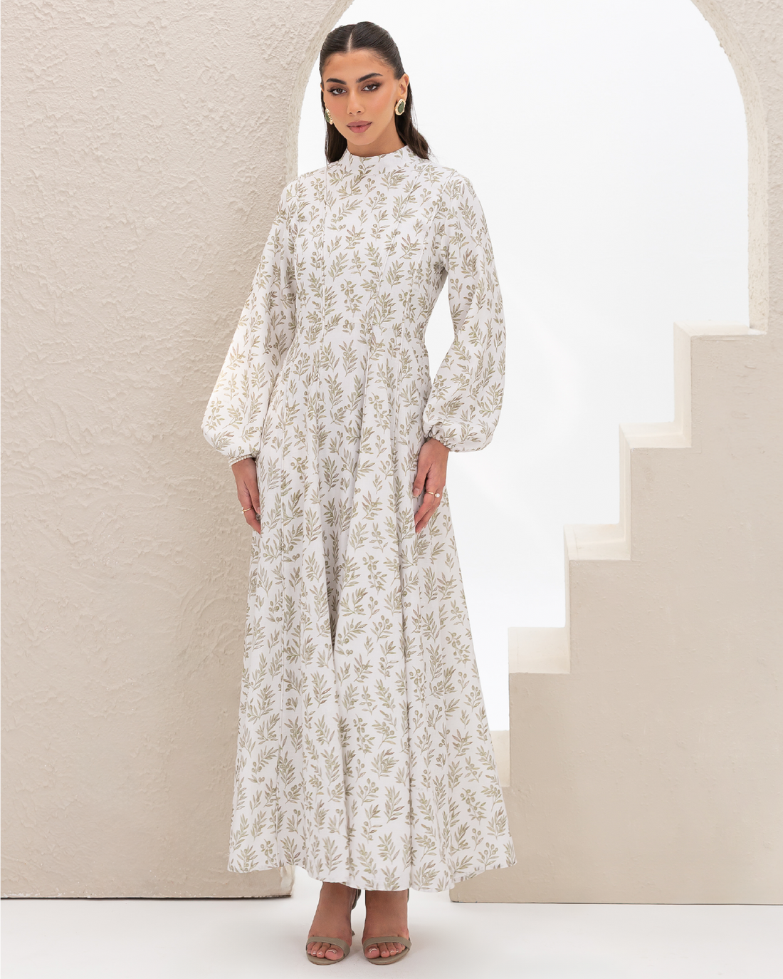 Flare Dress in Olive Branches Printed Cotton Linen Blend, Fully Lined Featuring Balloon Sleeves, Fitted...