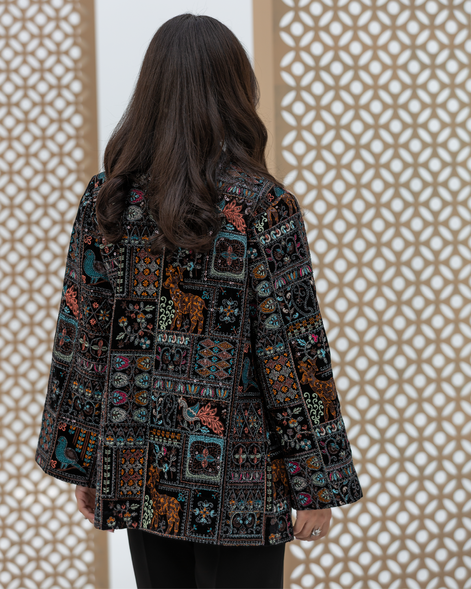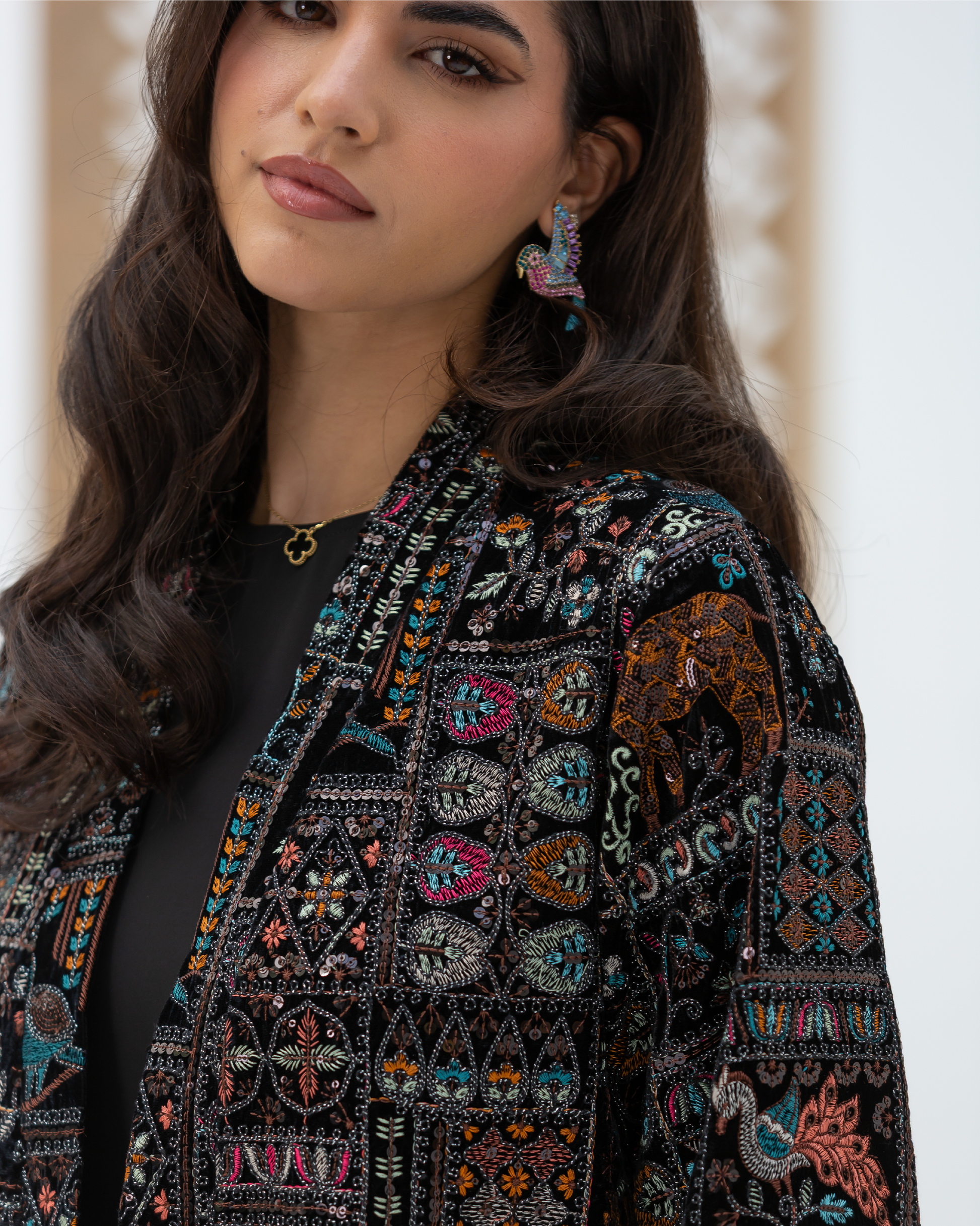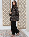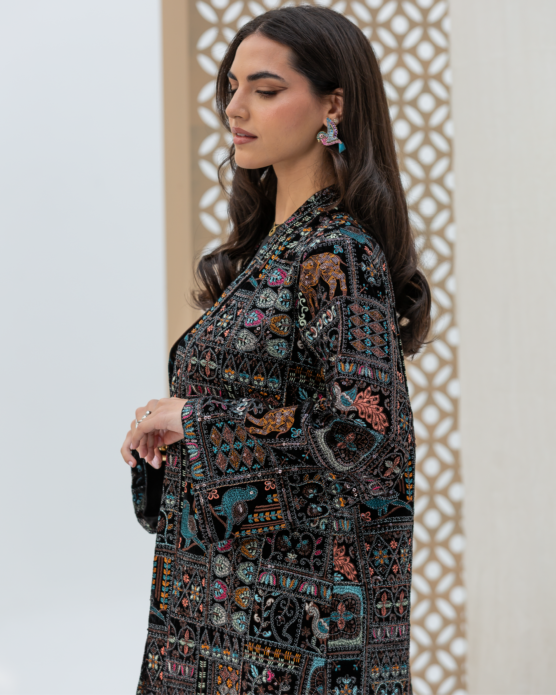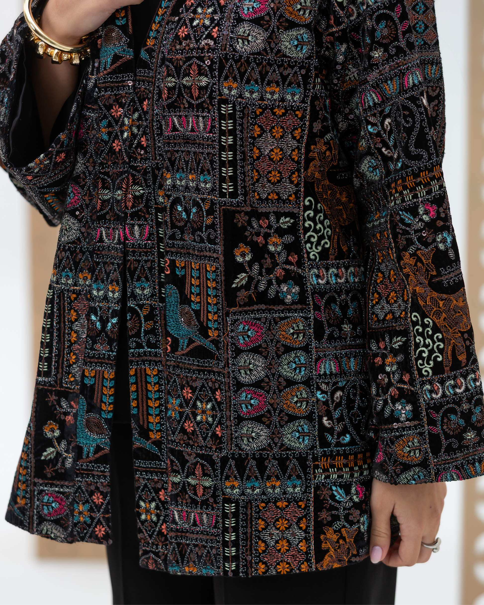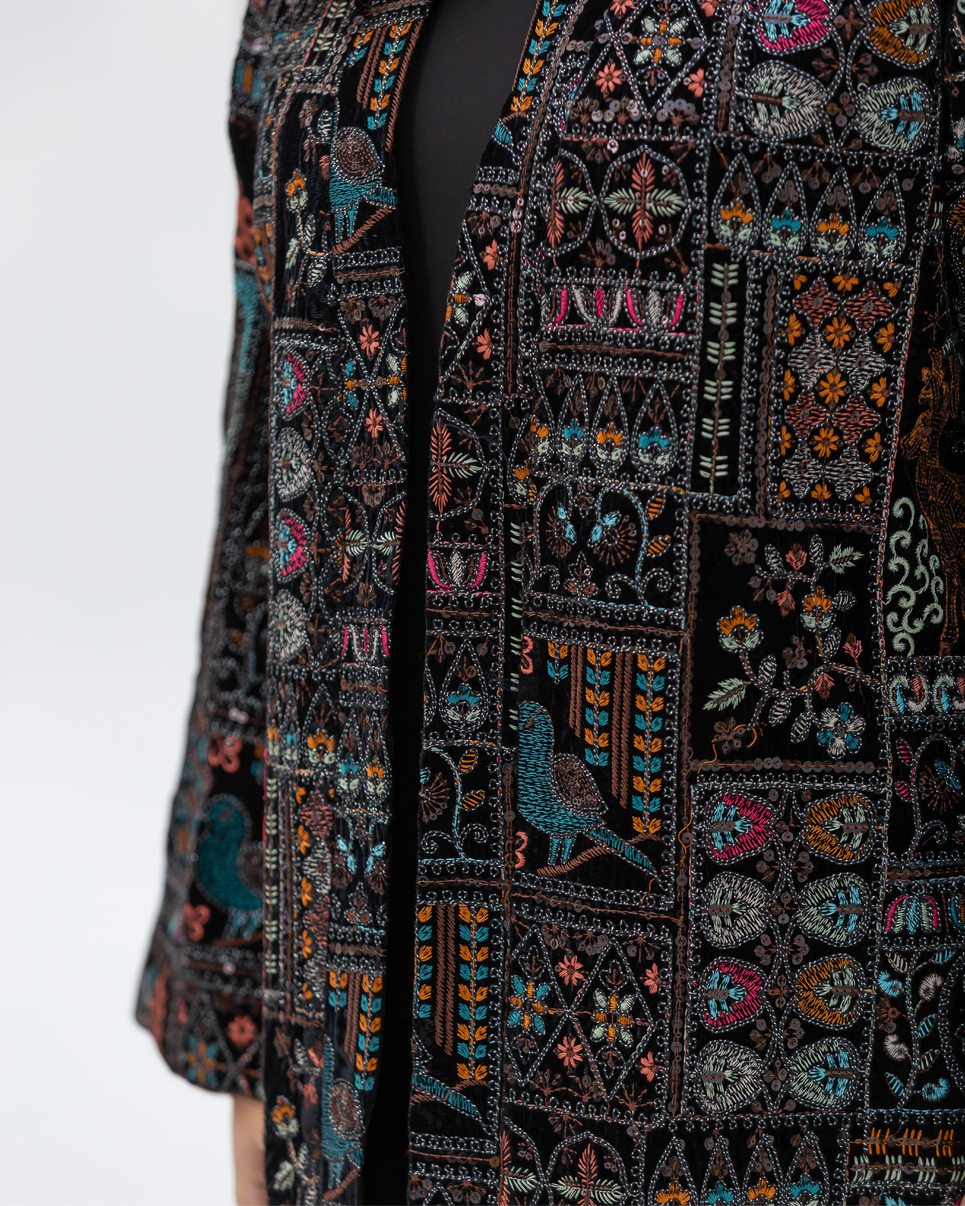 Black Straight-Cut Embroidered Luxury Velvet Cardigan with Sequin Details and Intricate Stitching. Designed with Long Straight Sleeves and Wide Cuffs Fully Lined with Sweet-Touch Silk