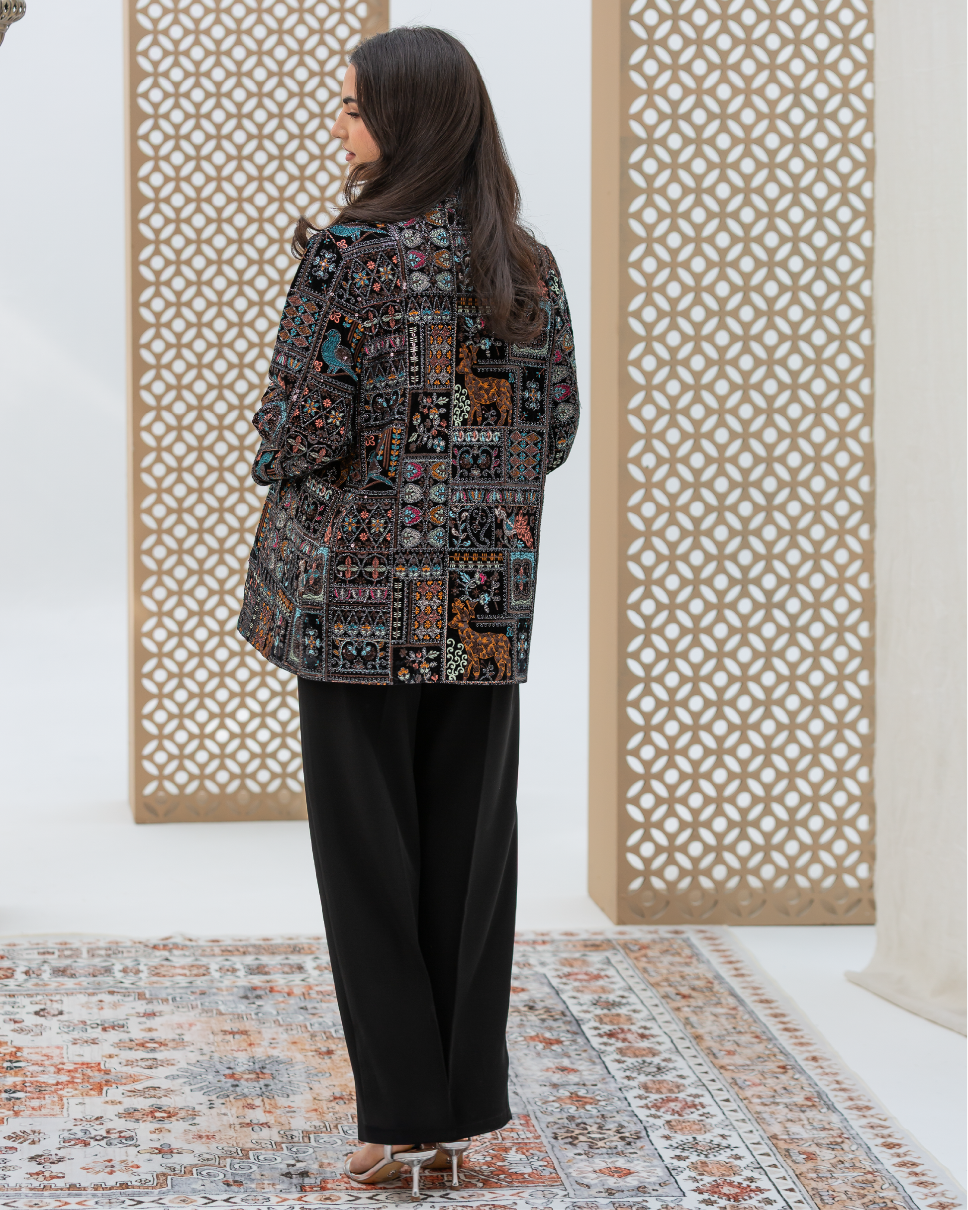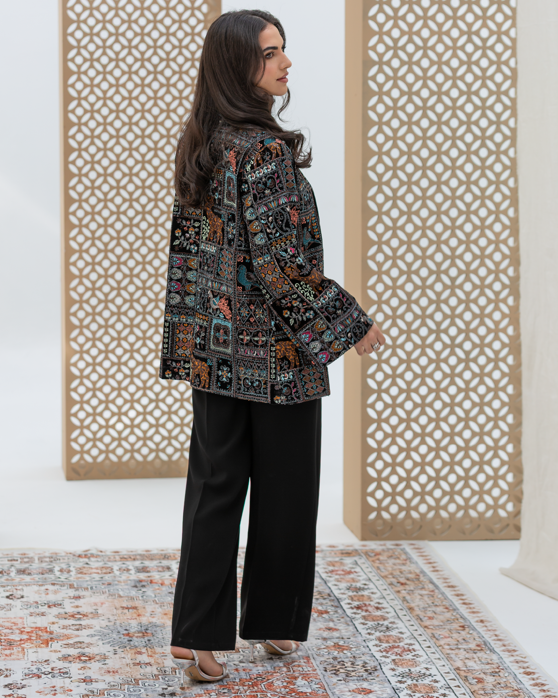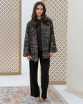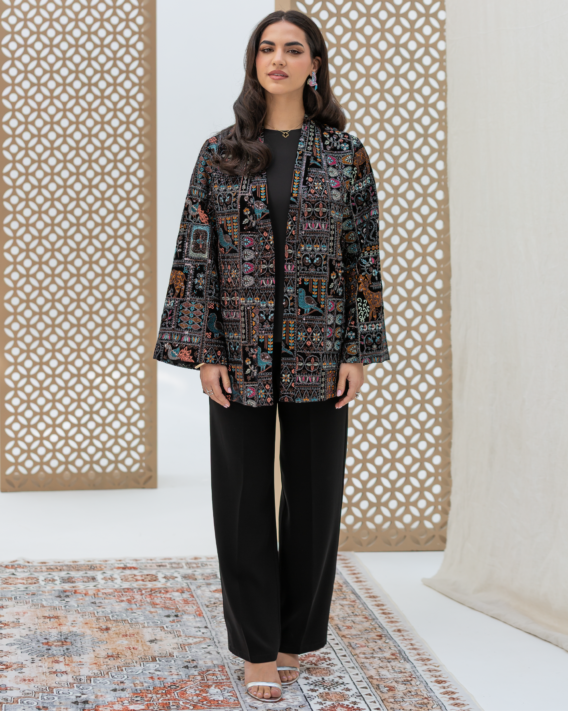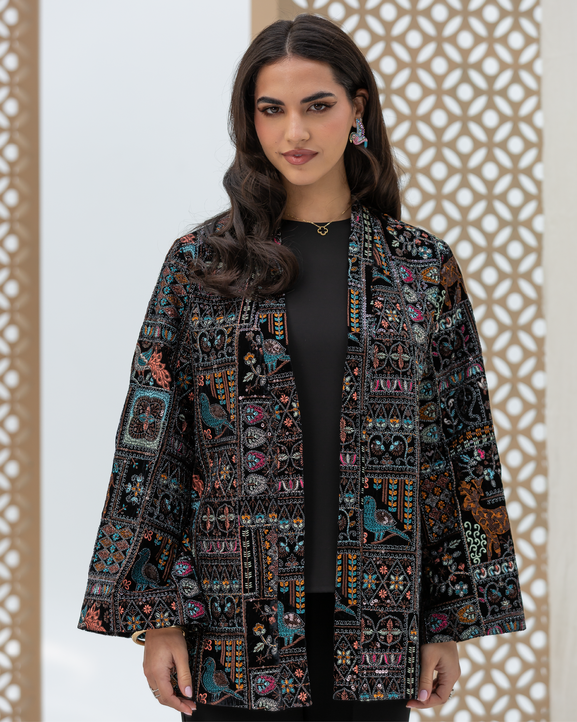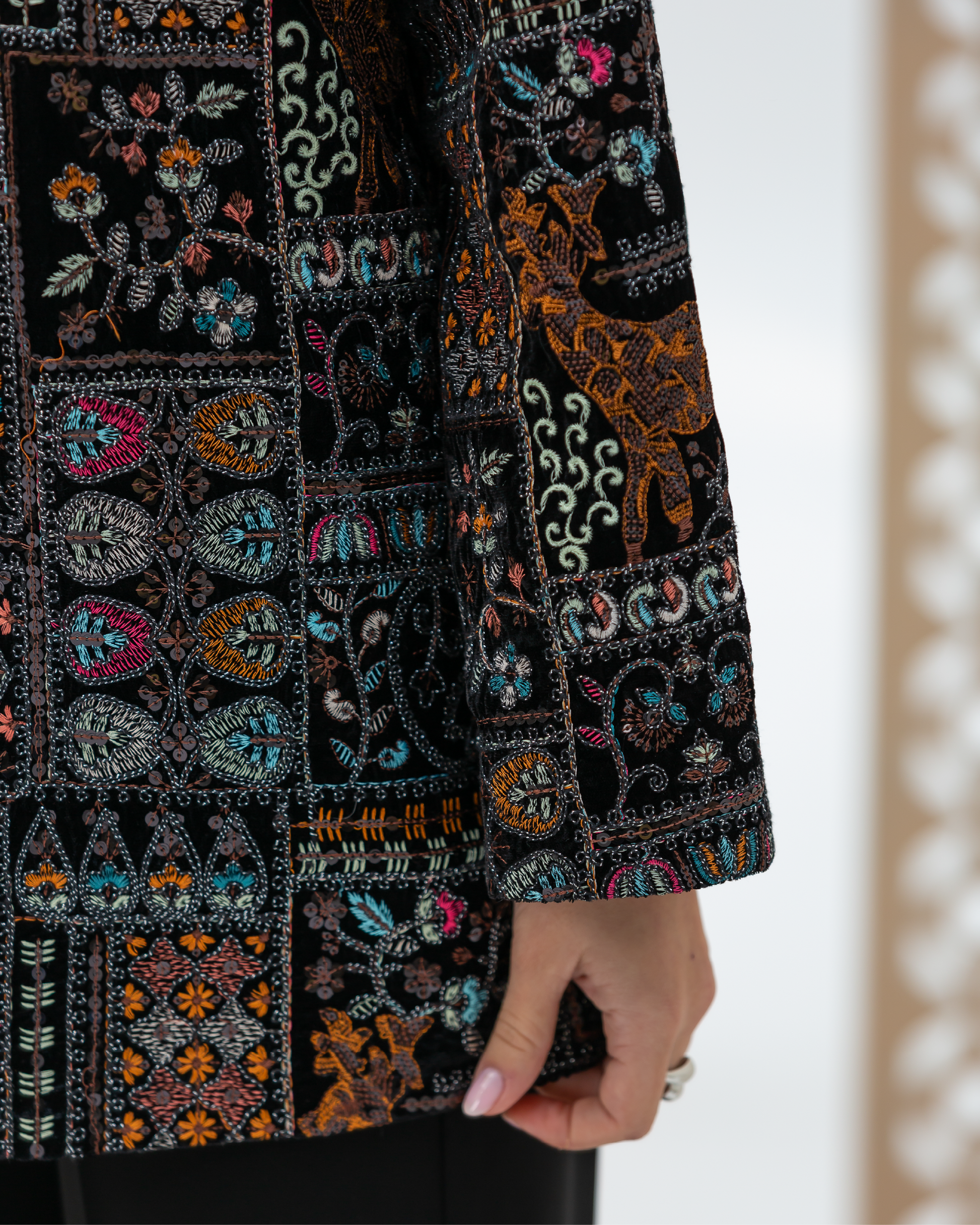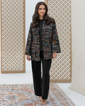 Black Straight-Cut Embroidered Luxury Velvet Cardigan with Sequin Details and Intricate Stitching. Designed with Long Straight Sleeves and Wide Cuffs Fully Lined with Sweet-Touch Silk