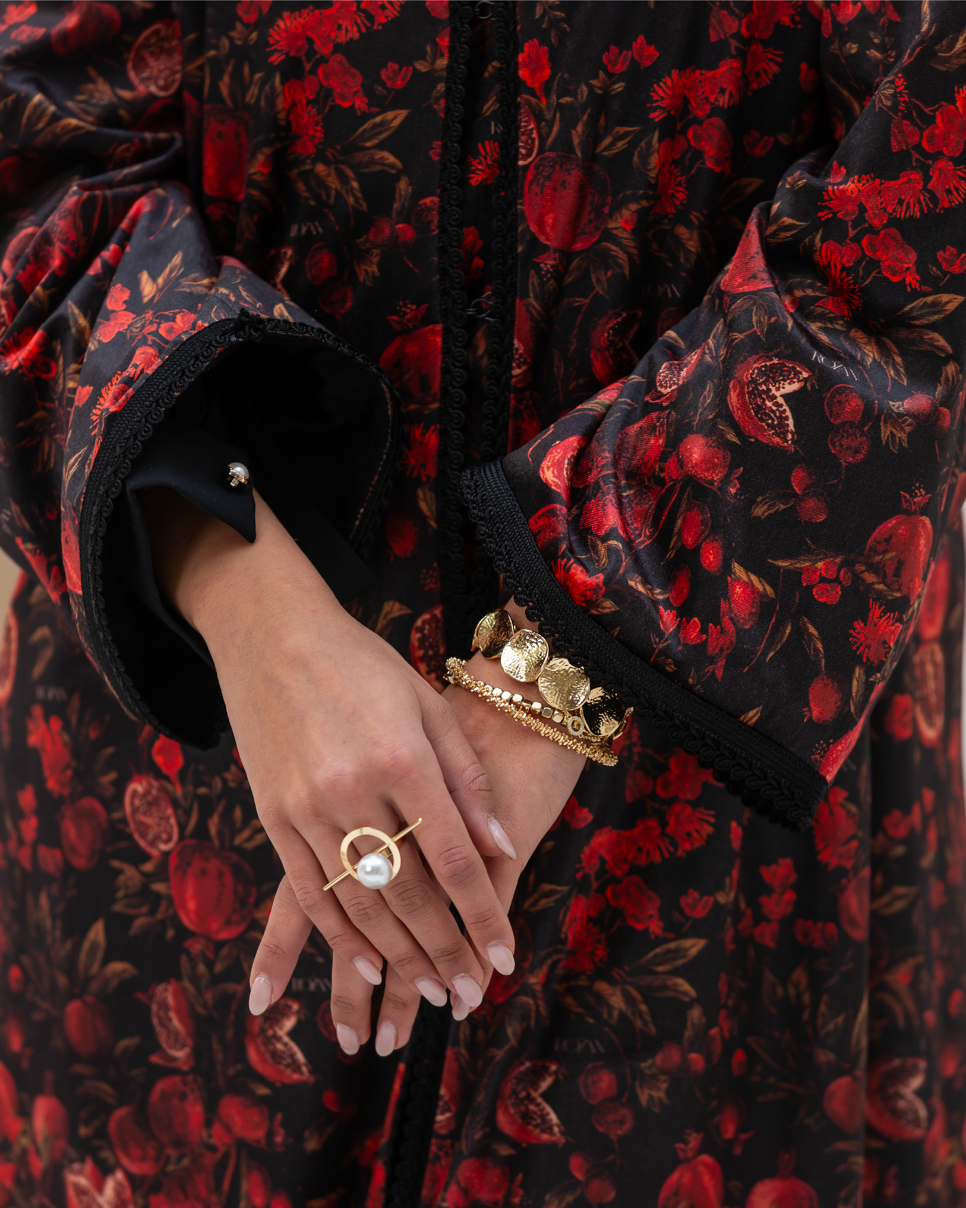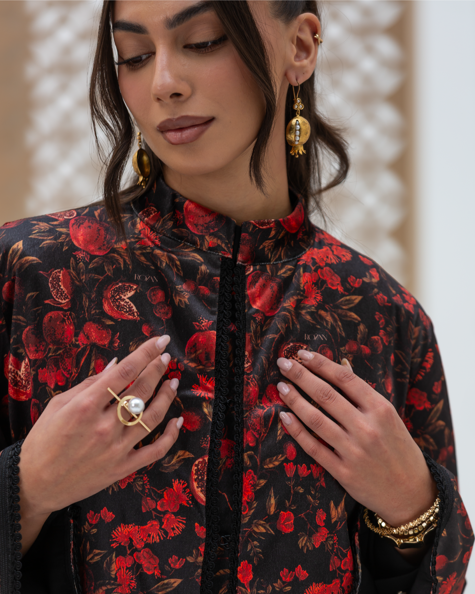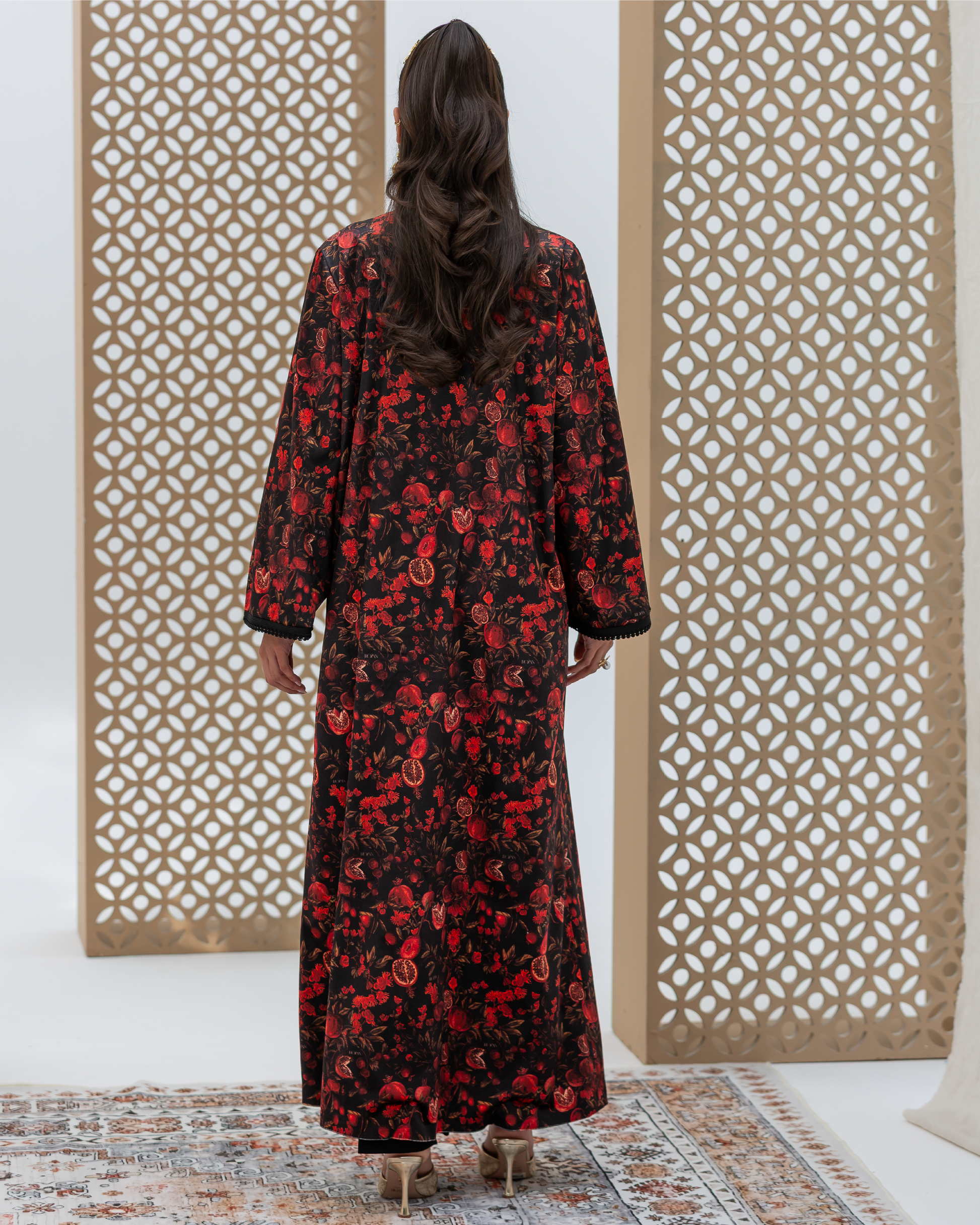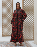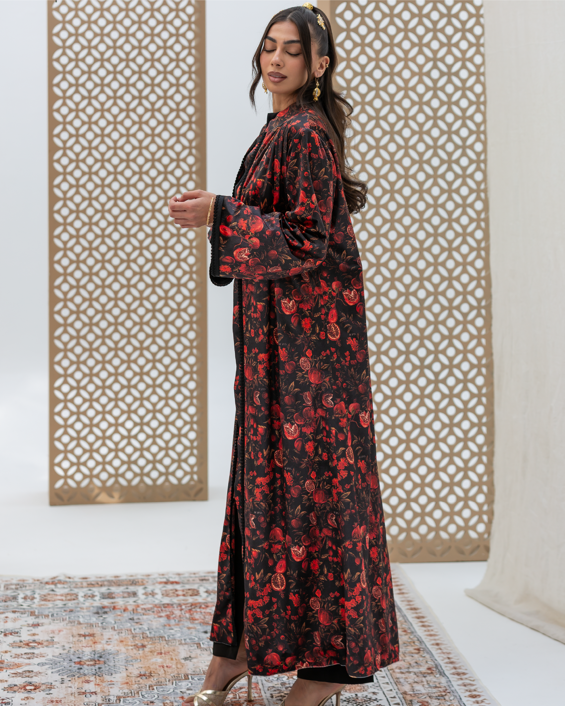 Jullanar Velvet Abaya Crafted from Stretchy Velvet Featuring an Exclusive Rozan Pomegranate Print. Fully Lined for a Refined Finish. Designed with a High Collar and Long Sleeves, Finished with Moroccan Lace Detailing Along the Front Opening and Sleeve Edges. Comes with Large Front Hooks for Optional Closure.
