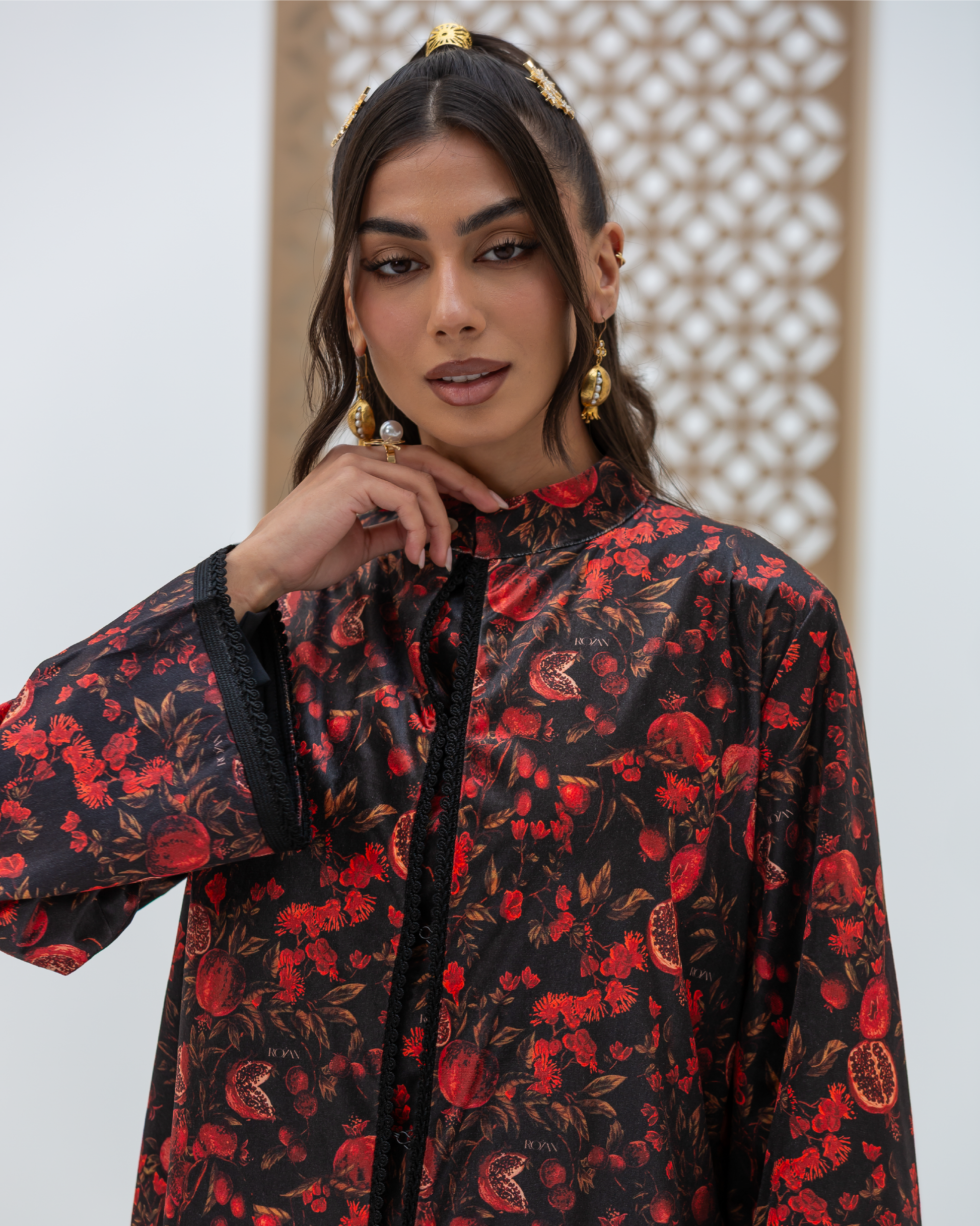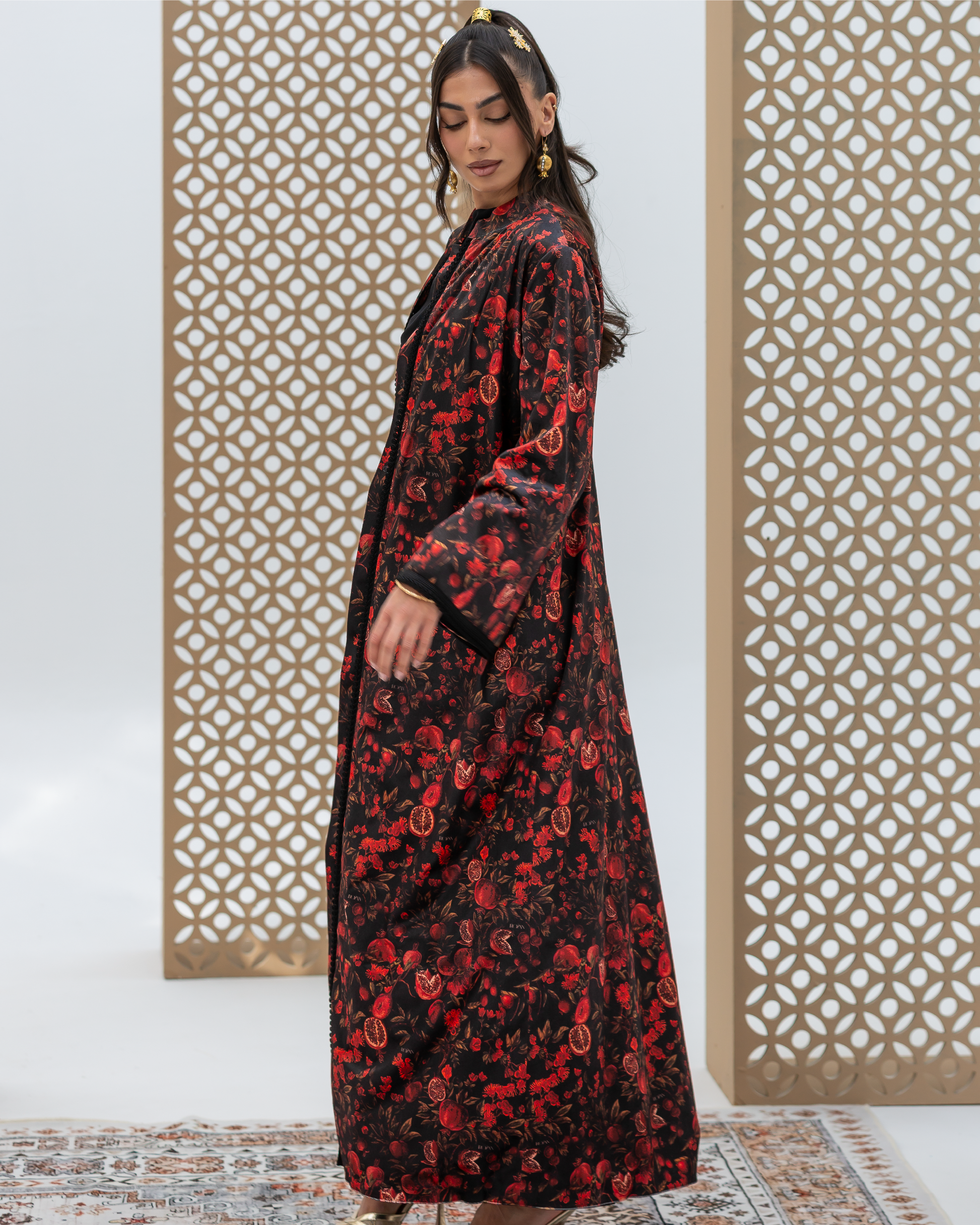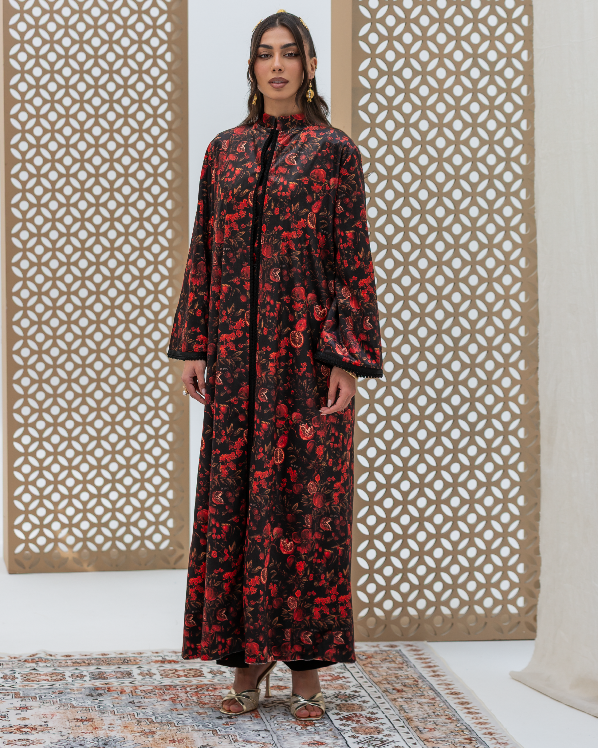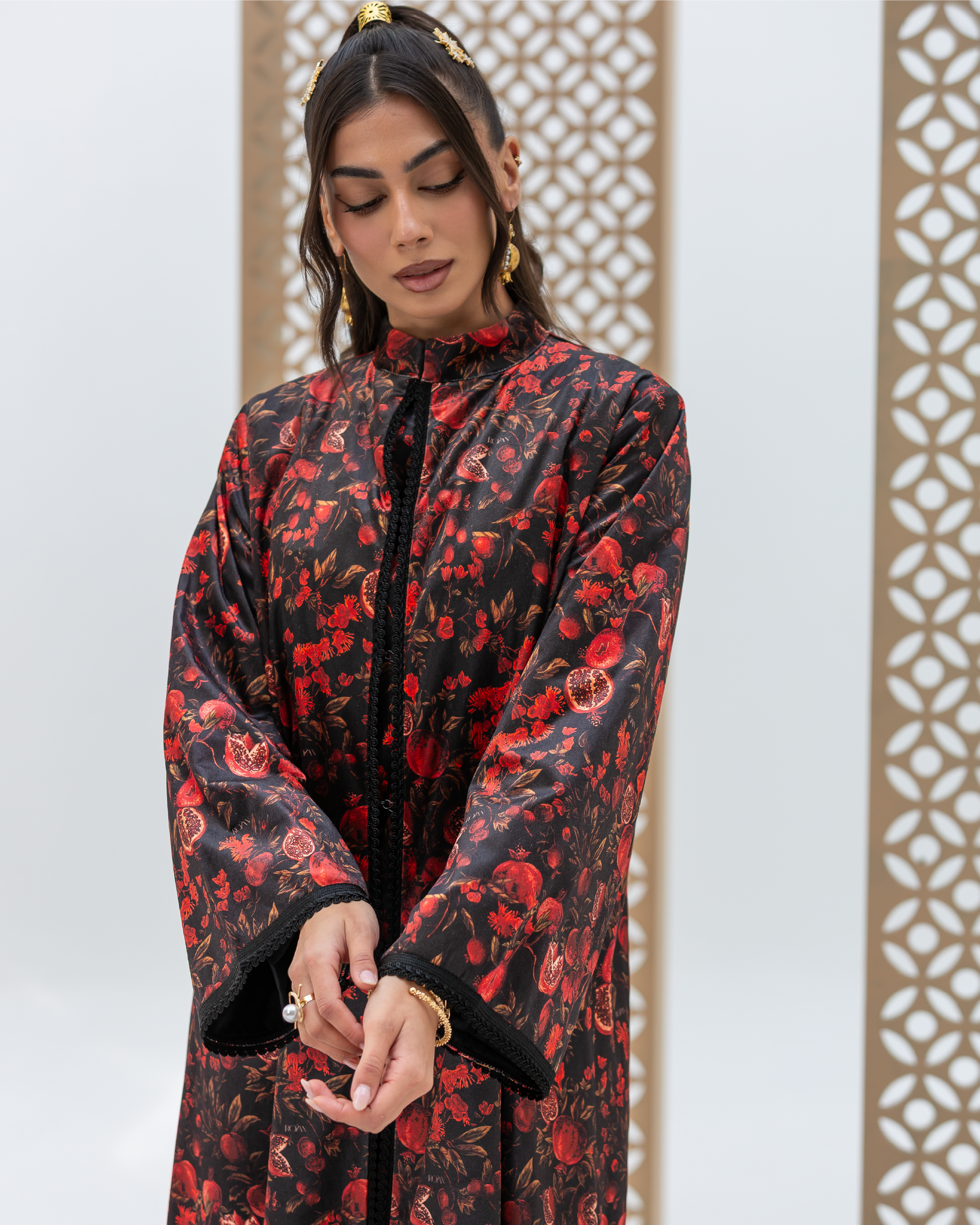 Jullanar Velvet Abaya Crafted from Stretchy Velvet Featuring an Exclusive Rozan Pomegranate Print. Fully Lined for a Refined Finish. Designed with a High Collar and Long Sleeves, Finished with Moroccan Lace Detailing Along the Front Opening and Sleeve Edges. Comes with Large Front Hooks for Optional Closure.
