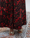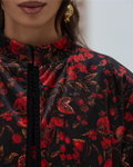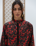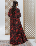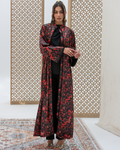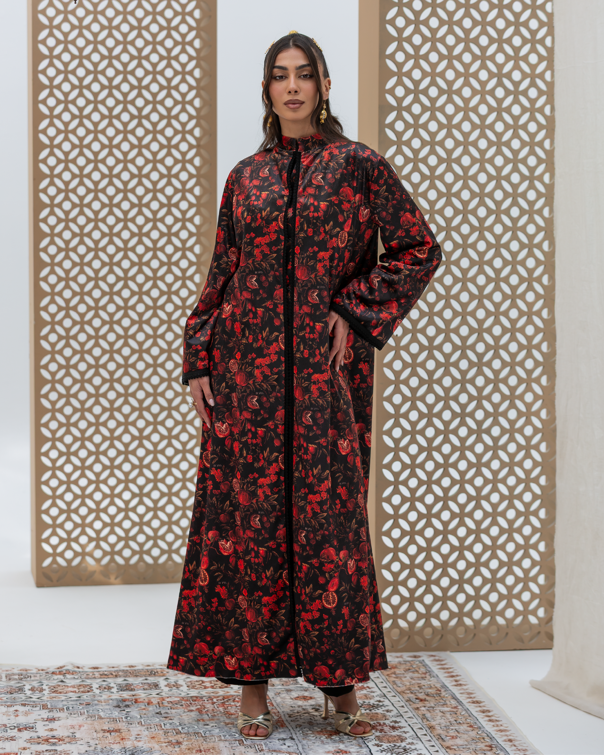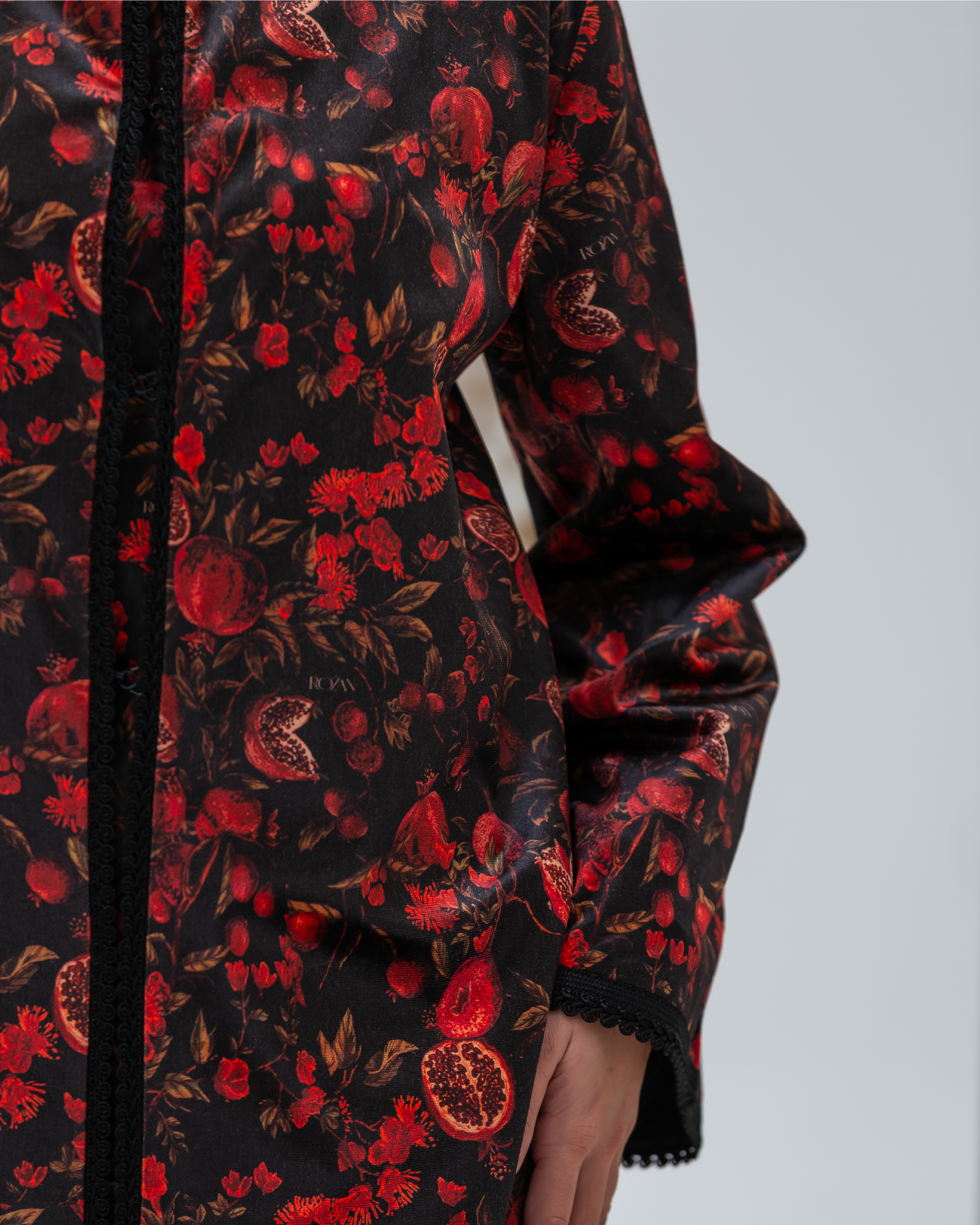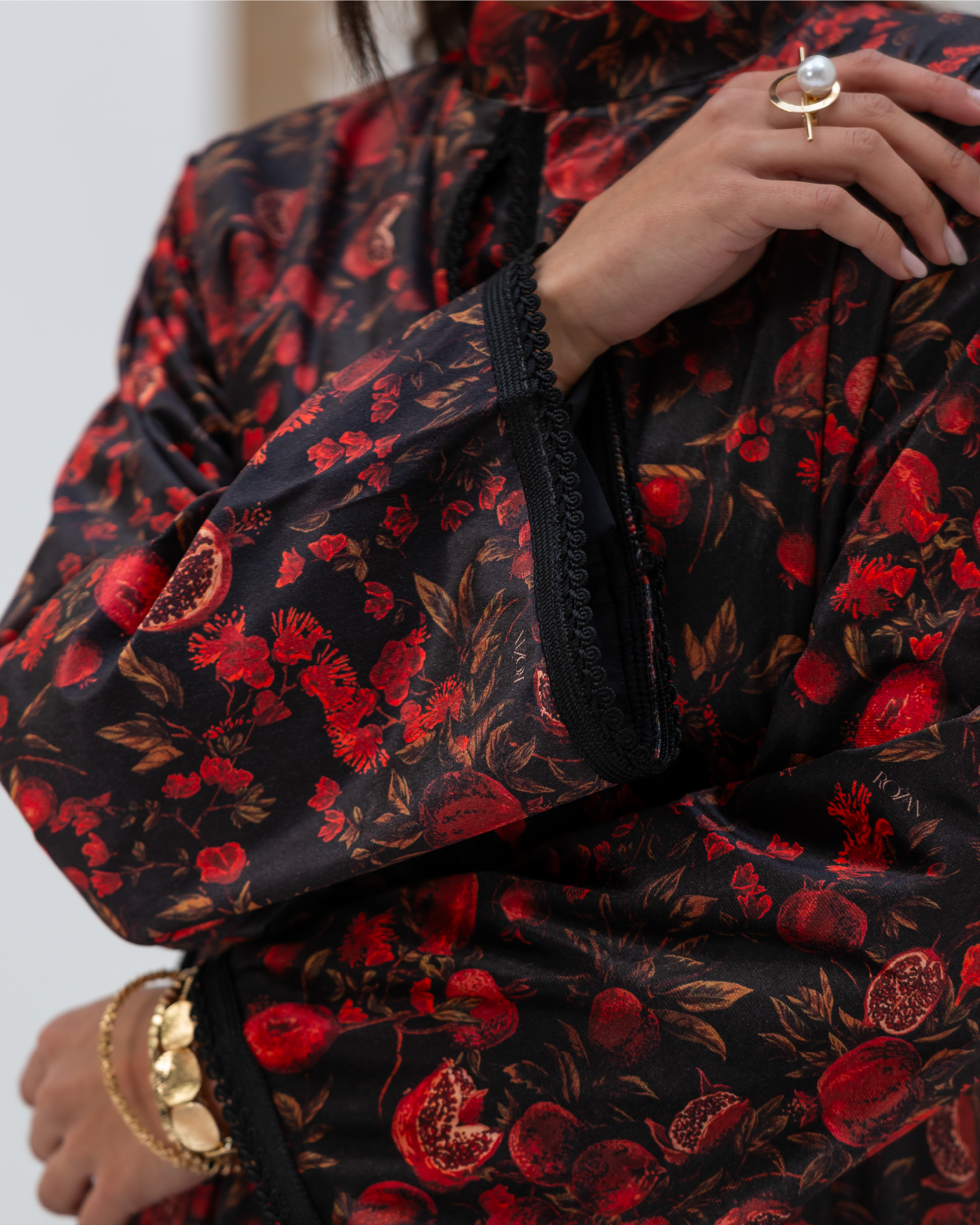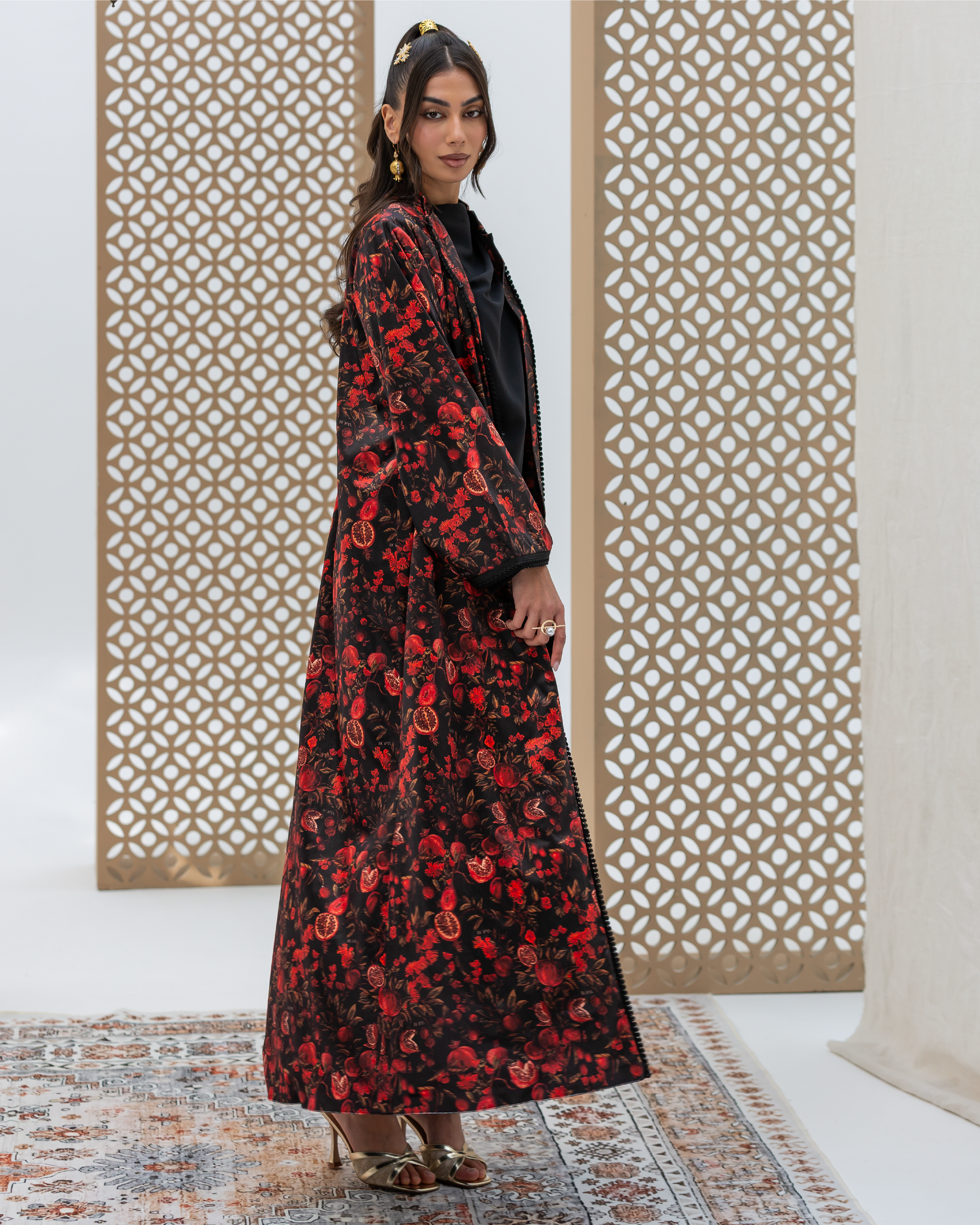 Jullanar Velvet Abaya Crafted from Stretchy Velvet Featuring an Exclusive Rozan Pomegranate Print. Fully Lined for a Refined Finish. Designed with a High Collar and Long Sleeves, Finished with Moroccan Lace Detailing Along the Front Opening and Sleeve Edges. Comes with Large Front Hooks for Optional Closure.