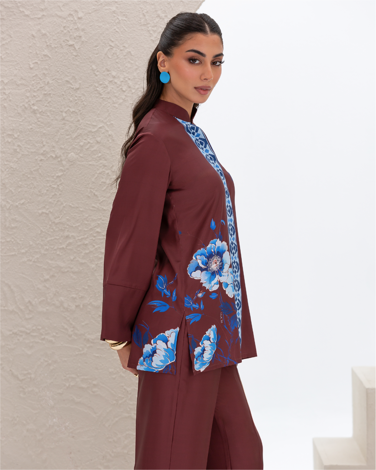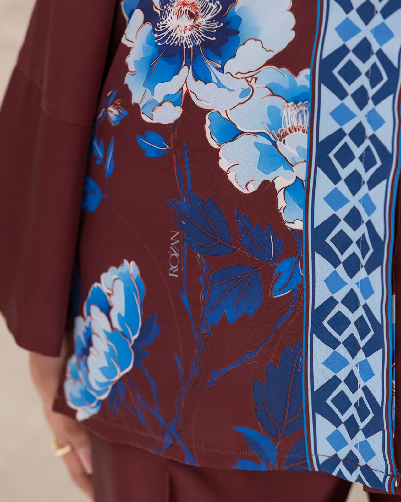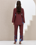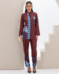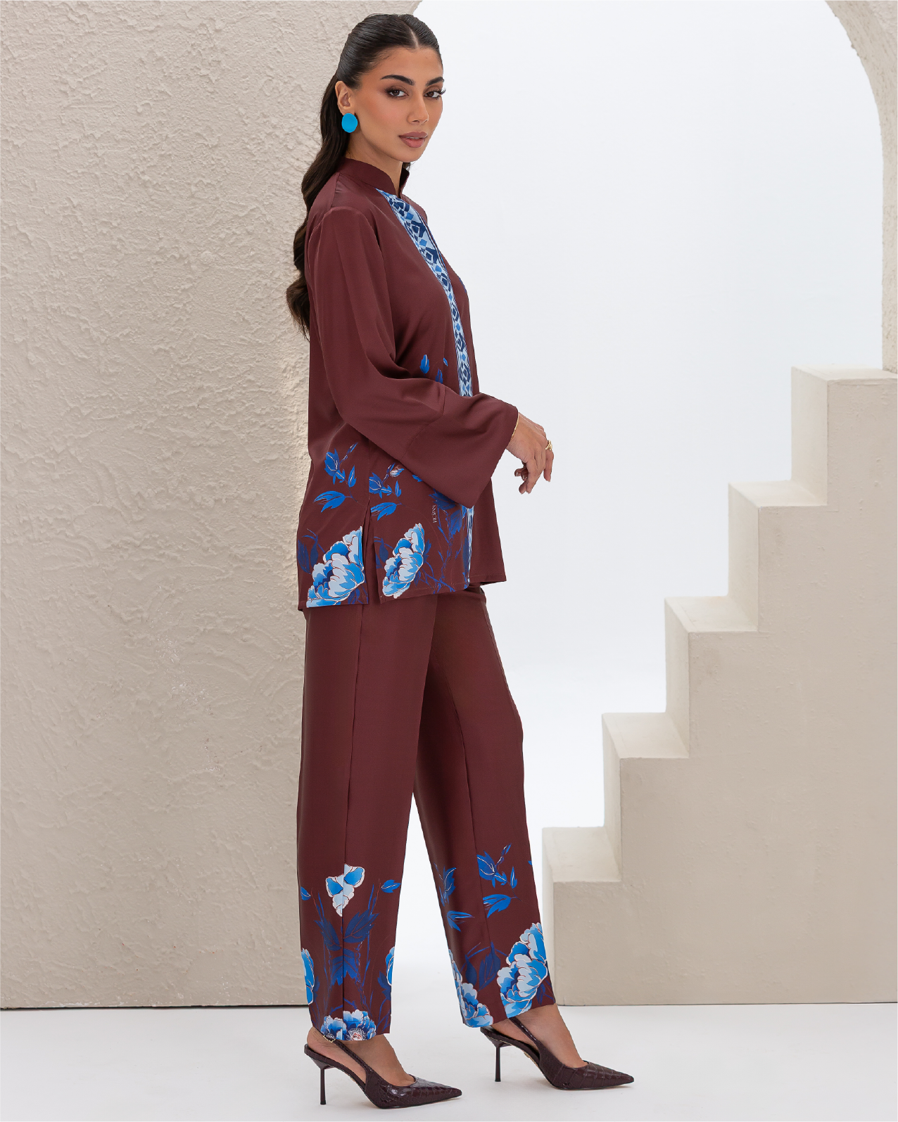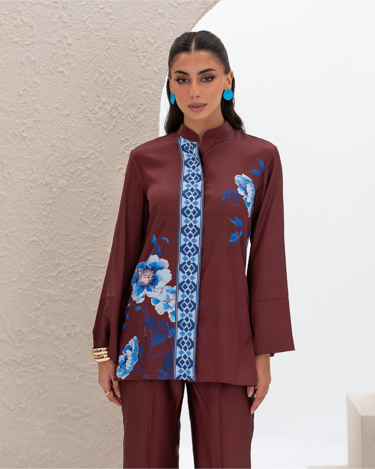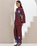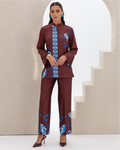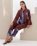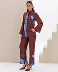 Armani Silk Set Featuring a Blue Floral Print on a Maroon Background, with a Loose-Fit Shirt Designed with a Printed Hidden Button Placket and Two Side Slits, Paired with Straight-Cut Elastic-Waist Pants with Pockets.