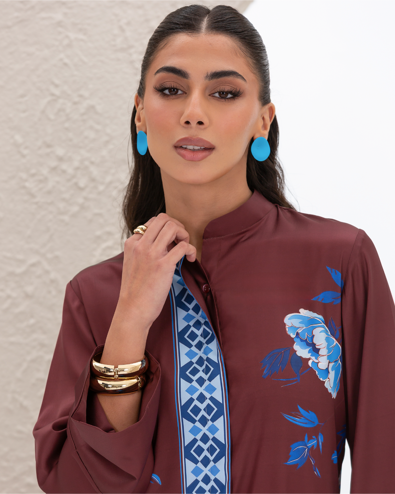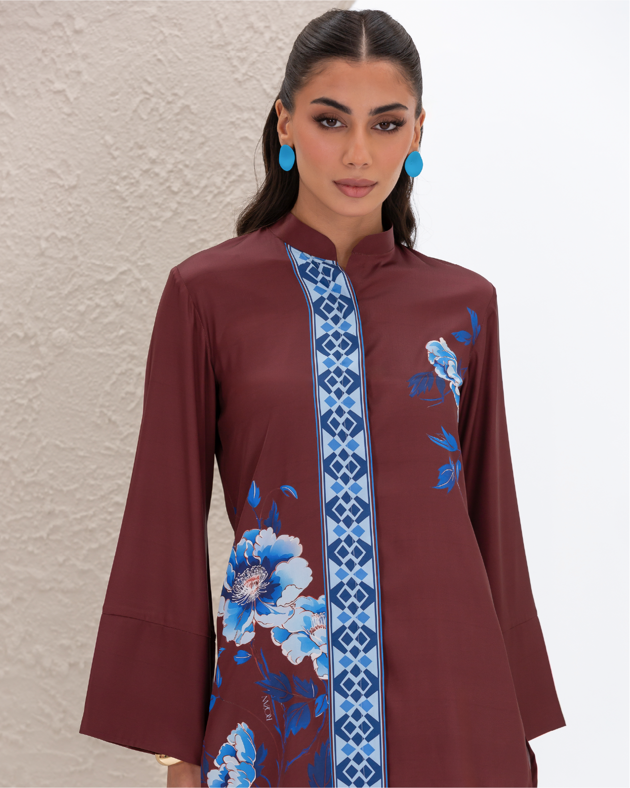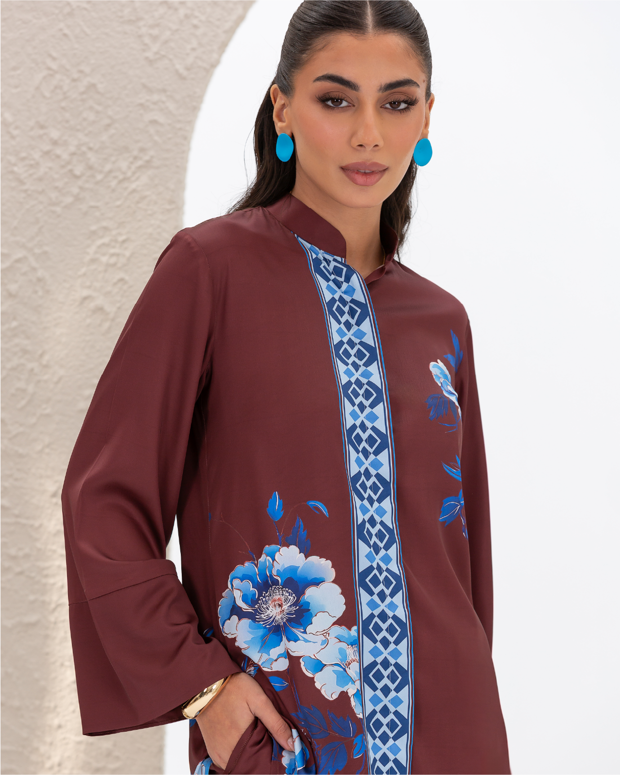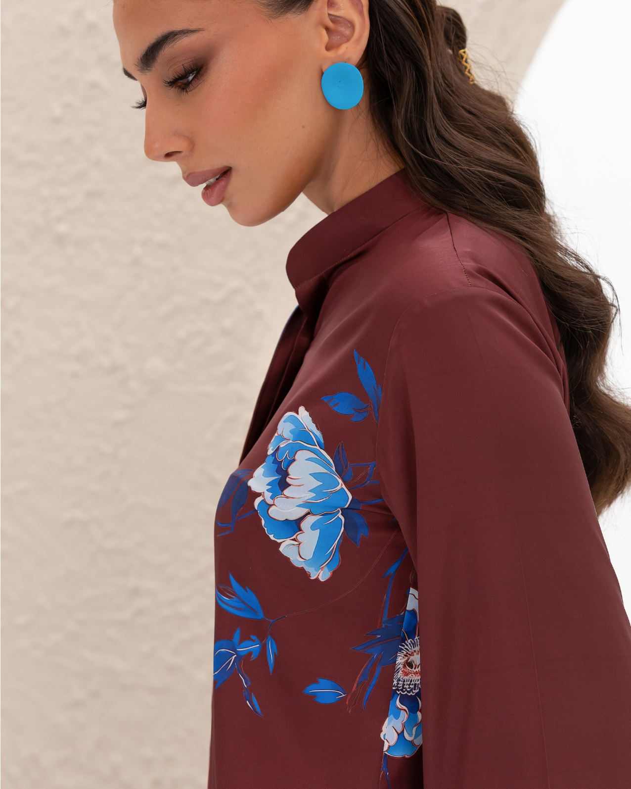 Armani Silk Set Featuring a Blue Floral Print on a Maroon Background, with a Loose-Fit Shirt Designed with a Printed Hidden Button Placket and Two Side Slits, Paired with Straight-Cut Elastic-Waist Pants with Pockets.