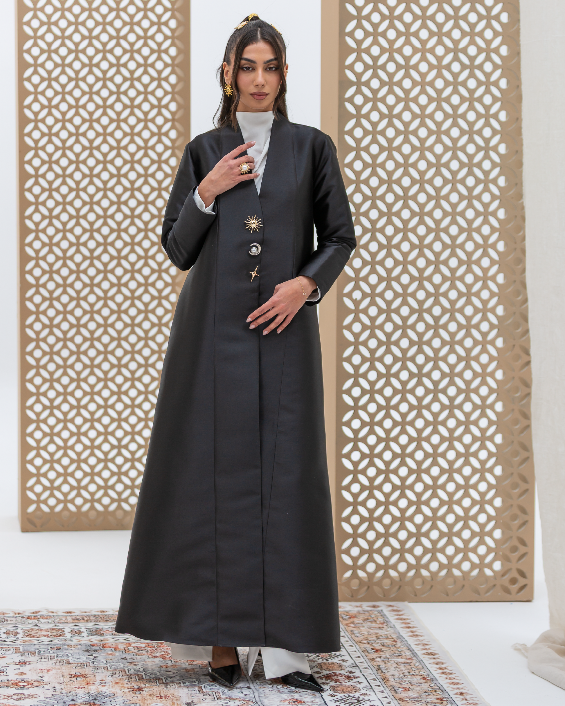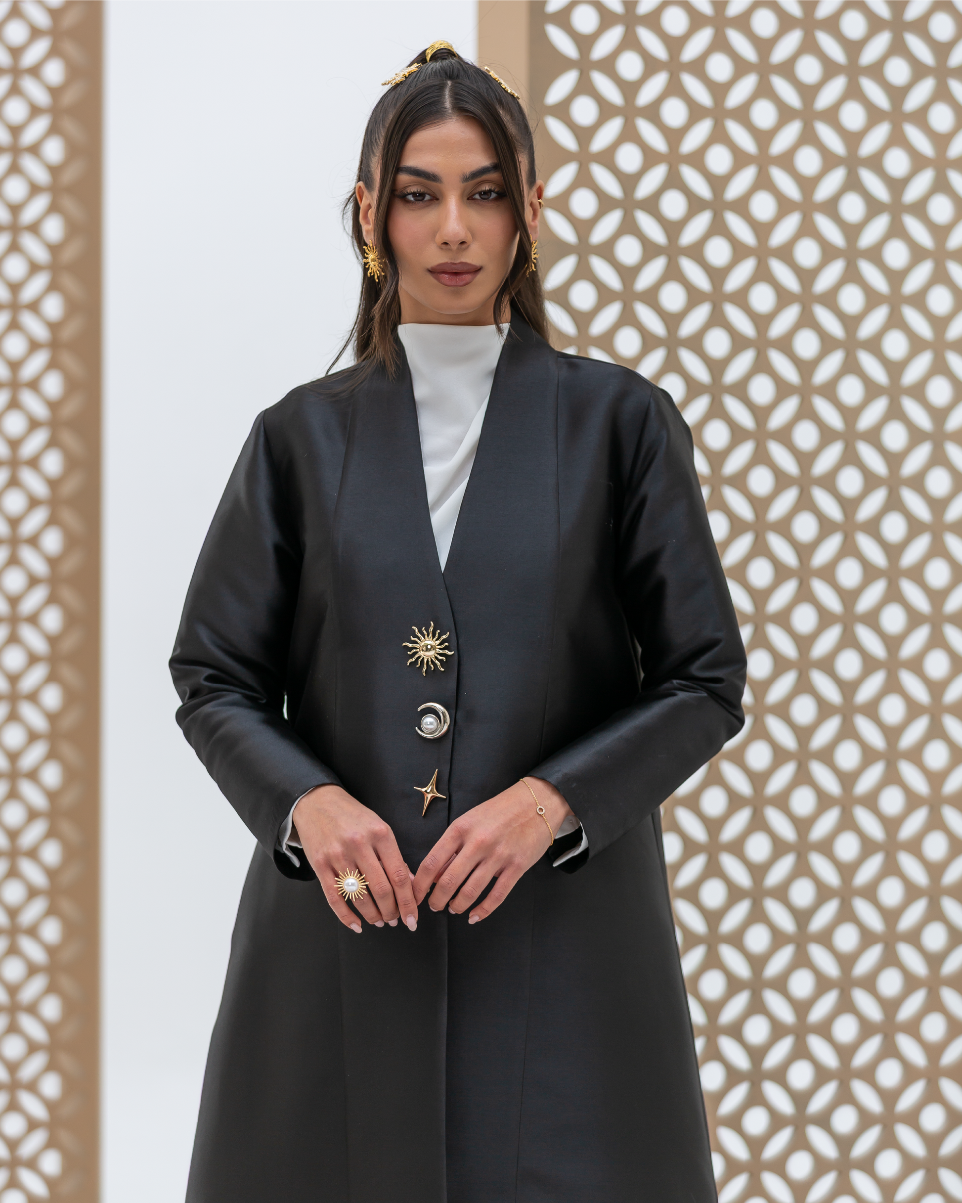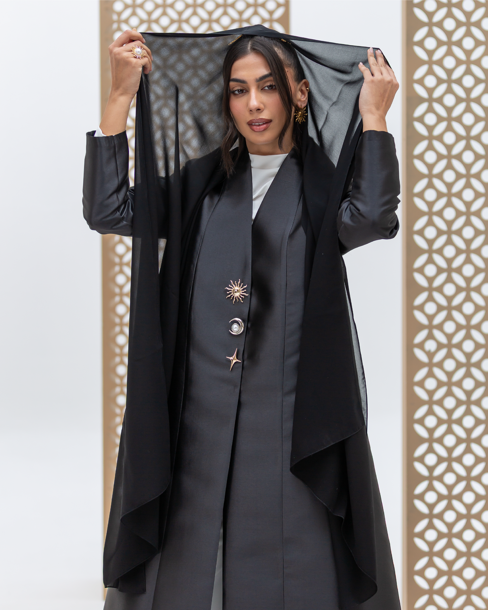 Black A-Line Mikado Blazer-Cut Abaya with Structured Panels, V-Neck Collar, and a Four Snap-Button Closure, Finished with Three Sun, Moon, and Star–Shaped Button Embellishments. Comes with Dujja Chiffon Hijab.