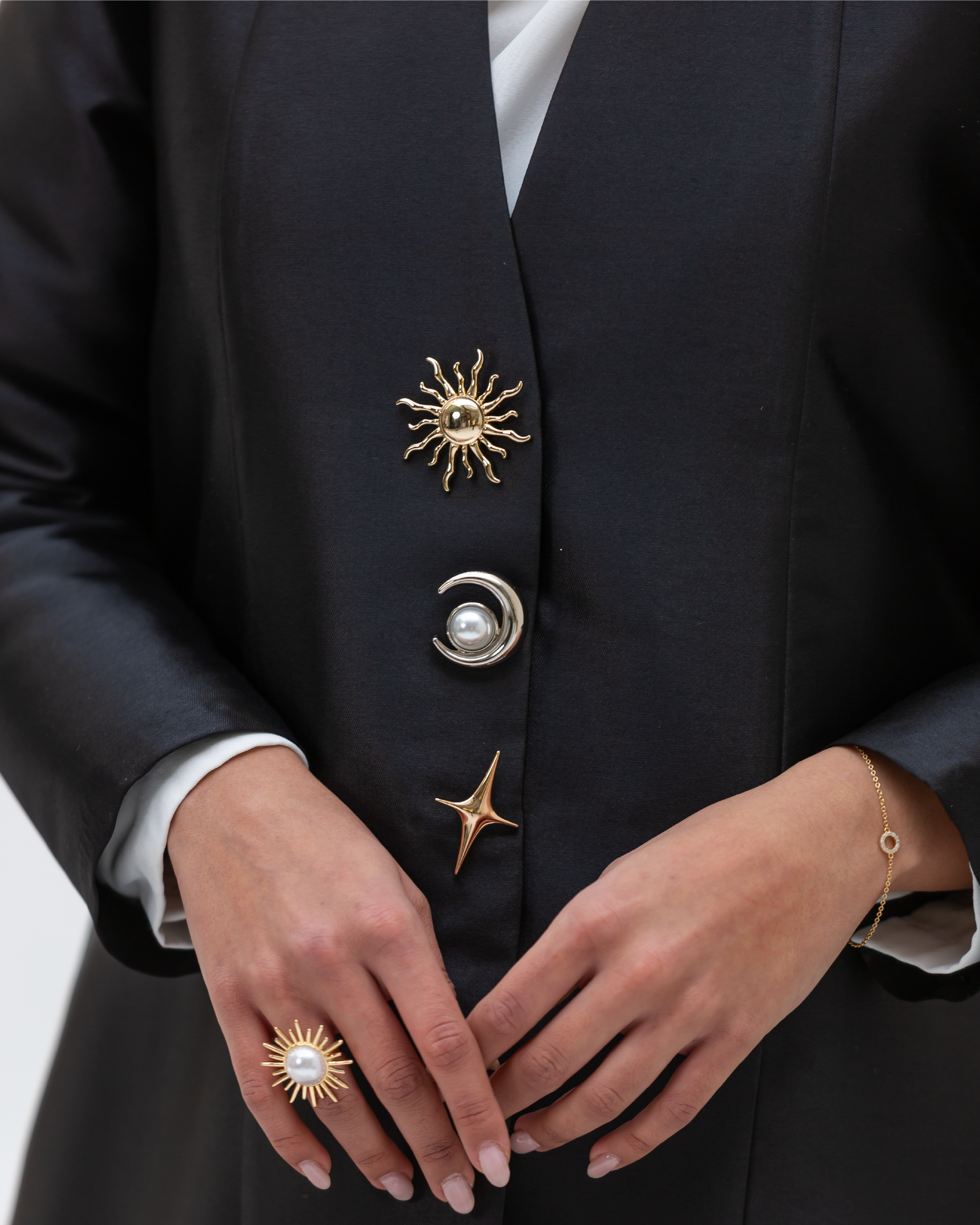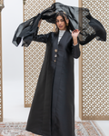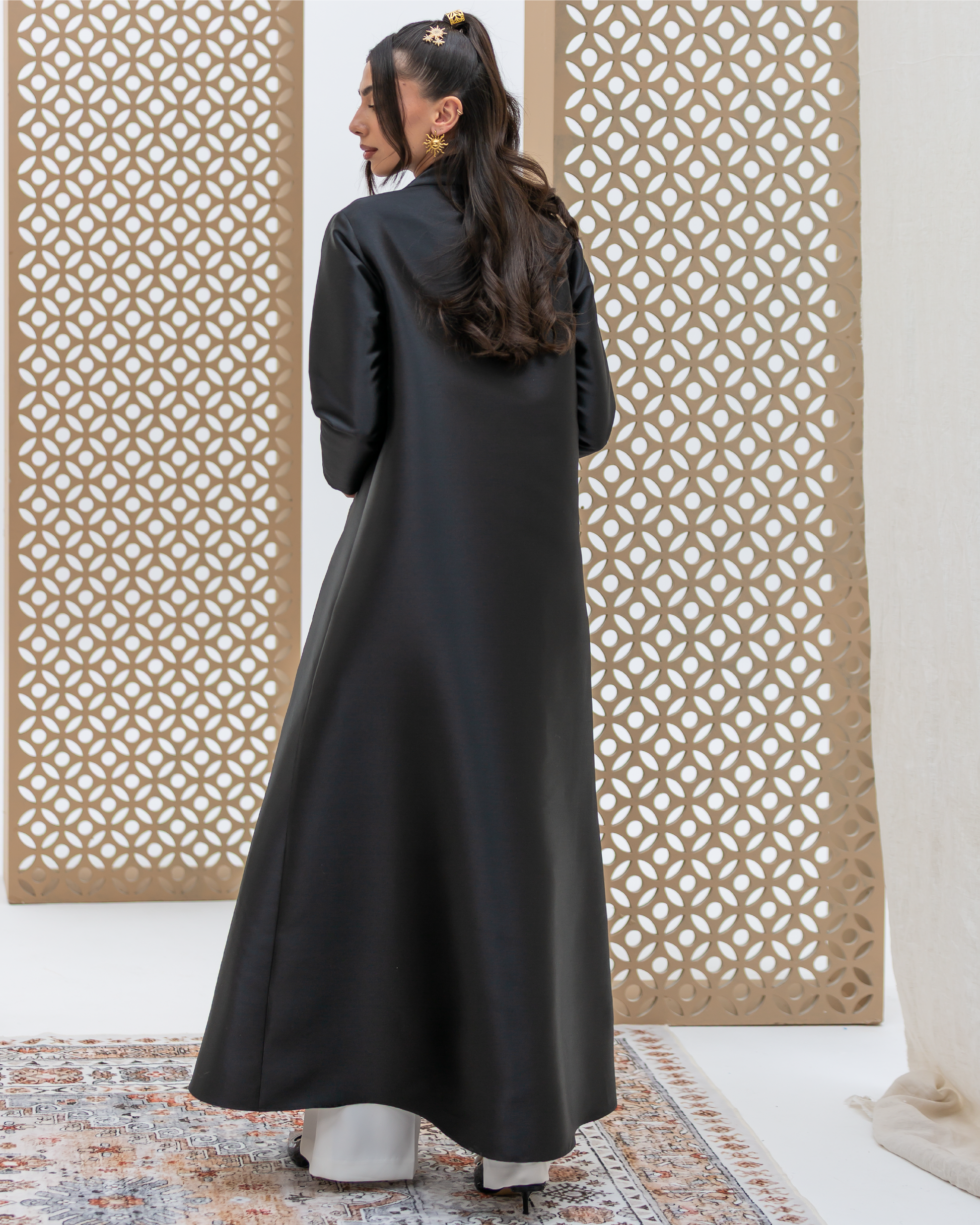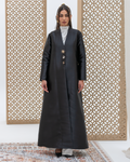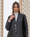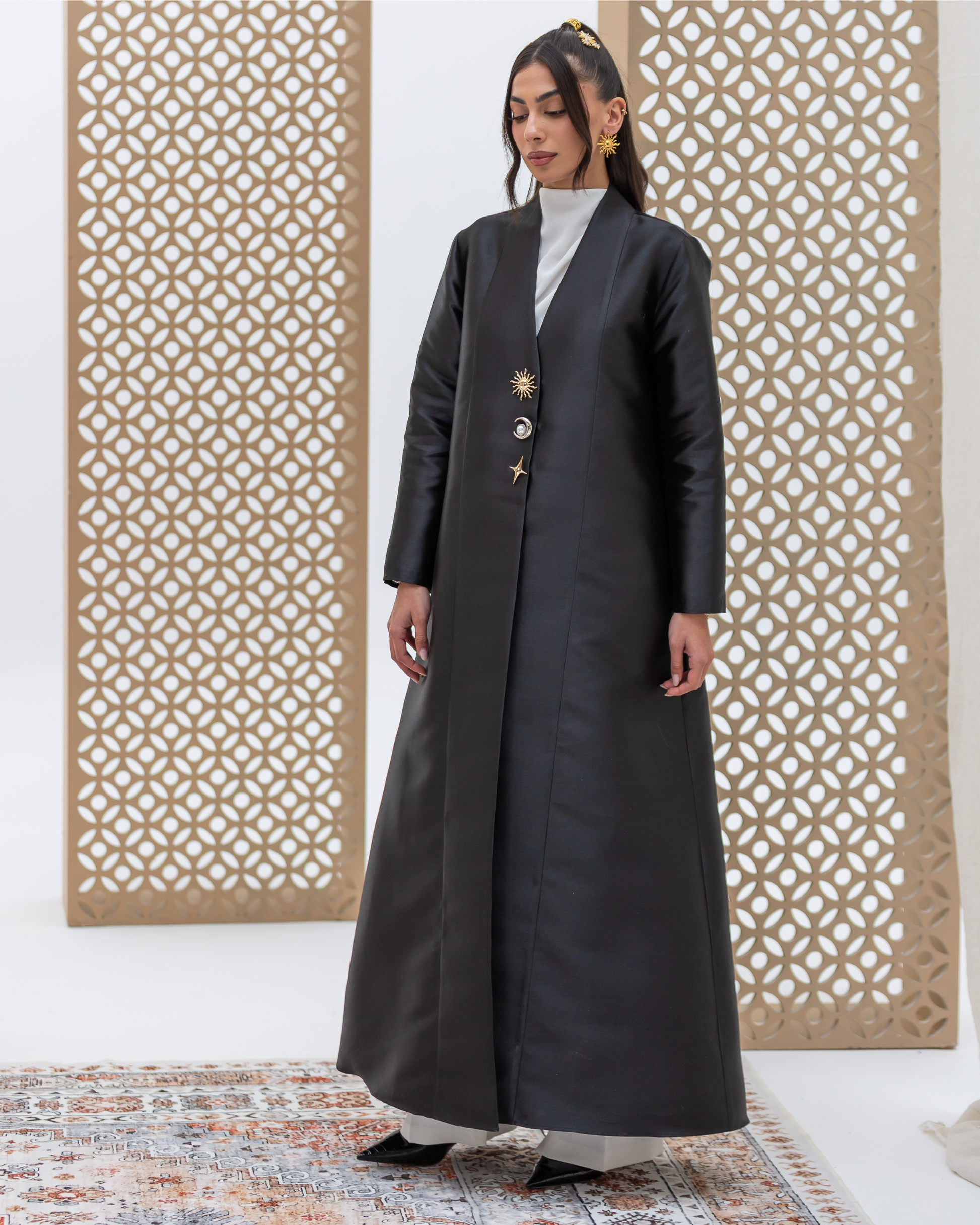 Black A-Line Mikado Blazer-Cut Abaya with Structured Panels, V-Neck Collar, and a Four Snap-Button Closure, Finished with Three Sun, Moon, and Star–Shaped Button Embellishments. Comes with Dujja Chiffon Hijab.