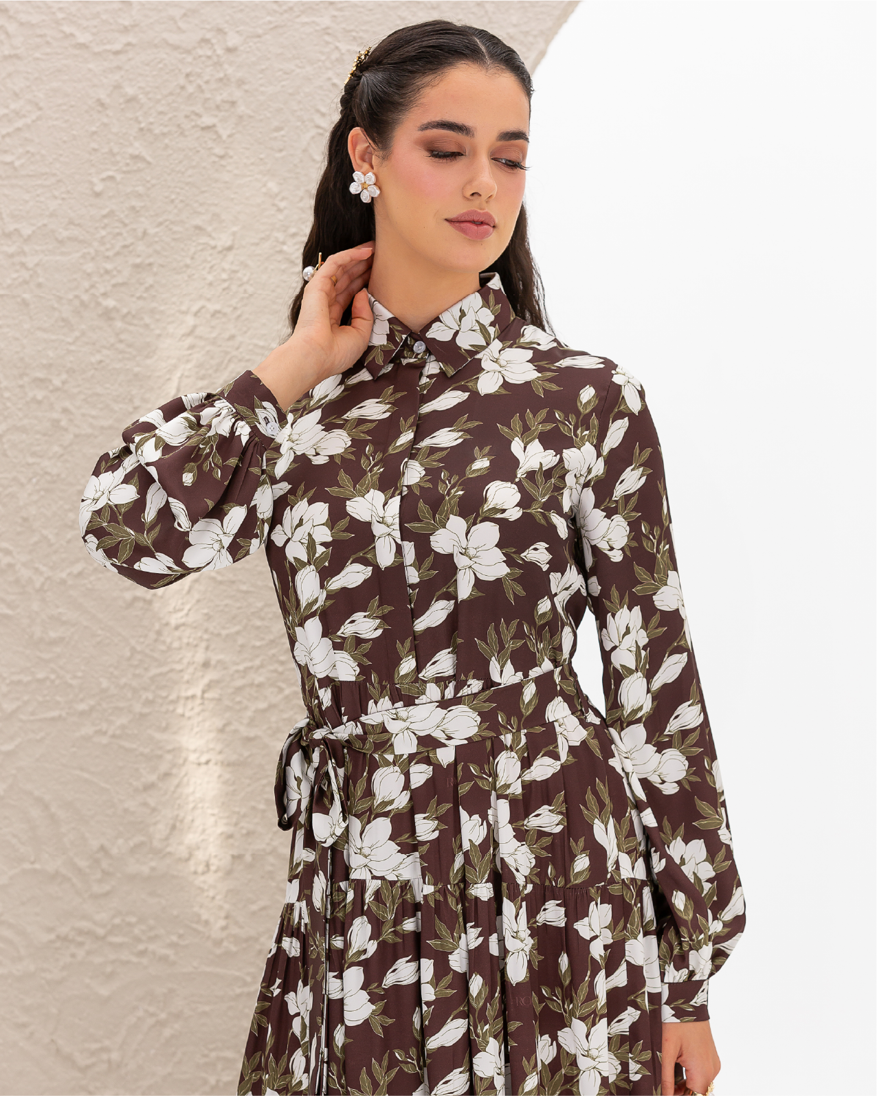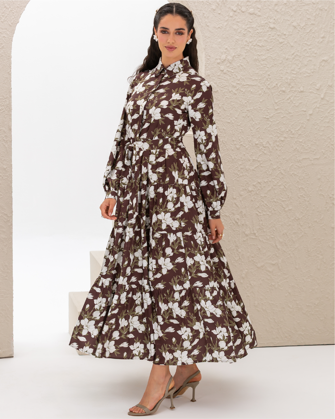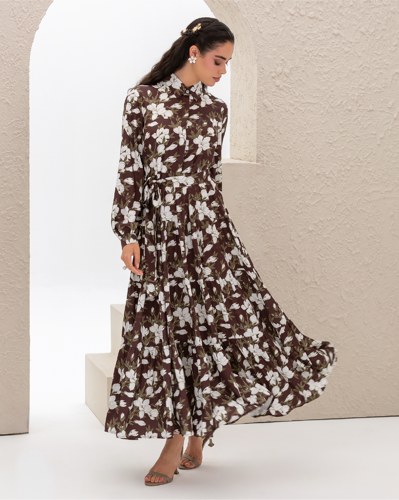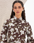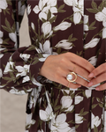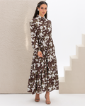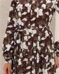 Armani Silk Magnolia Printed Flare Shirt Dress with Frilled Layers and Elastic Cuffs. Comes with its own belt.