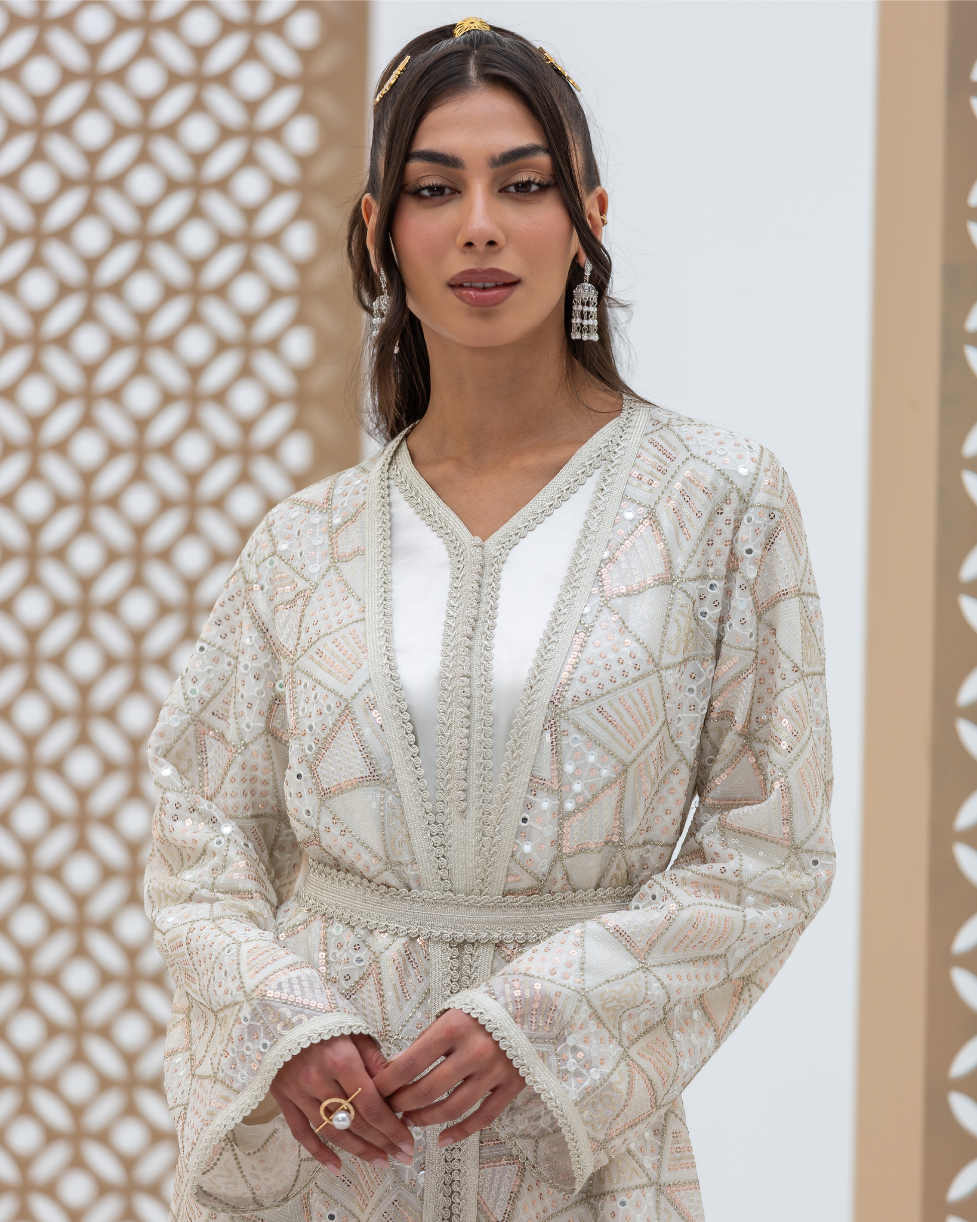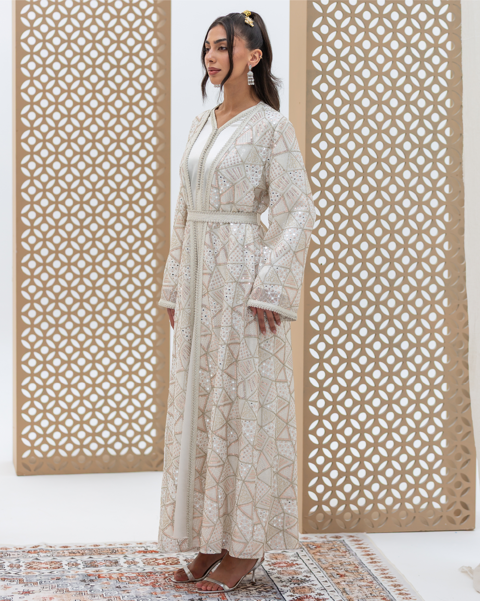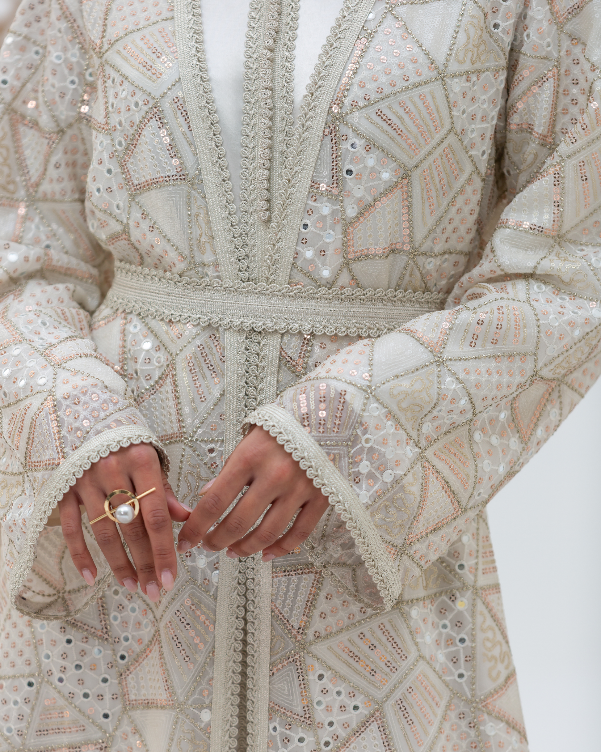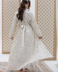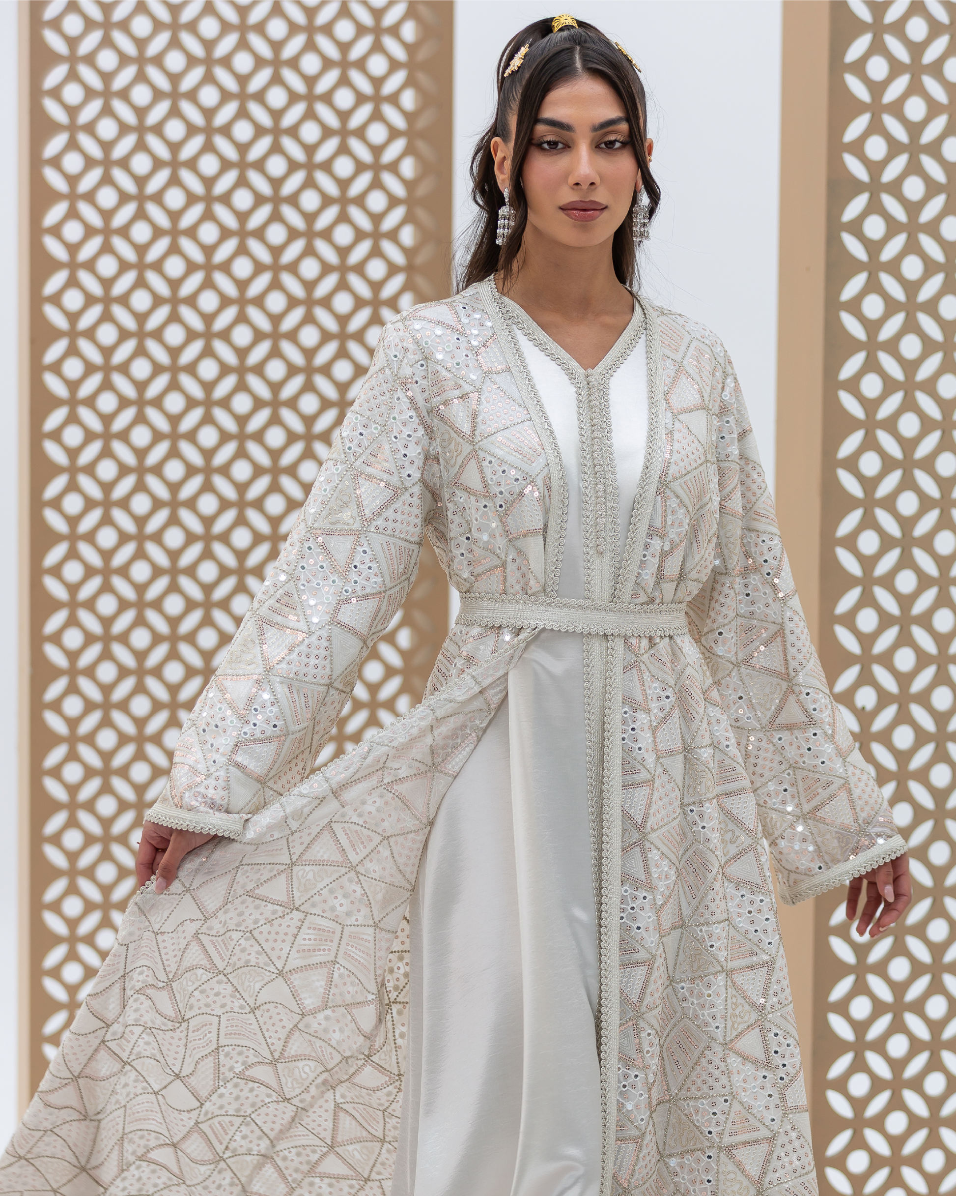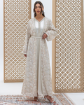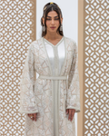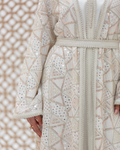 White Mira Kaftan Crafted from Embellished Mirror Chiffon Featuring Geometric Sequined Intricate All-Over Embroidery. Designed as a Flowing Outer Kaftan with Full-Length Sleeves and a Soft, Fluid Silhouette. Comes with a Coordinated Full-Sleeve Inner Dress Designed with a V-Neck, Finished with Moroccan Lace Detailing Along the Sleeves and Accented with Traditional Moroccan Aqad Hand-Loop Buttons Along the Front