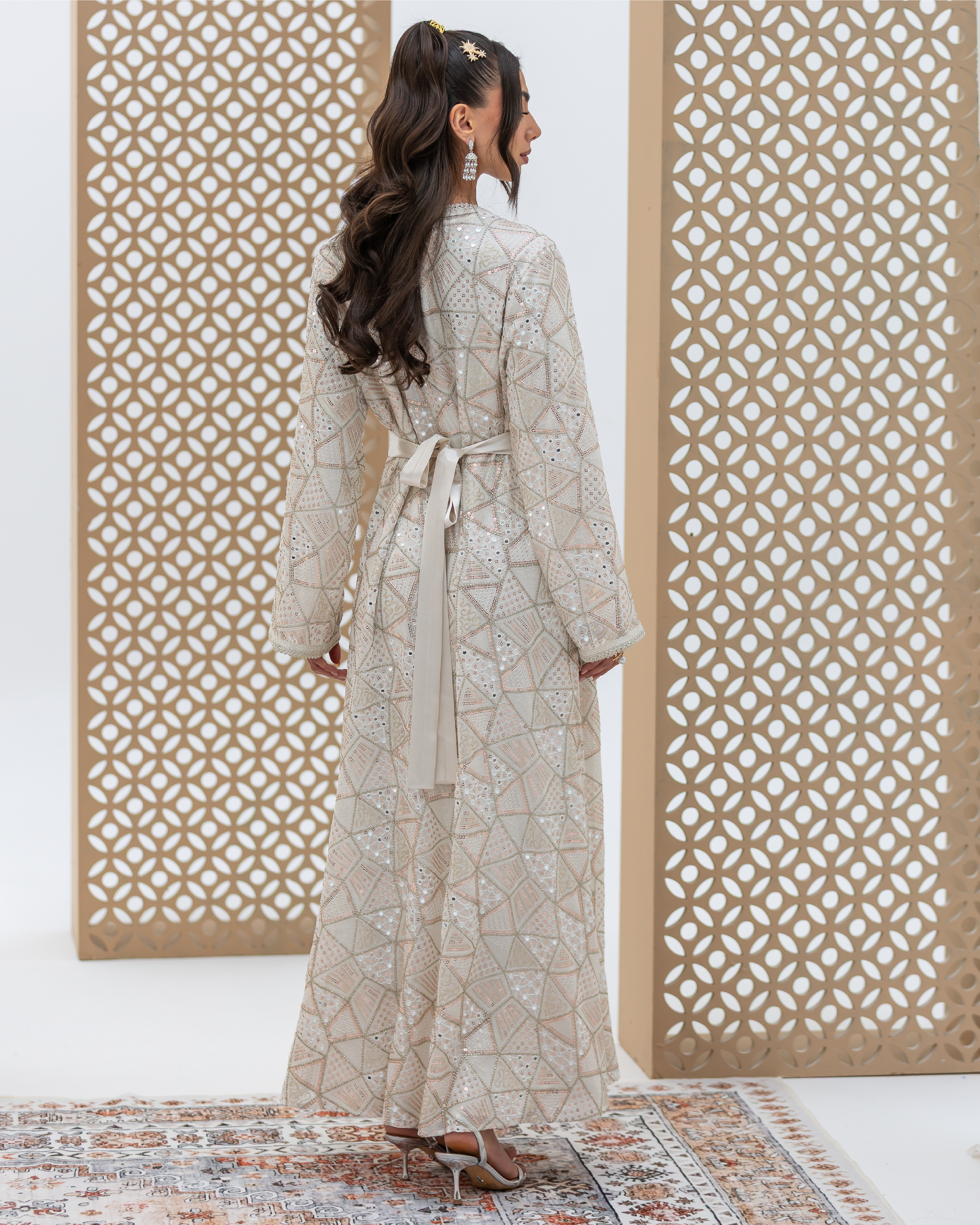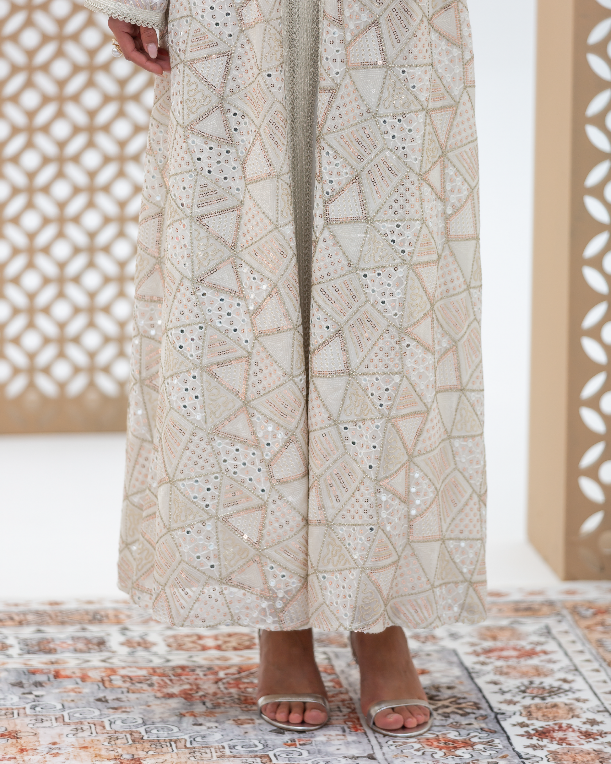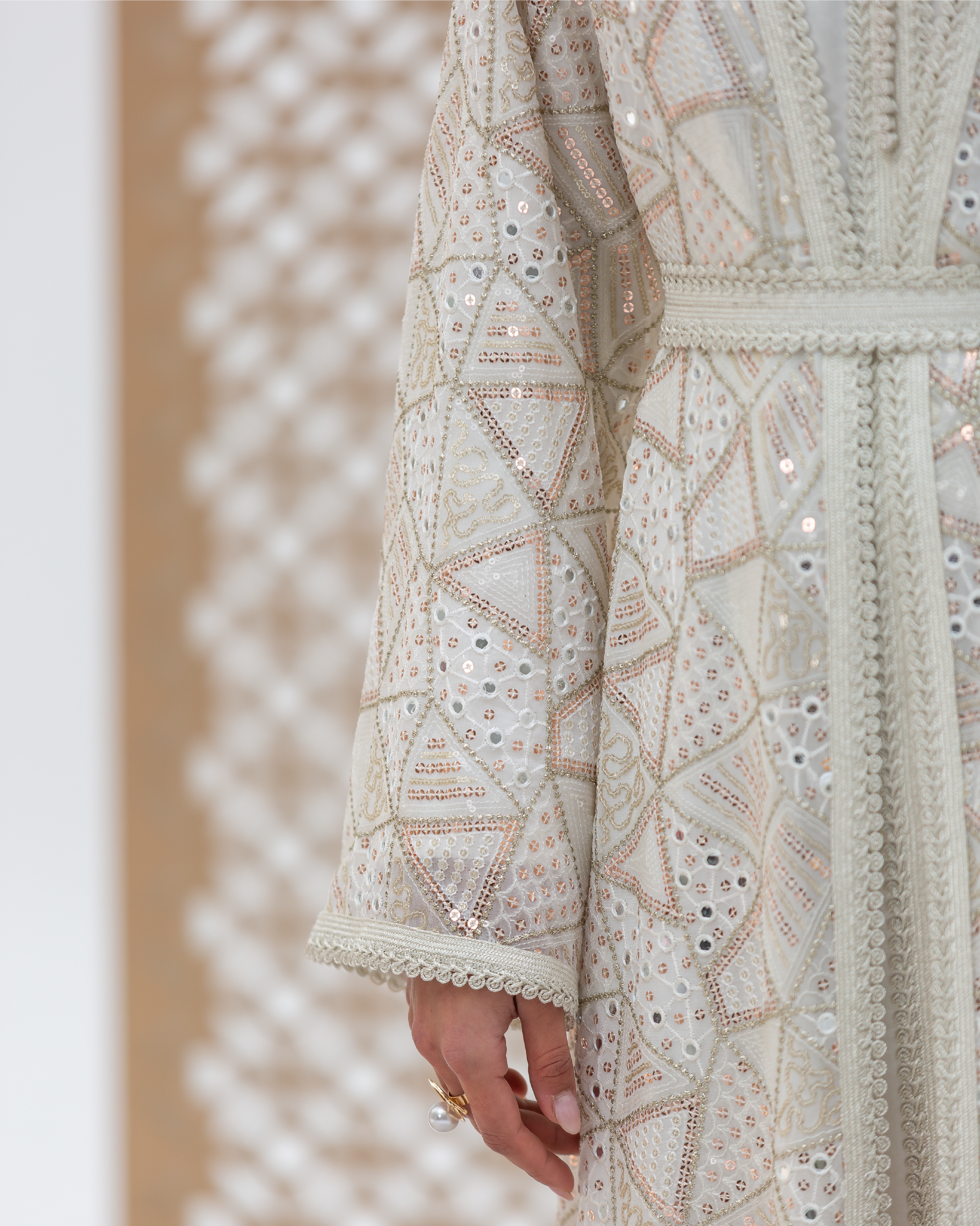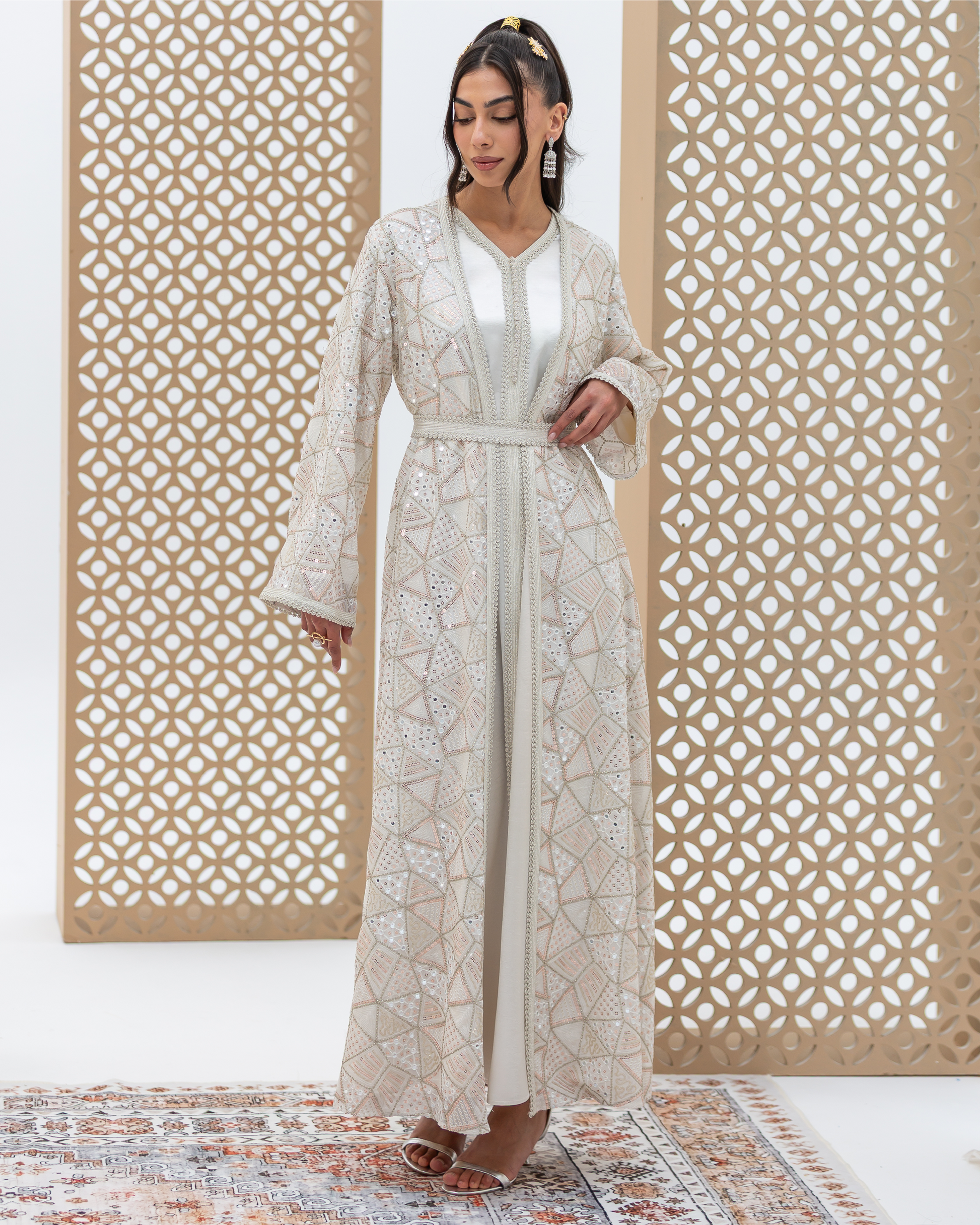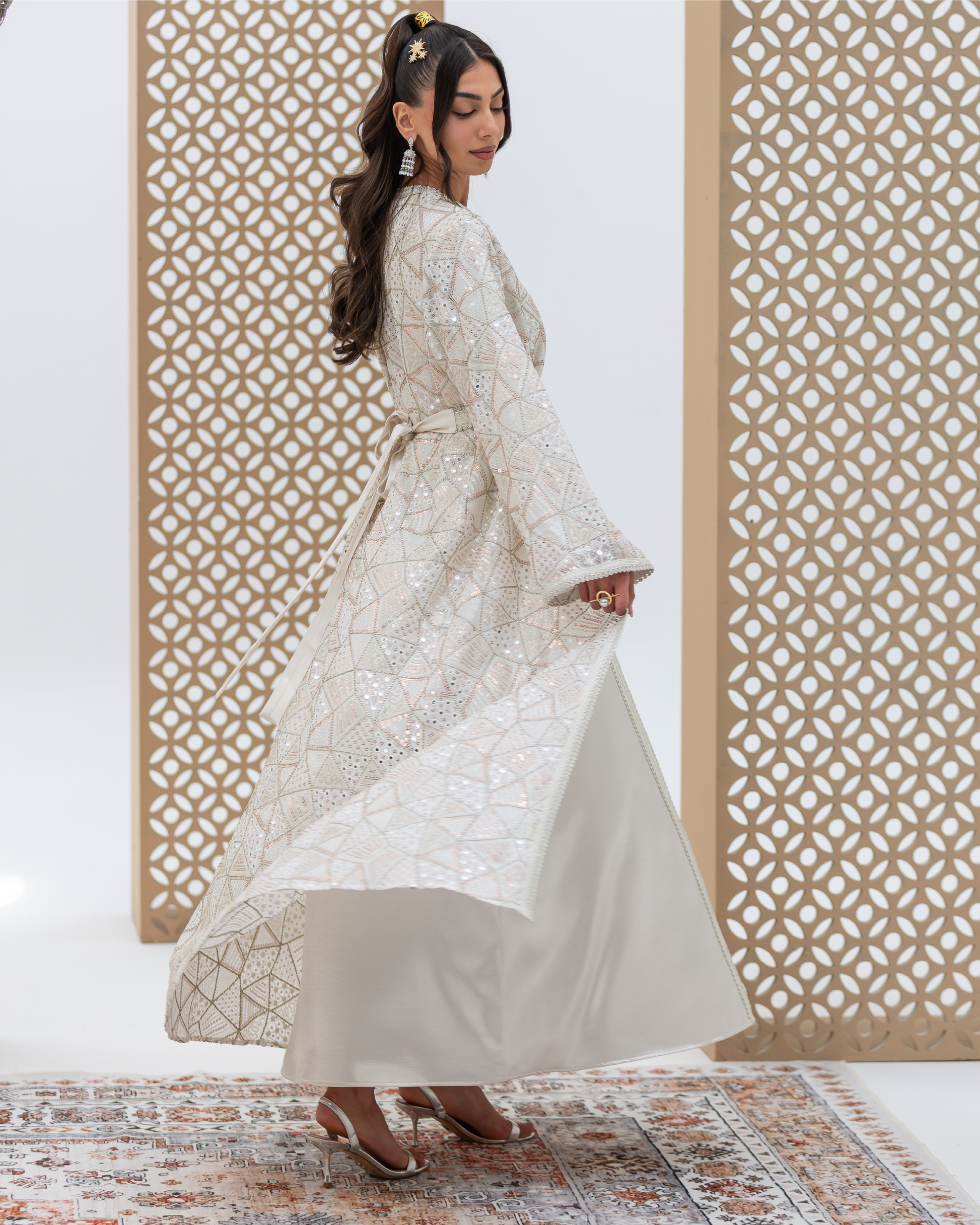 White Mira Kaftan Crafted from Embellished Mirror Chiffon Featuring Geometric Sequined Intricate All-Over Embroidery. Designed as a Flowing Outer Kaftan with Full-Length Sleeves and a Soft, Fluid Silhouette. Comes with a Coordinated Full-Sleeve Inner Dress Designed with a V-Neck, Finished with Moroccan Lace Detailing Along the Sleeves and Accented with Traditional Moroccan Aqad Hand-Loop Buttons Along the Front