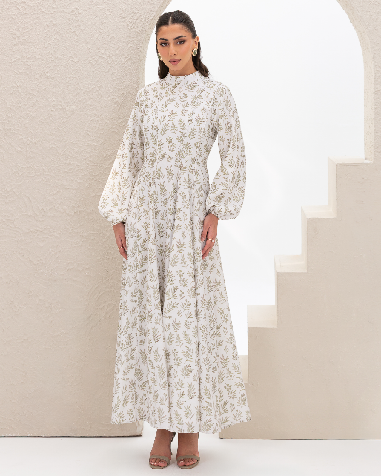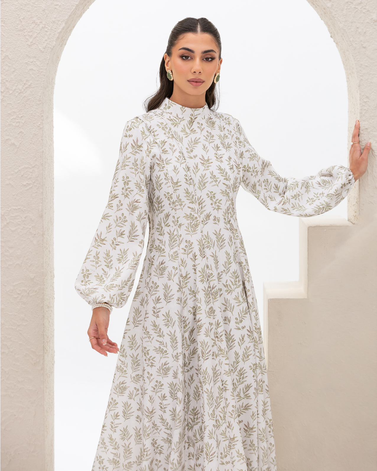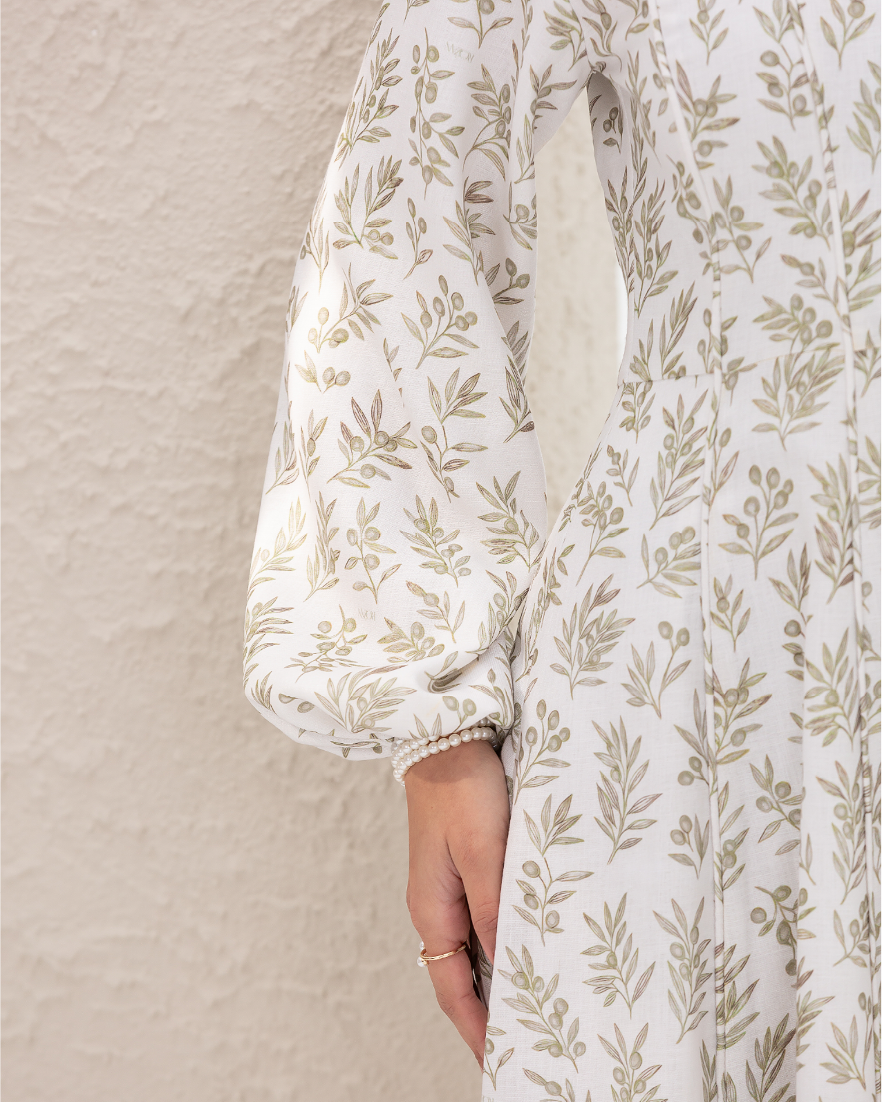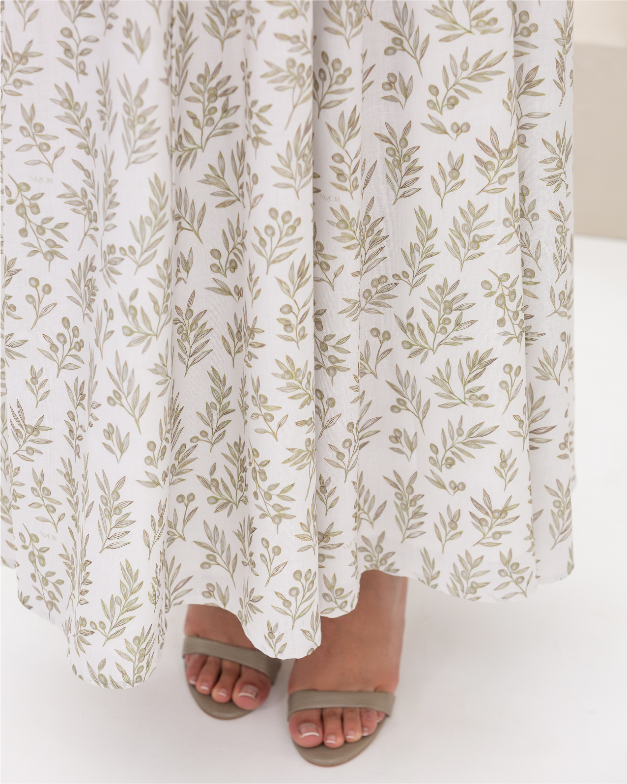 Flare Dress in Olive Branches Printed Cotton Linen Blend, Fully Lined Featuring Balloon Sleeves, Fitted Bodice with Multiple Panels Outlined in Fabric Piping and a Concealed Back Zipper