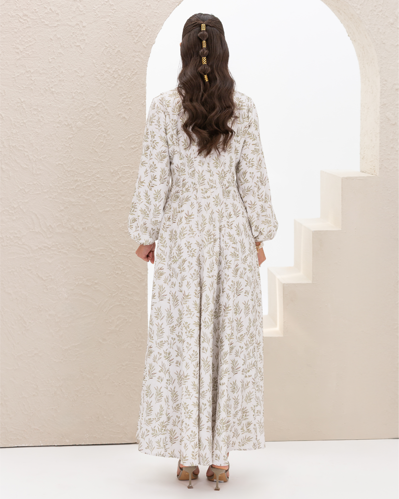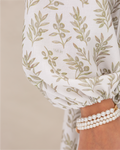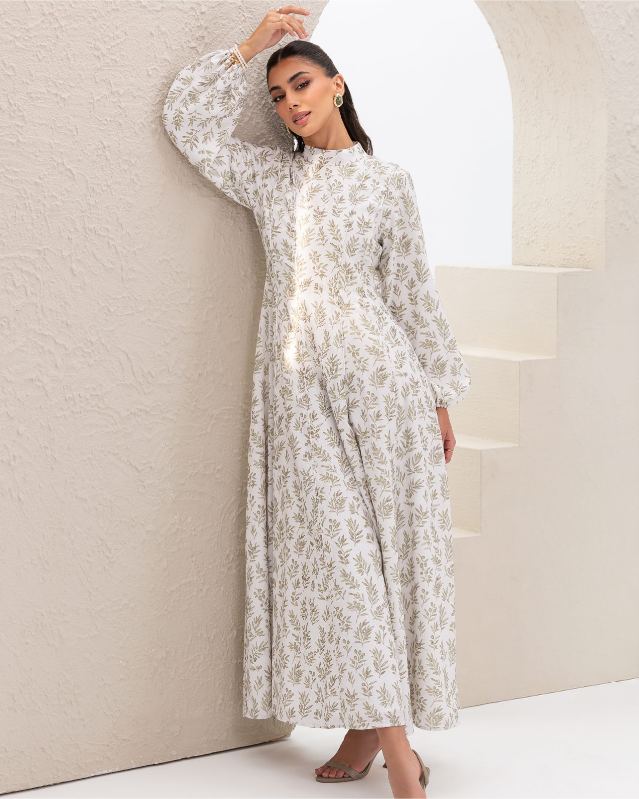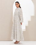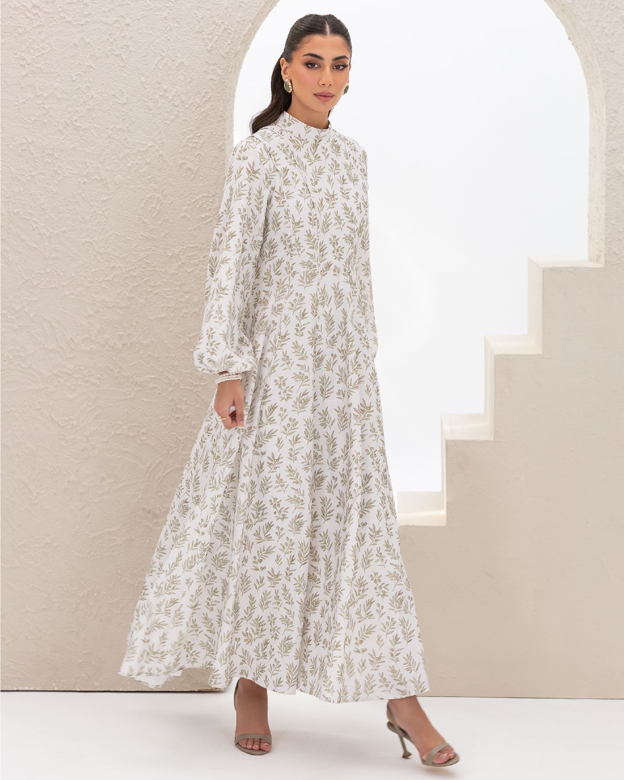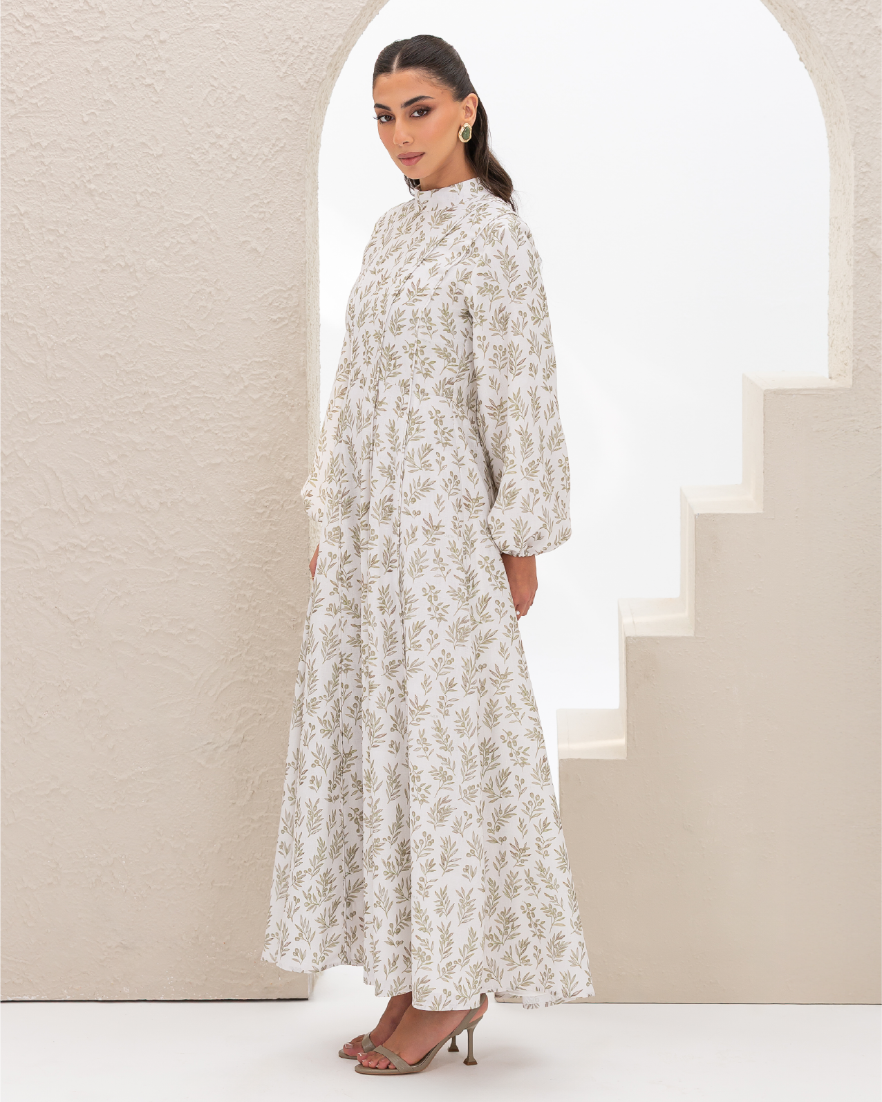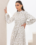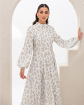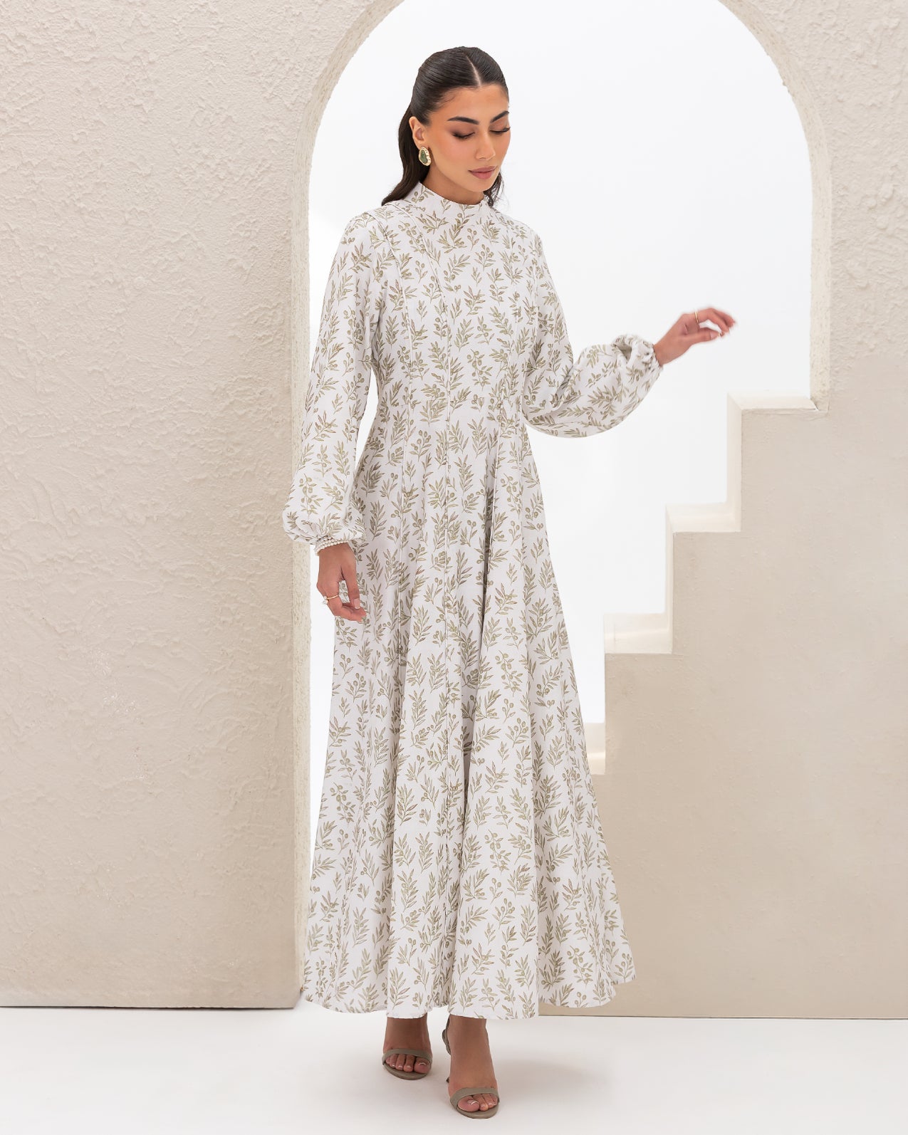 Flare Dress in Olive Branches Printed Cotton Linen Blend, Fully Lined Featuring Balloon Sleeves, Fitted Bodice with Multiple Panels Outlined in Fabric Piping and a Concealed Back Zipper