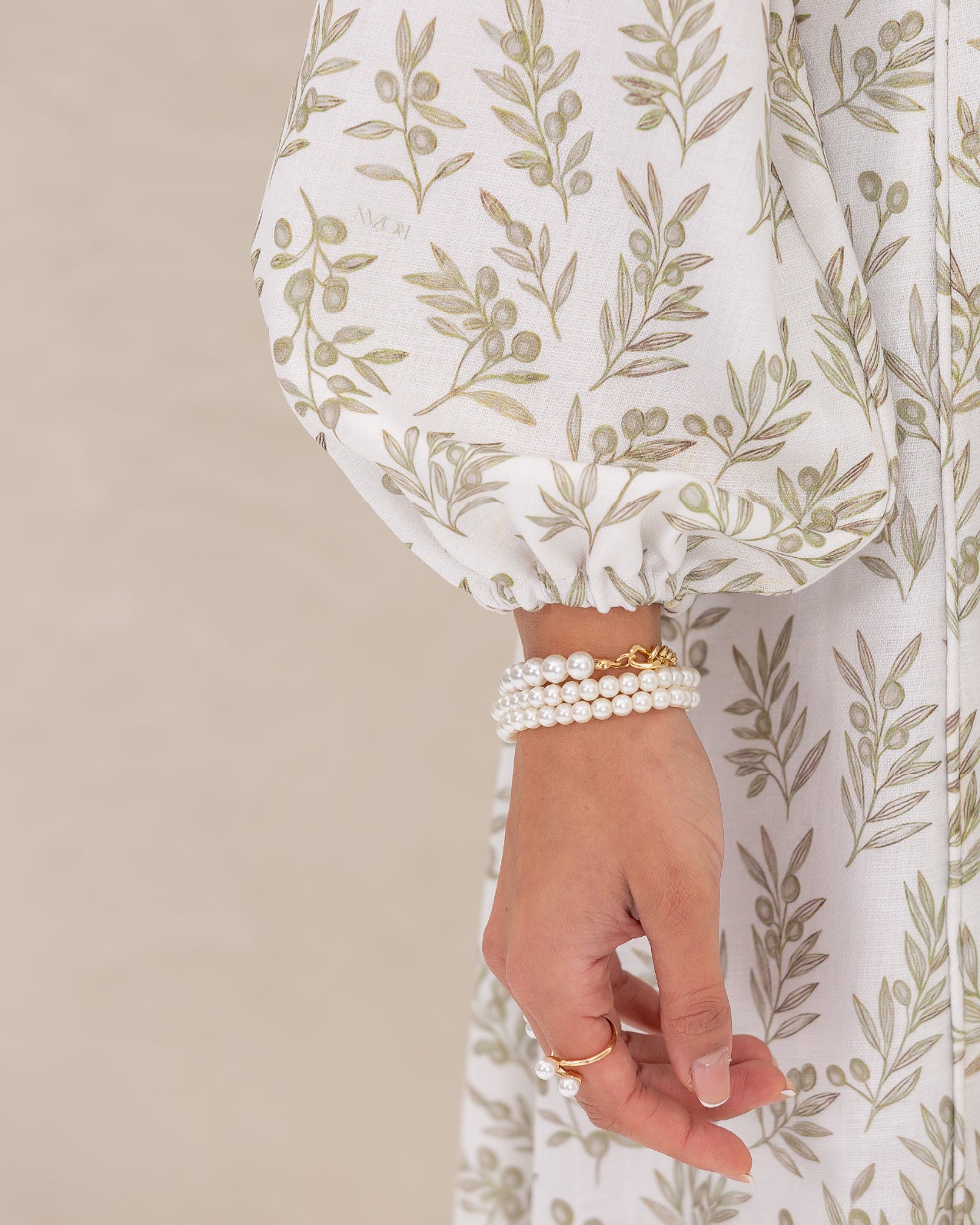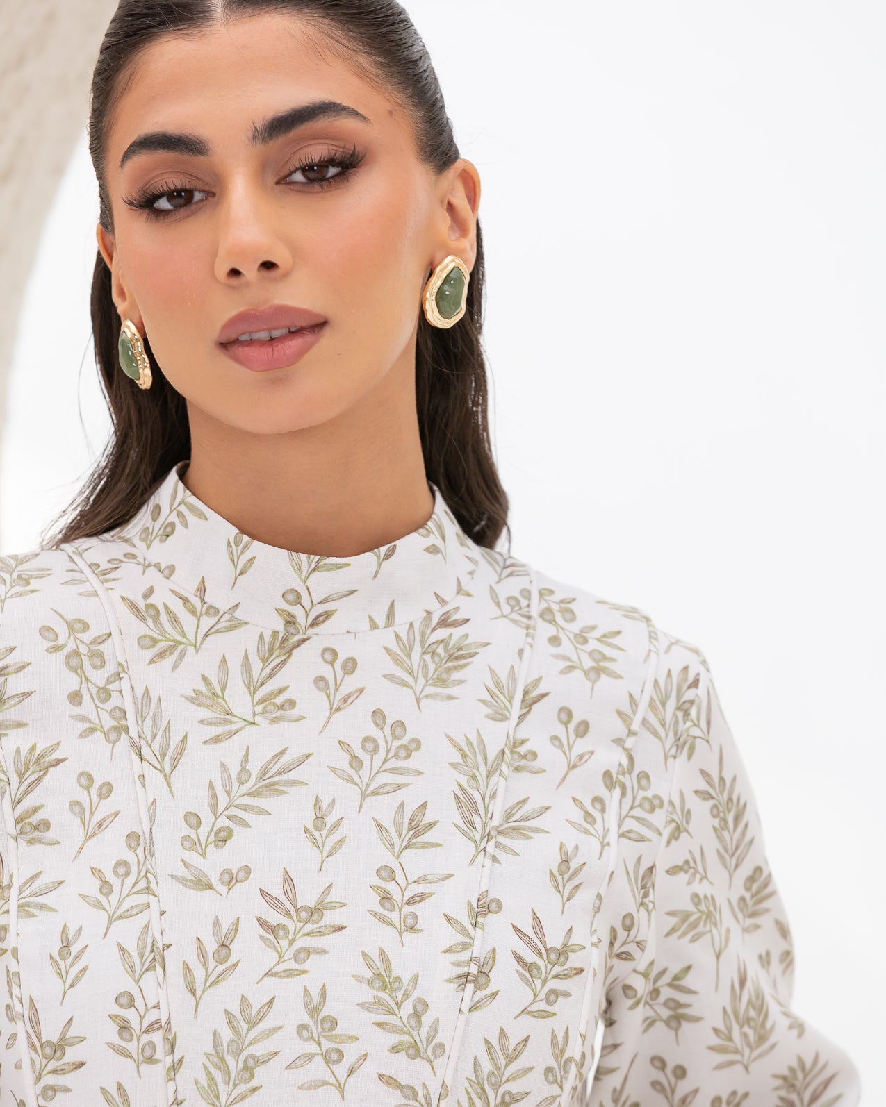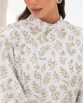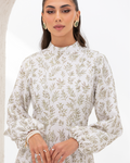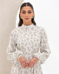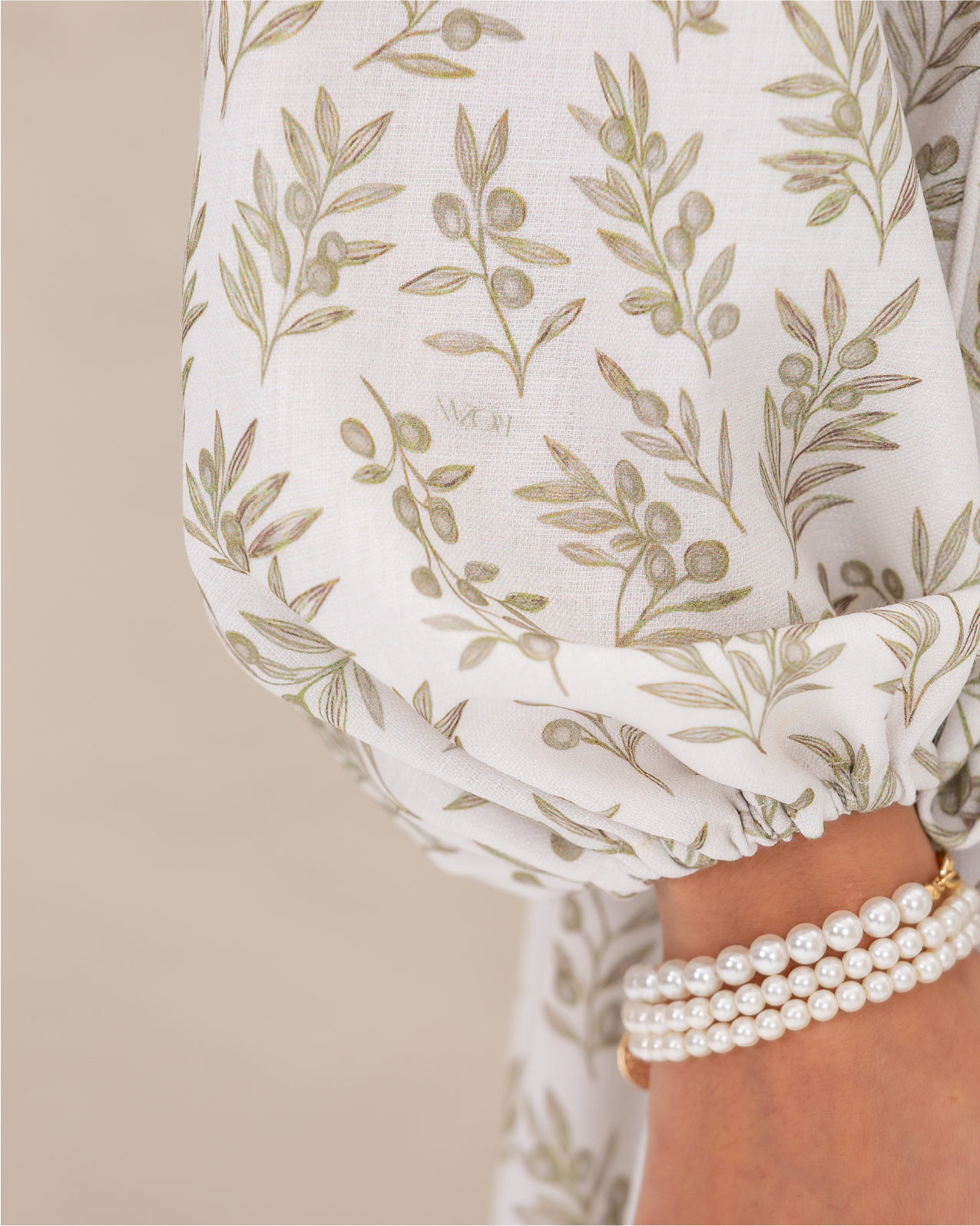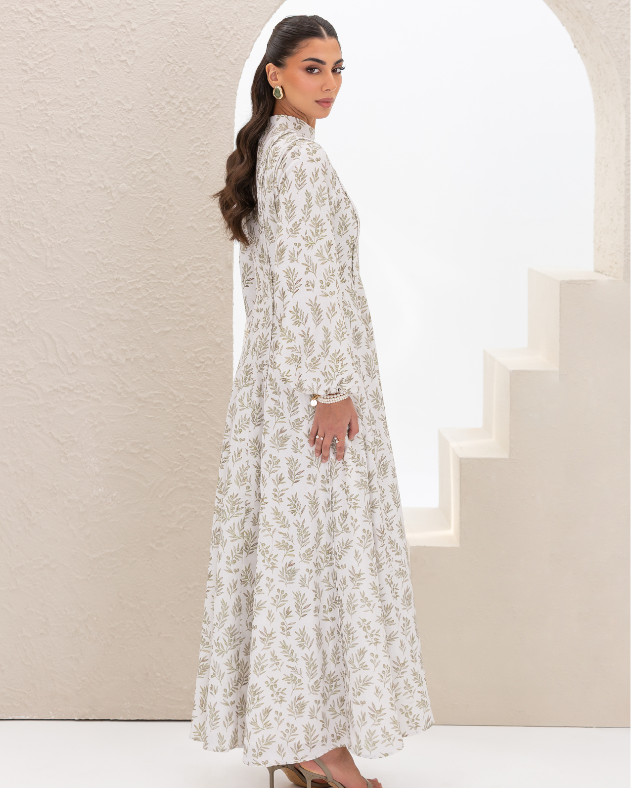 Flare Dress in Olive Branches Printed Cotton Linen Blend, Fully Lined Featuring Balloon Sleeves, Fitted Bodice with Multiple Panels Outlined in Fabric Piping and a Concealed Back Zipper