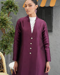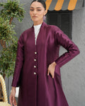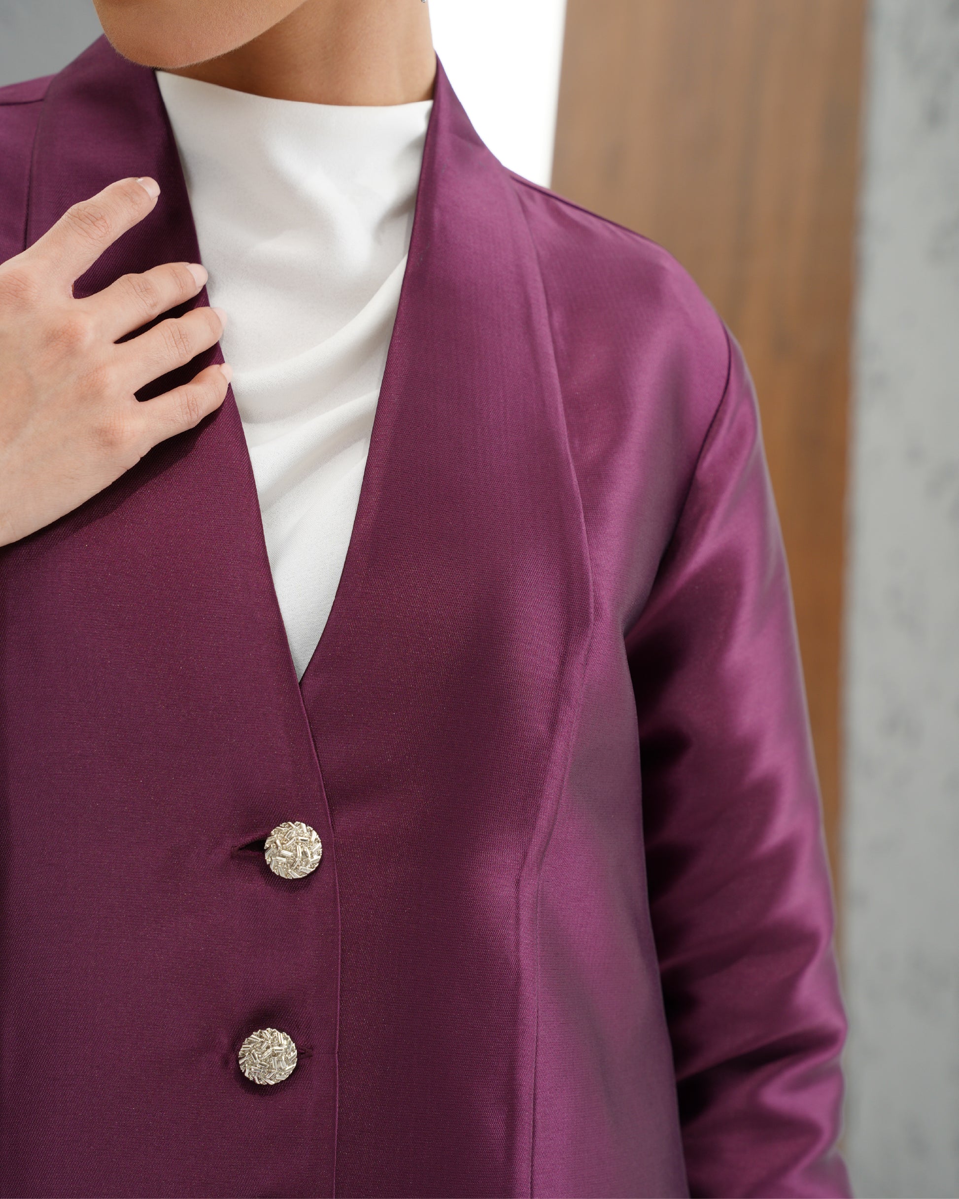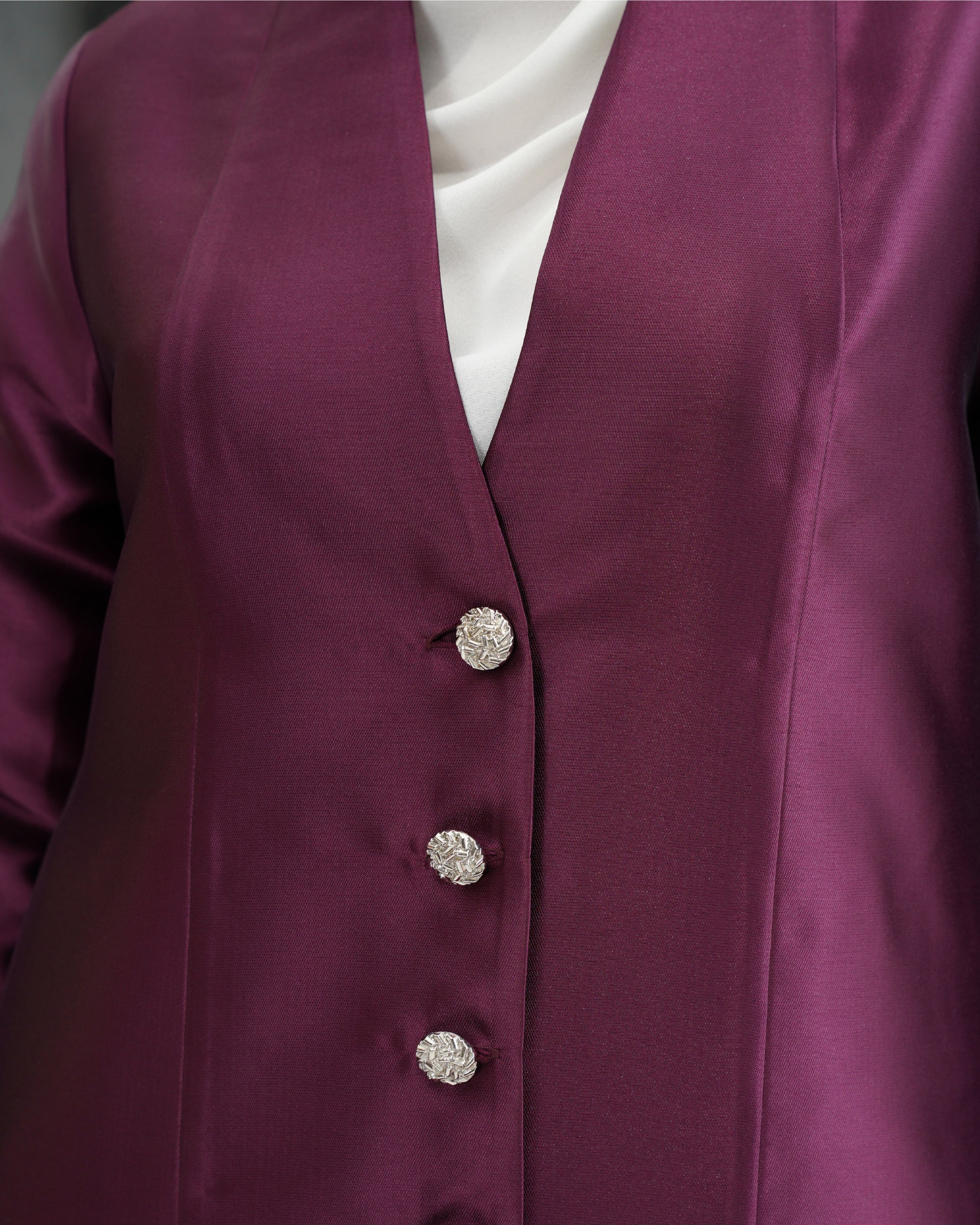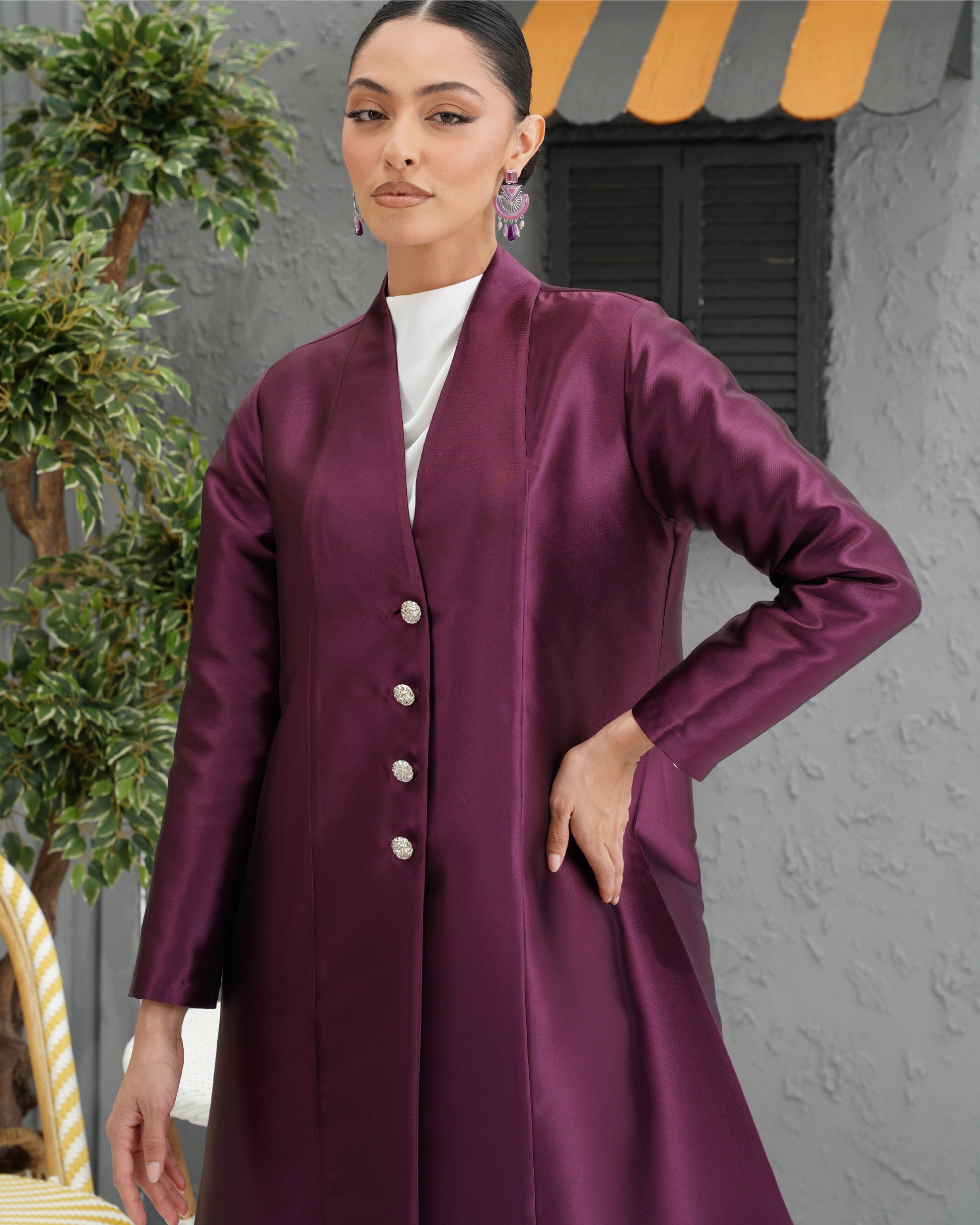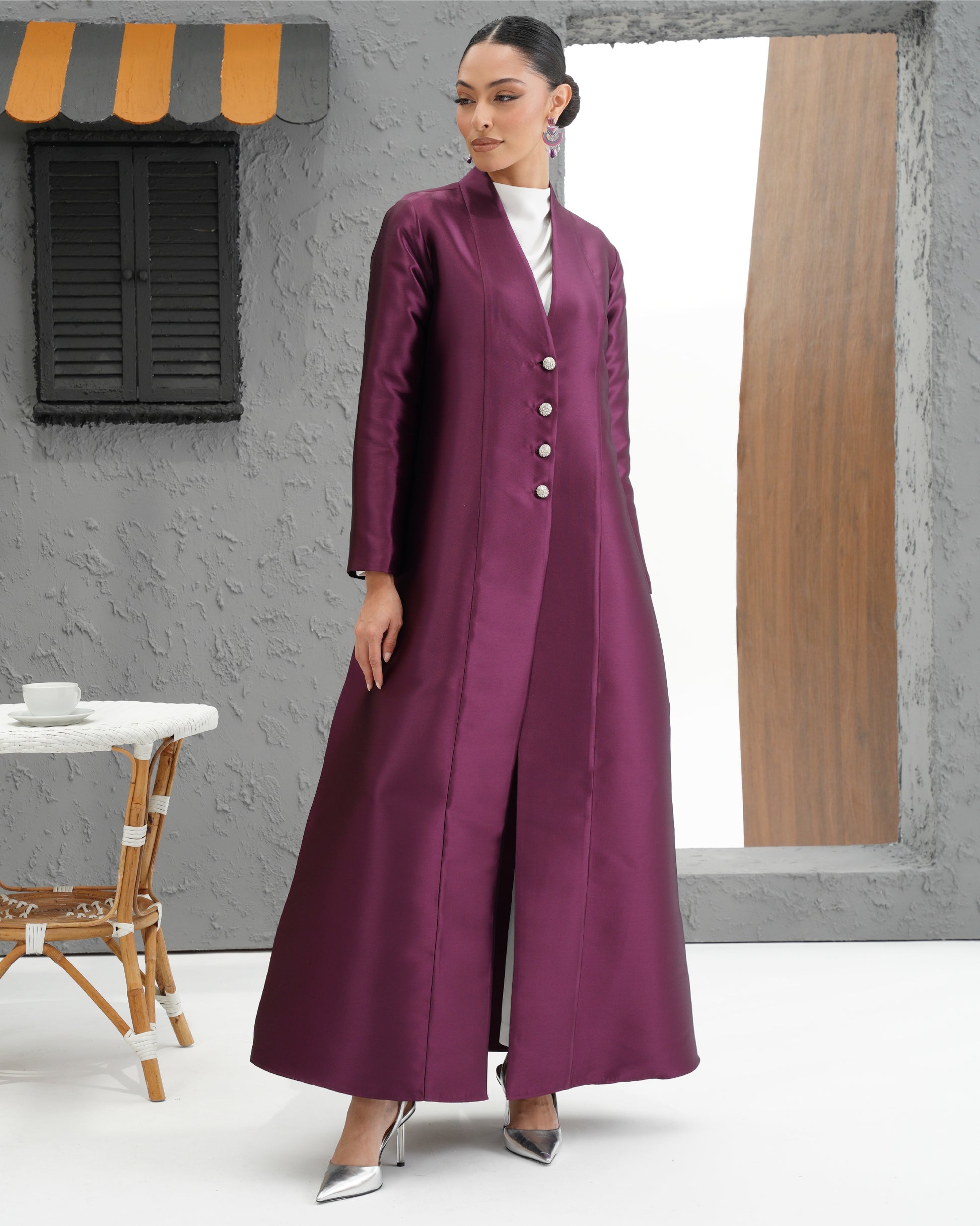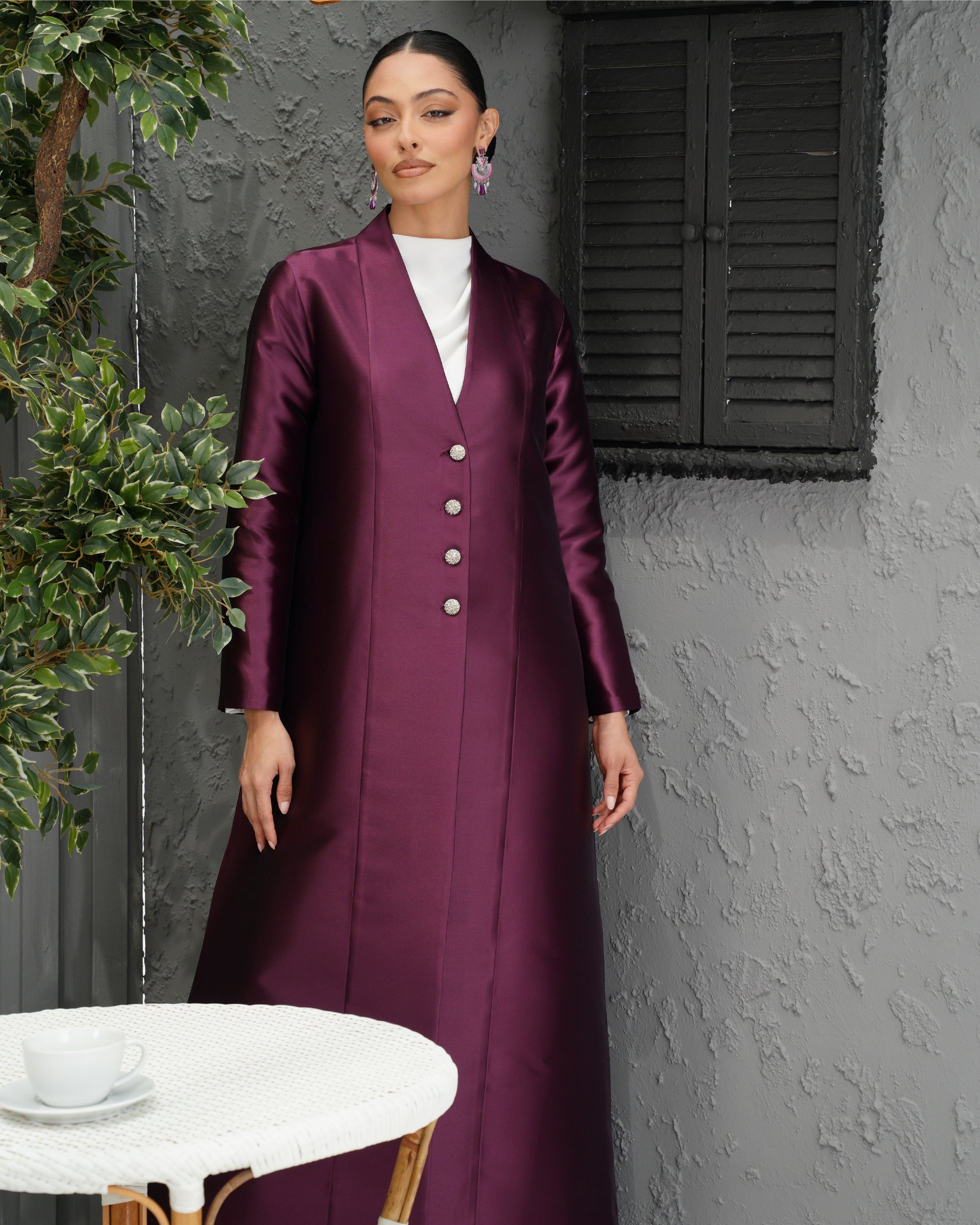 A Line Mikado Blazer-Cut Abaya with Structured Panels, V Collar and 4 Silver Buttons Closure with Matching Dujja Chiffon Hijab
