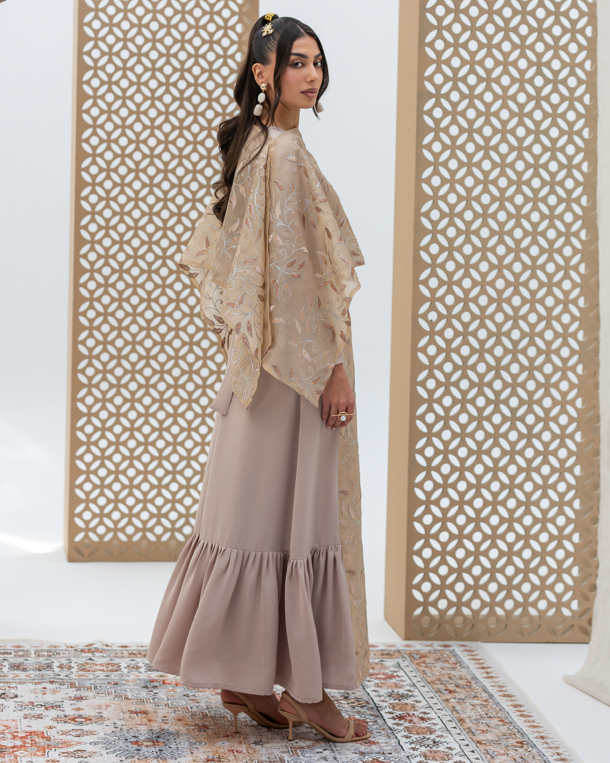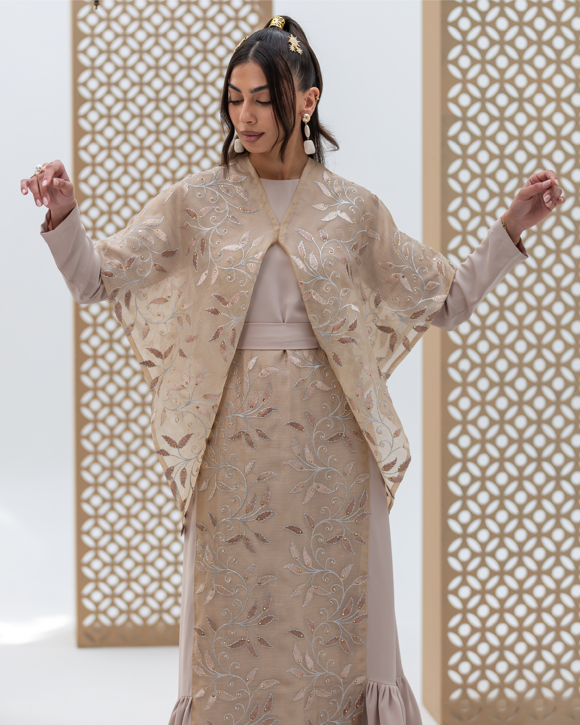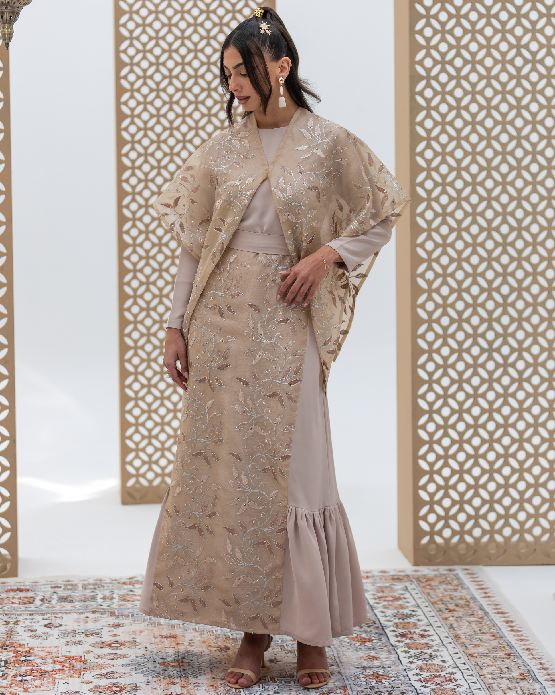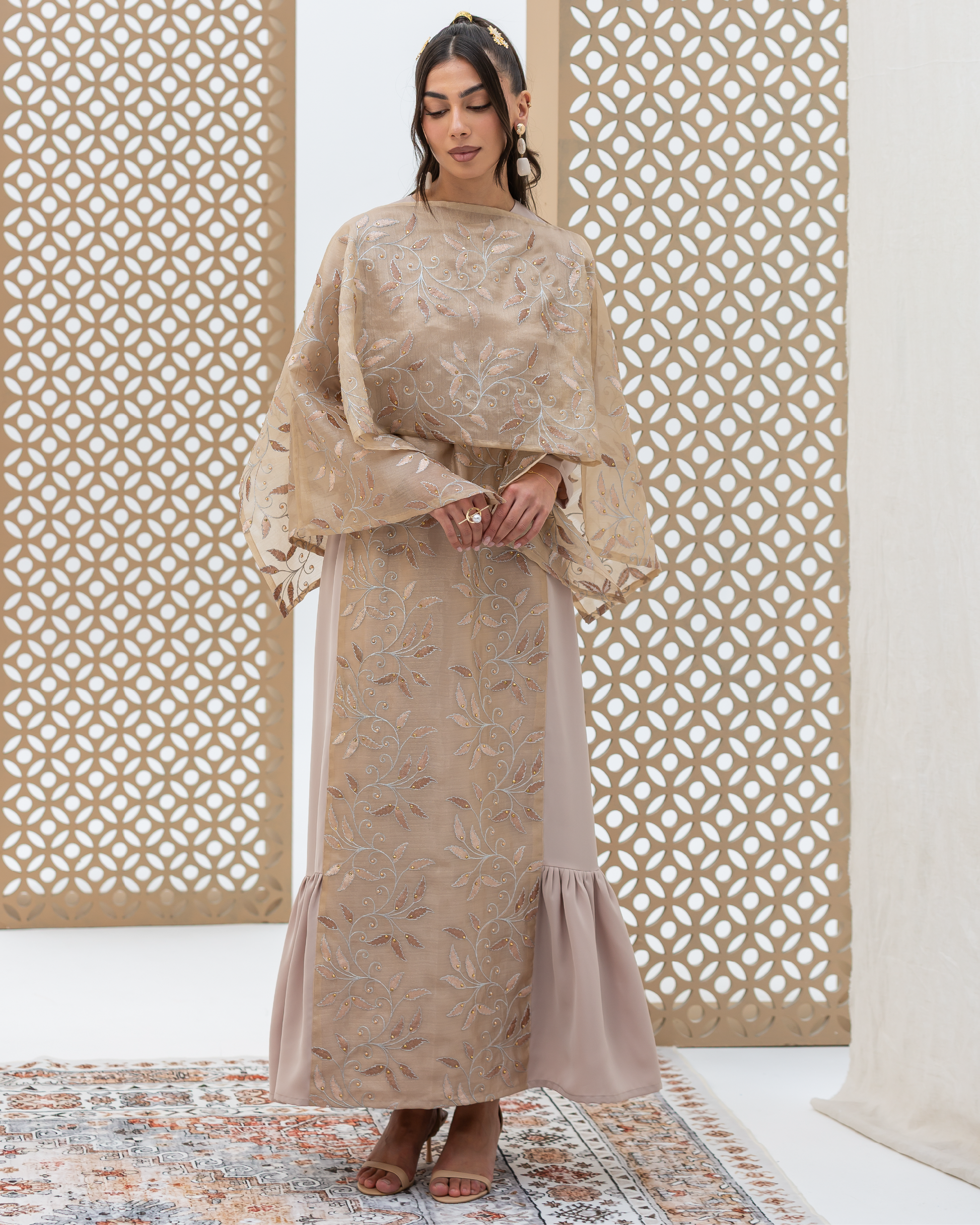 Beige Full-Length Dress Made of Dazzle Glitter Crepe, Fully Lined for a Luxurious Finish. Designed with Long Sleeves and a Round Neckline. Features an Integrated Embroidered Organza Overlay Accented with Gold and Silver Leaf Motifs and Subtle Gem Detailing. Finished with Soft Frilled Panels Along the Lower Hem for Added Movement. Comes with a Matching Embroidered Organza Crepe Wrap That Can Be Styled in Multiple Ways.