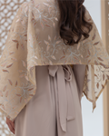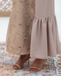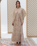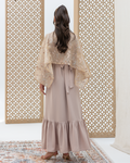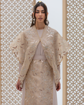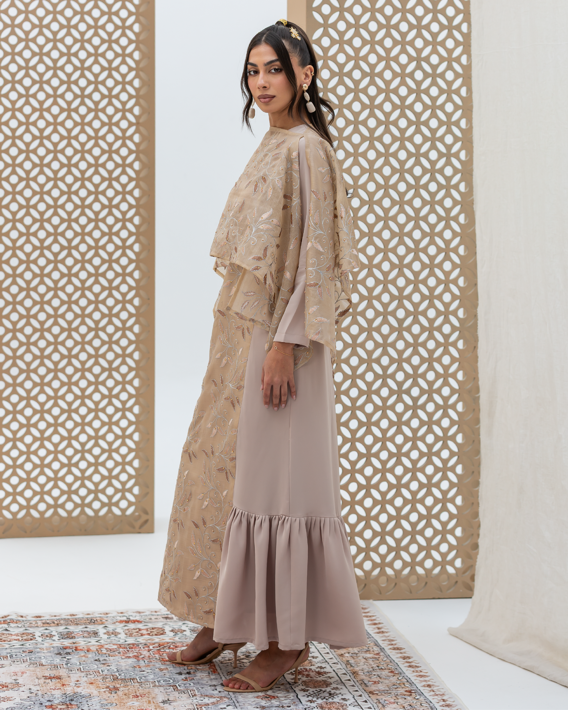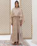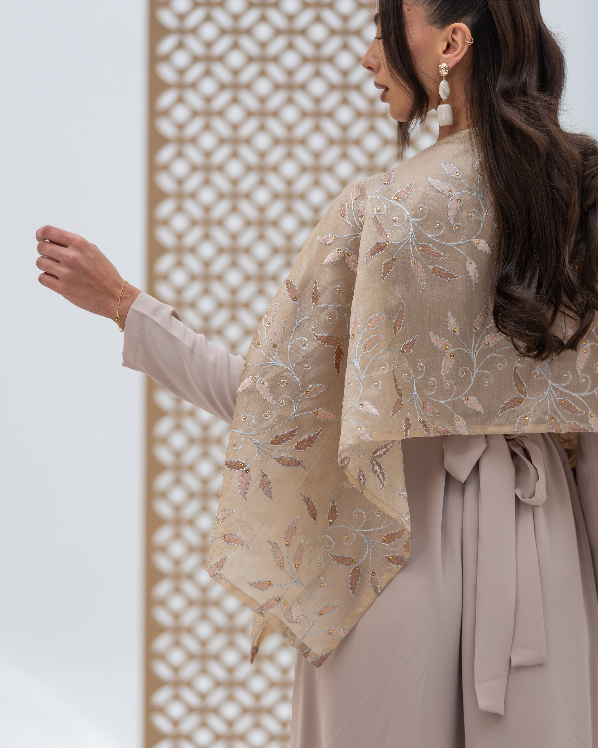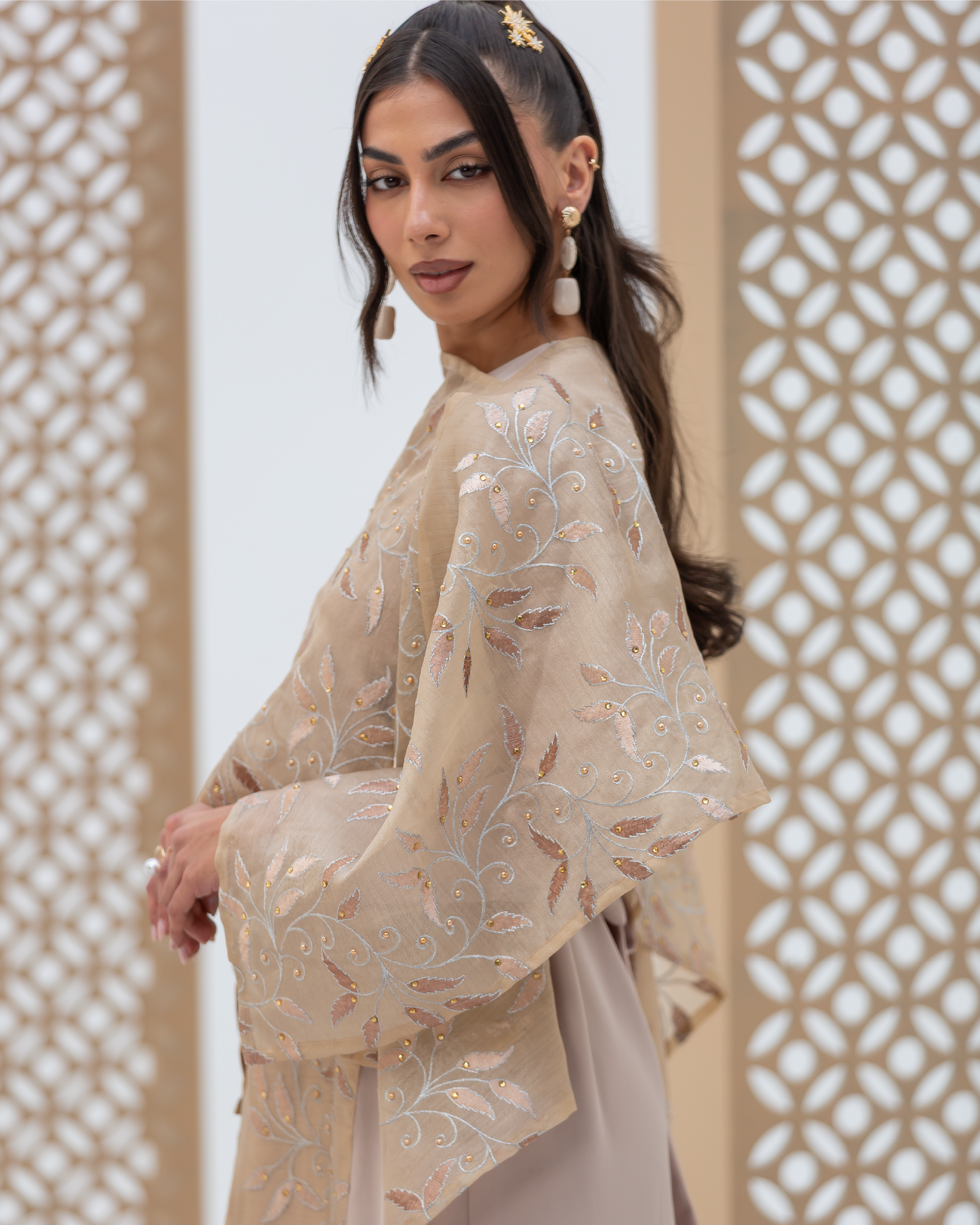Beige Full-Length Dress Made of Dazzle Glitter Crepe, Fully Lined for a Luxurious Finish. Designed with Long Sleeves and a Round Neckline. Features an Integrated Embroidered Organza Overlay Accented with Gold and Silver Leaf Motifs and Subtle Gem Detailing. Finished with Soft Frilled Panels Along the Lower Hem for Added Movement. Comes with a Matching Embroidered Organza Crepe Wrap That Can Be Styled in Multiple Ways.