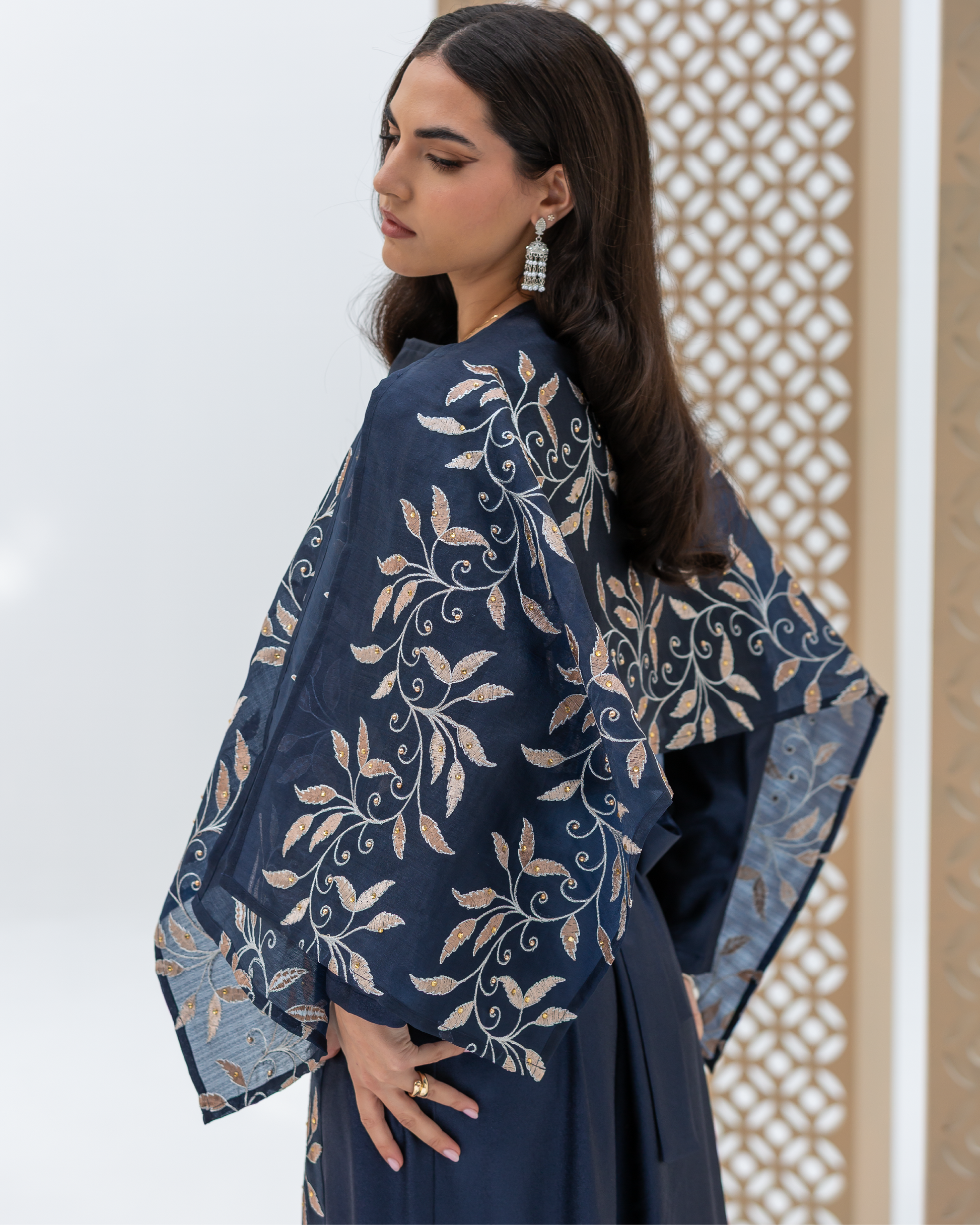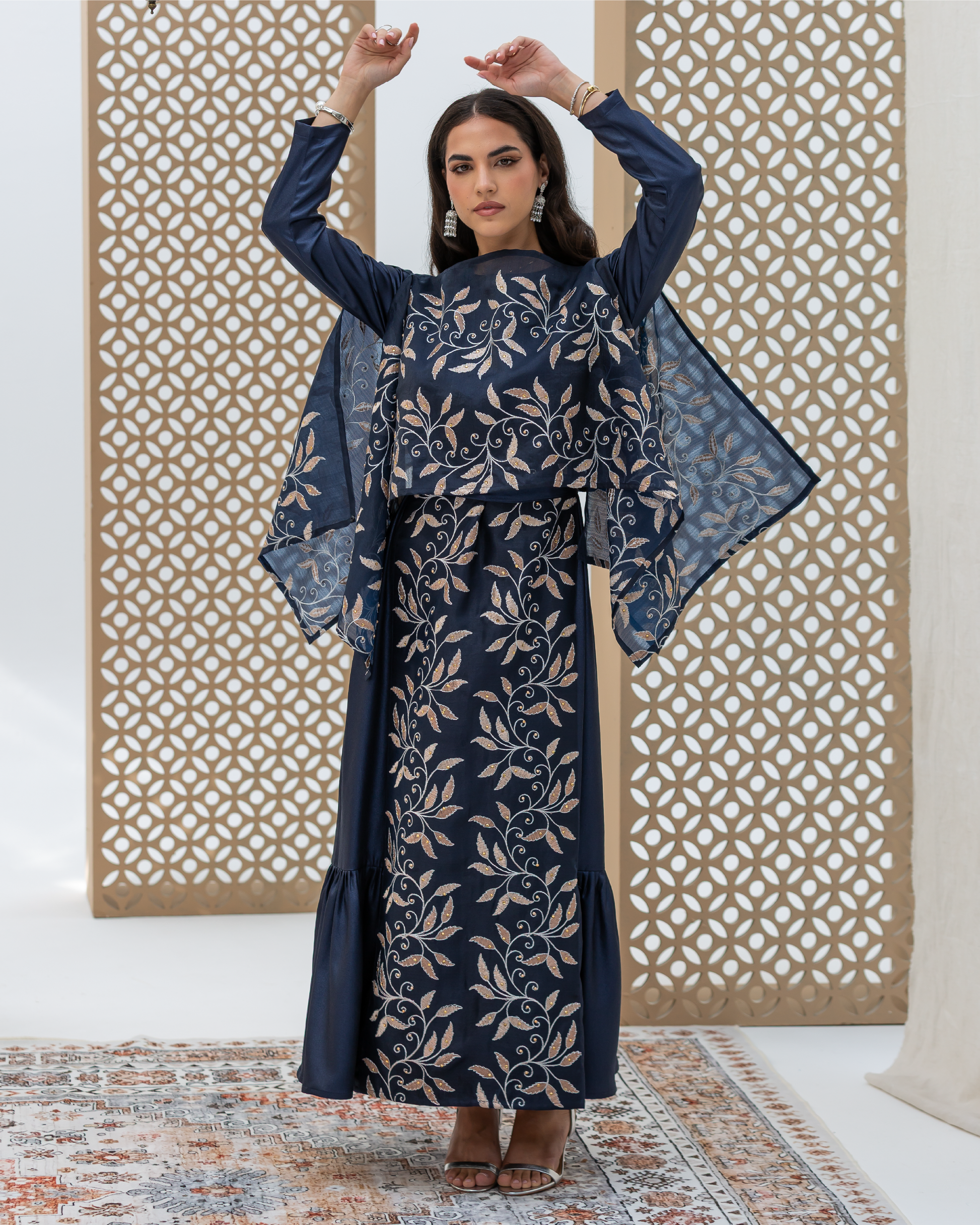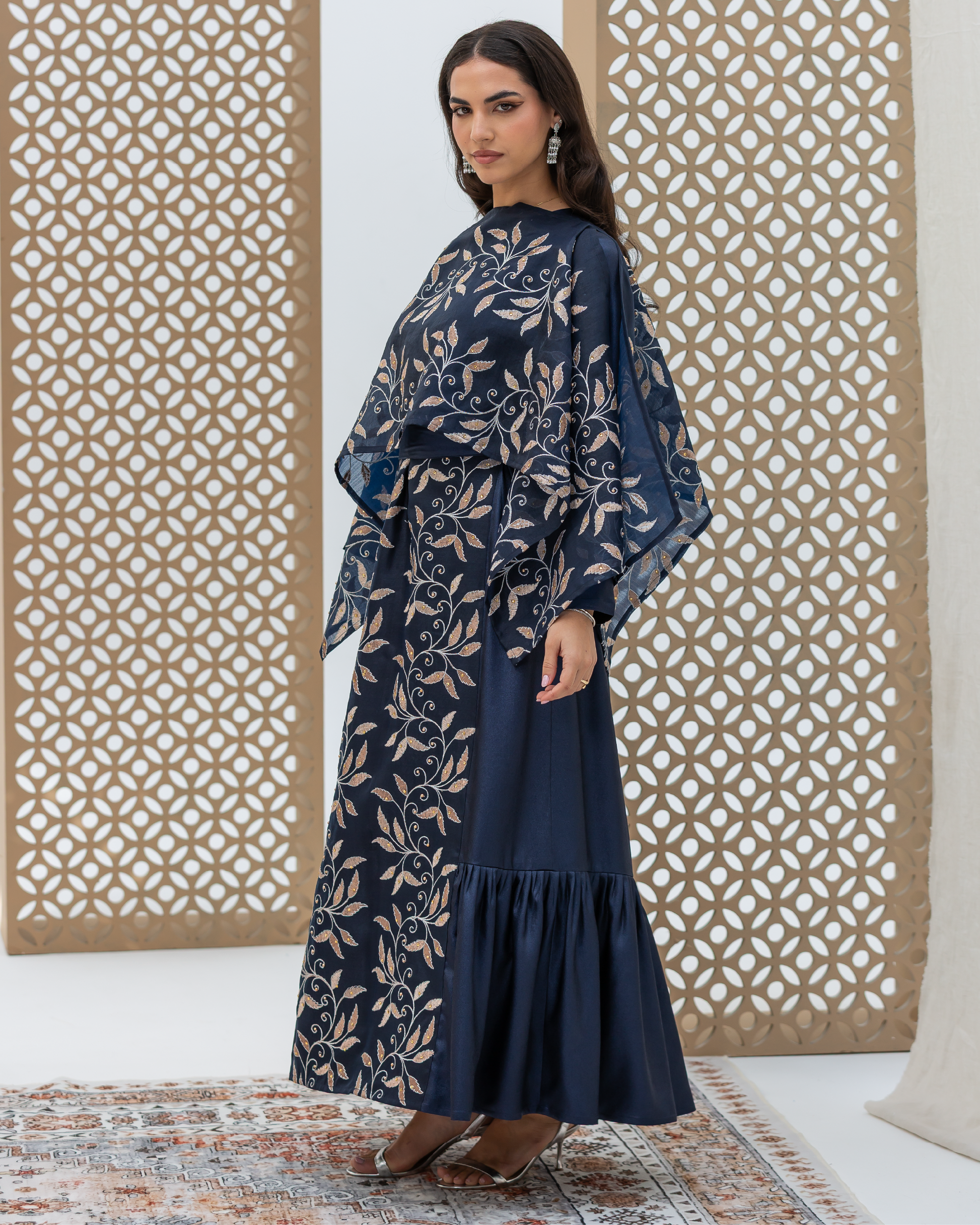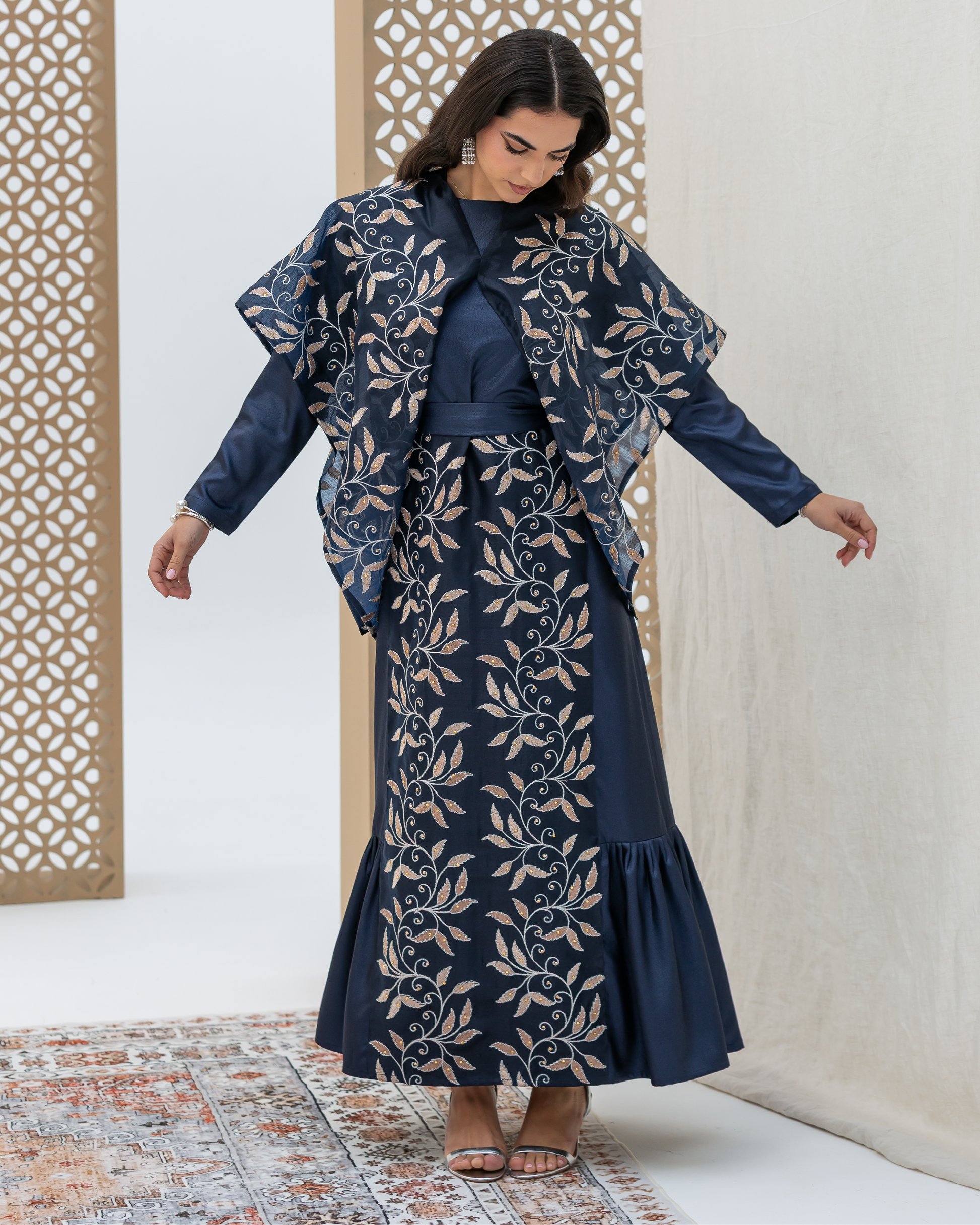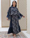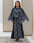 Navy Full-Length Dress Made of Dazzle Glitter Crepe, Fully Lined for a Luxurious Finish. Designed with Long Sleeves and a Round Neckline. Features an Integrated Embroidered Organza Overlay Accented with Gold and Silver Leaf Motifs and Subtle Gem Detailing. Finished with Soft Frilled Panels Along the Lower Hem for Added Movement. Comes with a Matching Embroidered Organza Crepe Wrap That Can Be Styled in Multiple Ways.