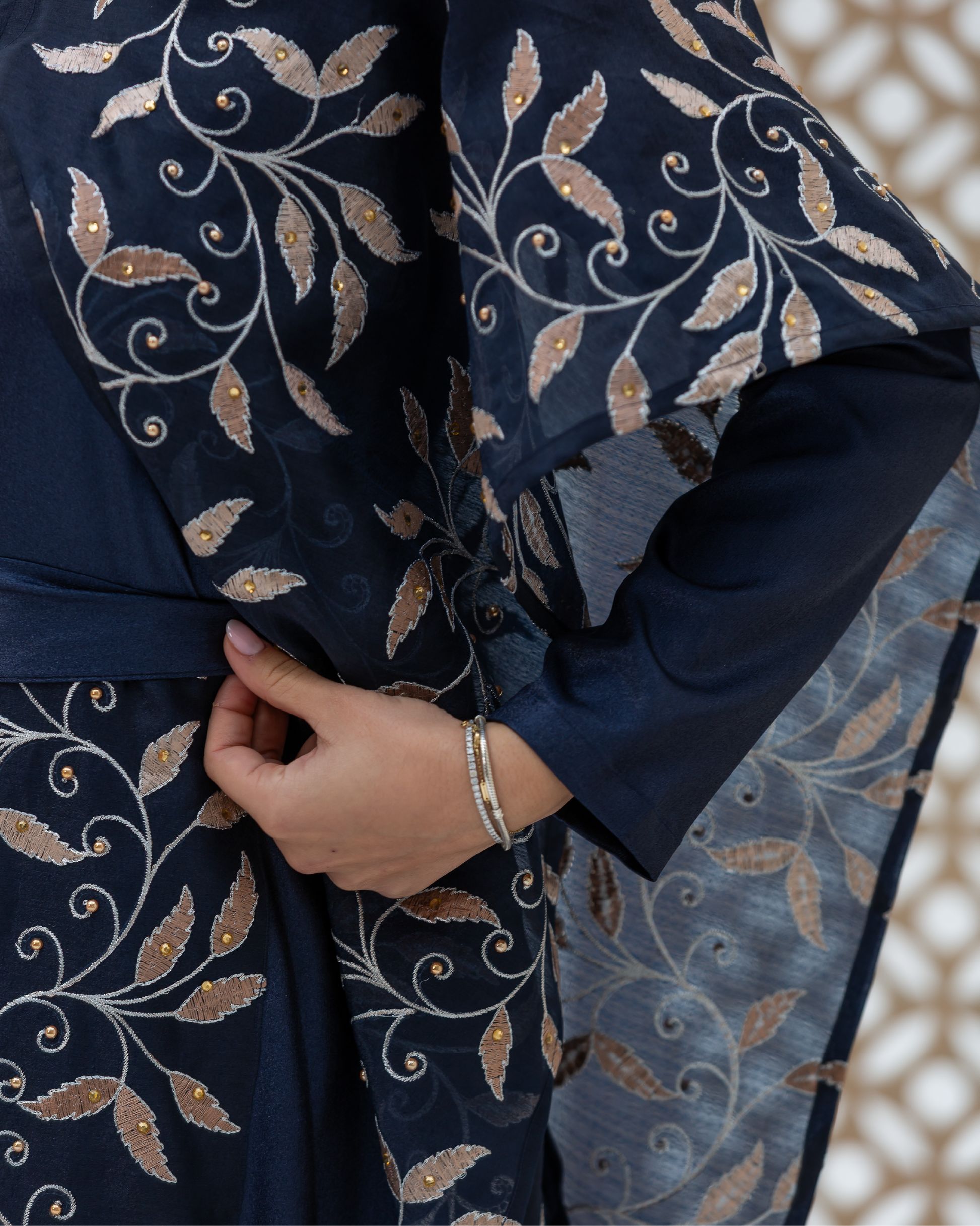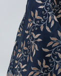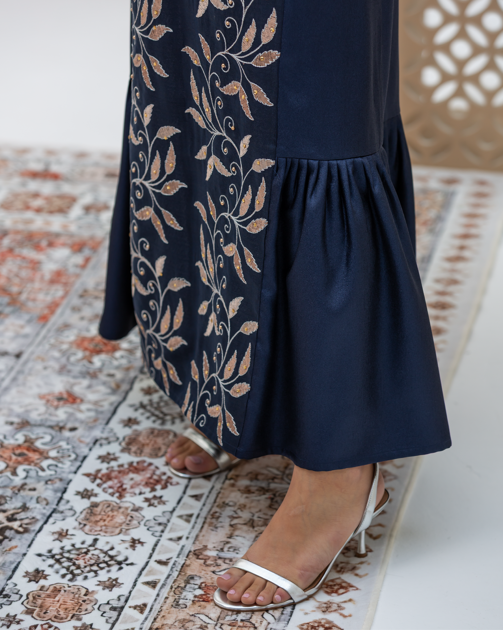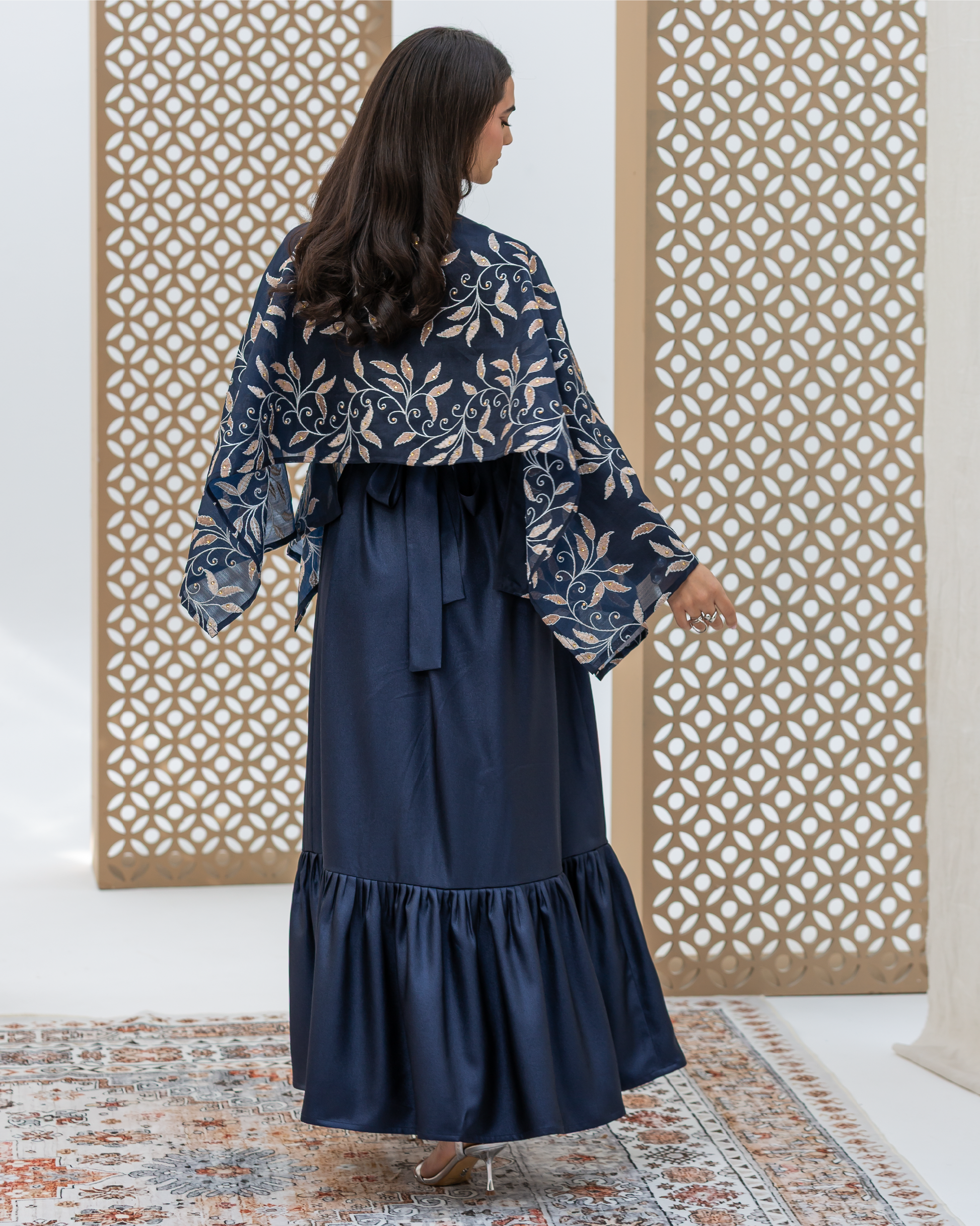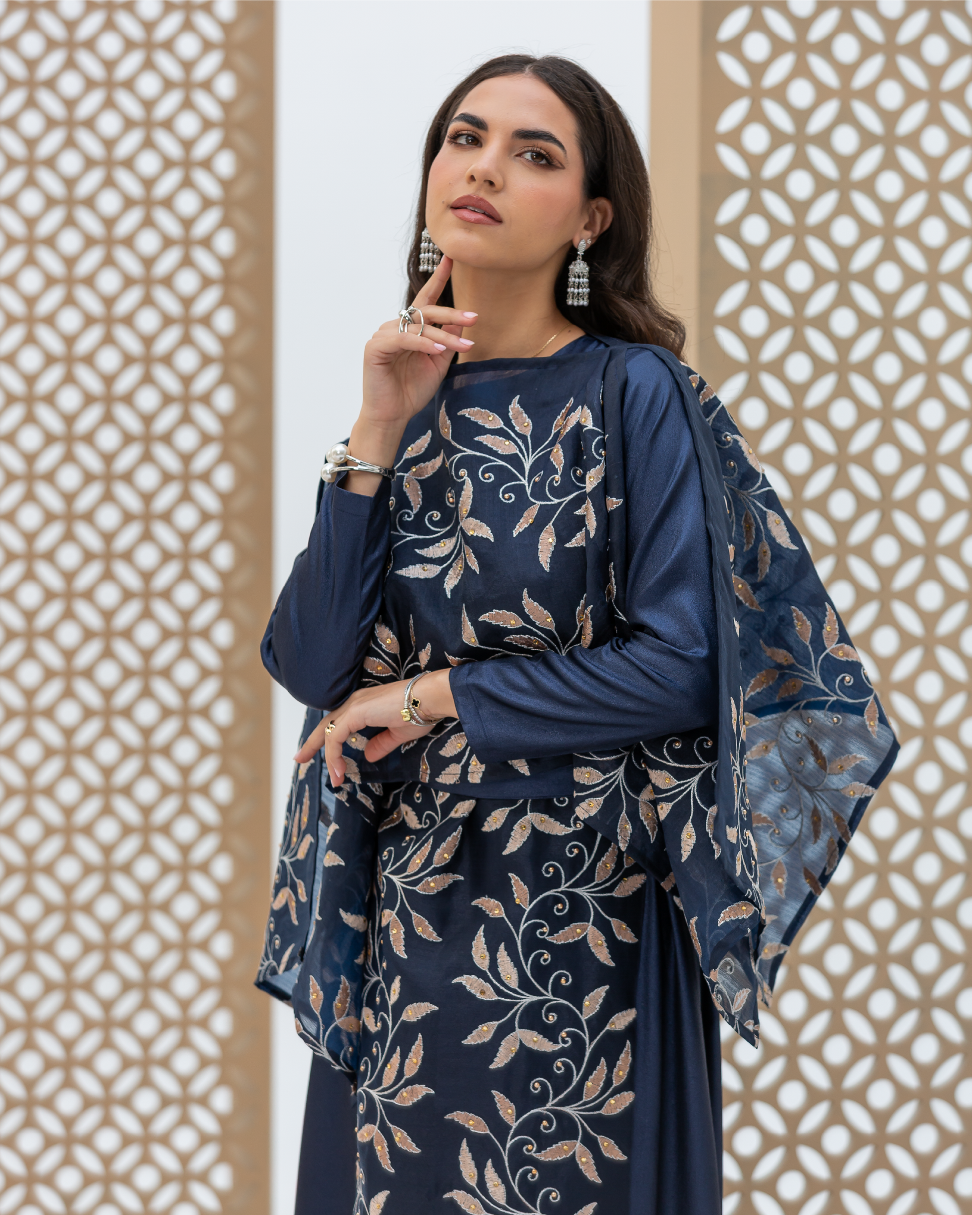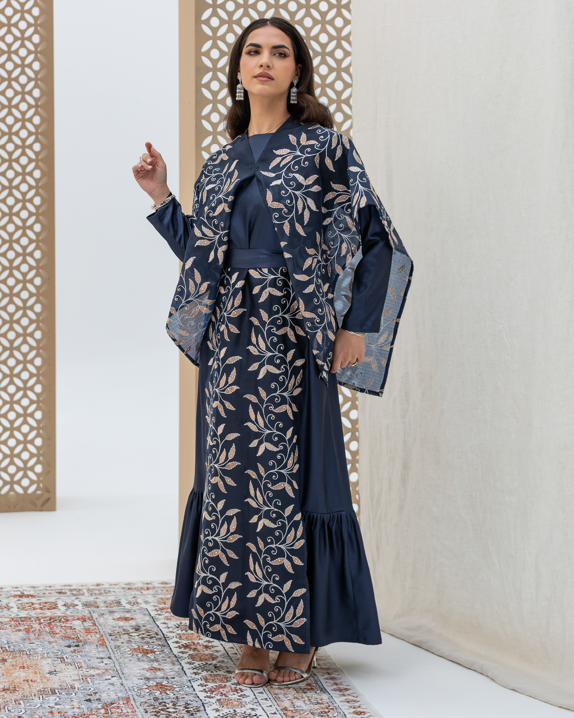Navy Full-Length Dress Made of Dazzle Glitter Crepe, Fully Lined for a Luxurious Finish. Designed with Long Sleeves and a Round Neckline. Features an Integrated Embroidered Organza Overlay Accented with Gold and Silver Leaf Motifs and Subtle Gem Detailing. Finished with Soft Frilled Panels Along the Lower Hem for Added Movement. Comes with a Matching Embroidered Organza Crepe Wrap That Can Be Styled in Multiple Ways.