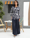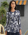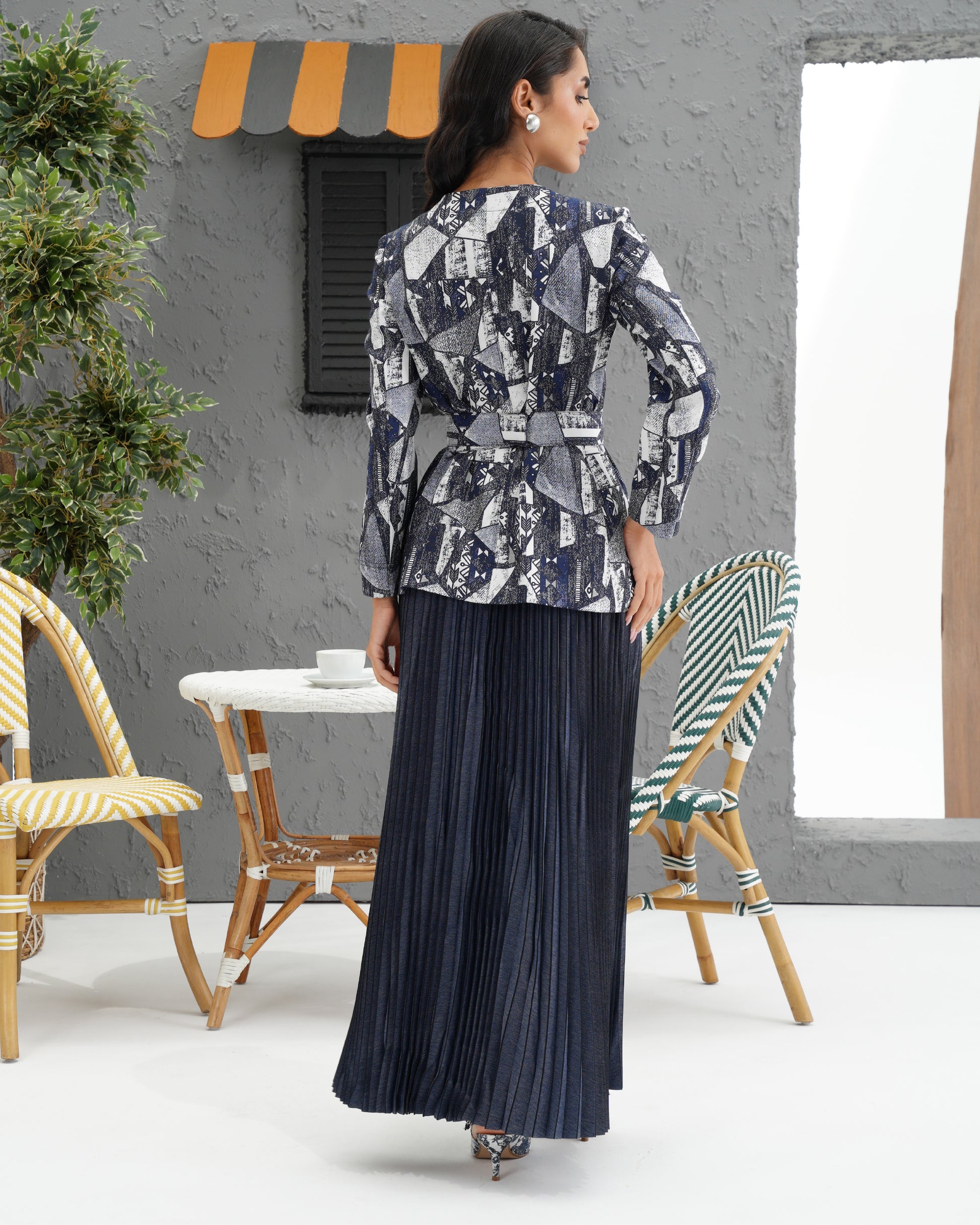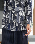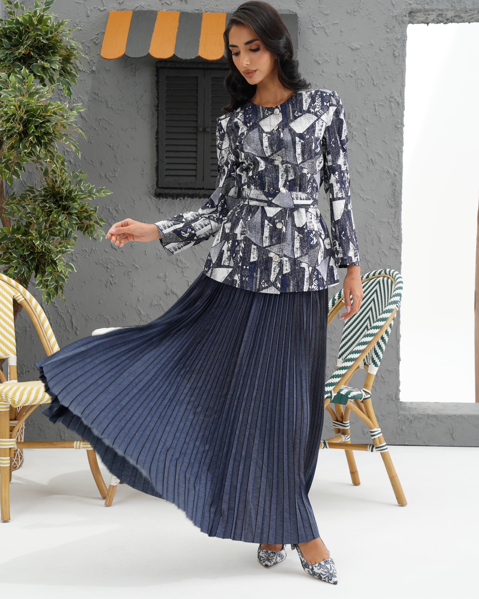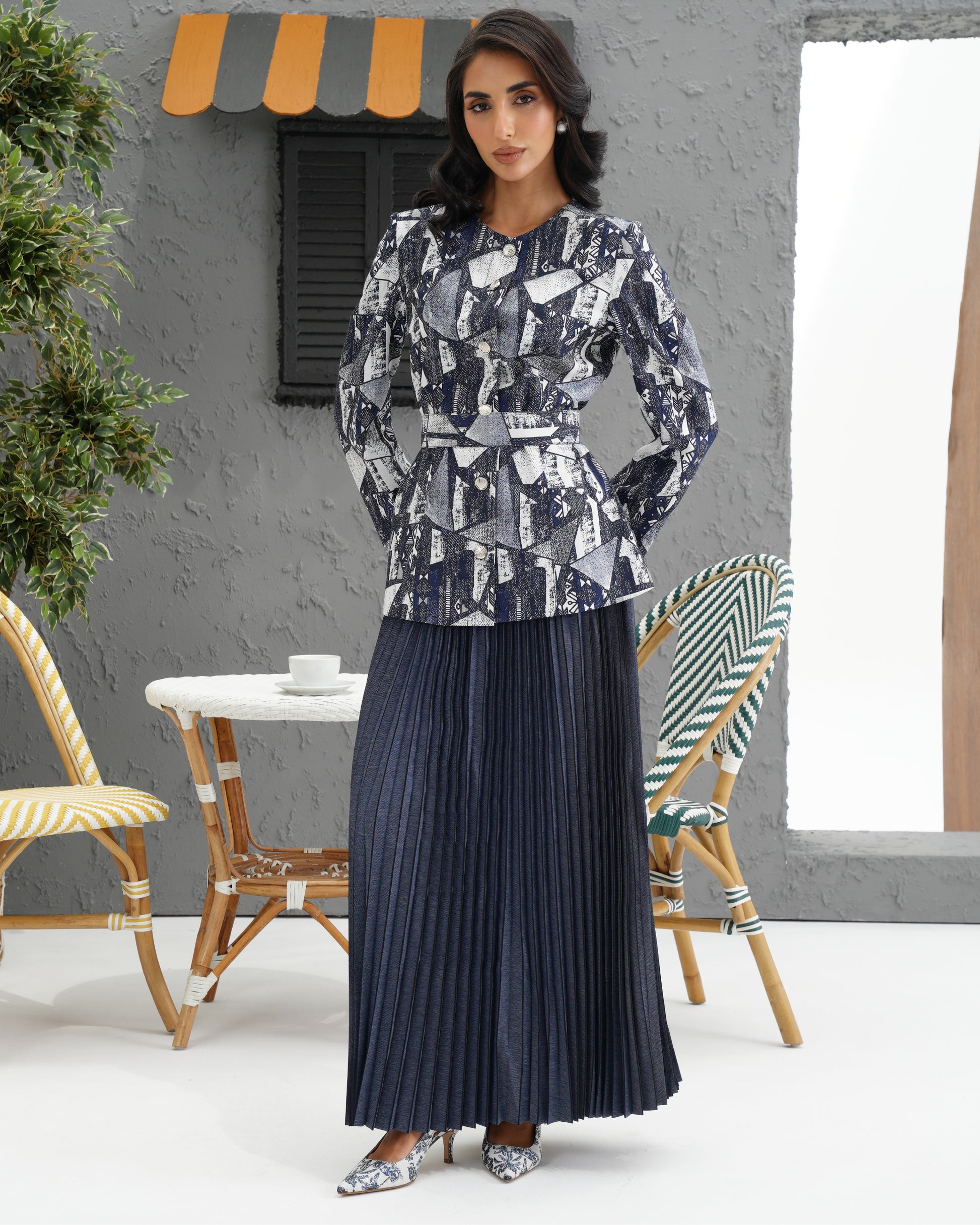 Skirt Suit featuring Abstract Art Embossed Rich Navy and White Denim Lined Jacket with a Fitted Cut and a Belt. Matched with a Pleated Flared Denim Skirt with Black Panels.