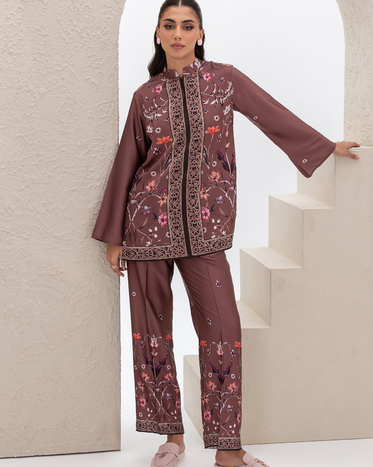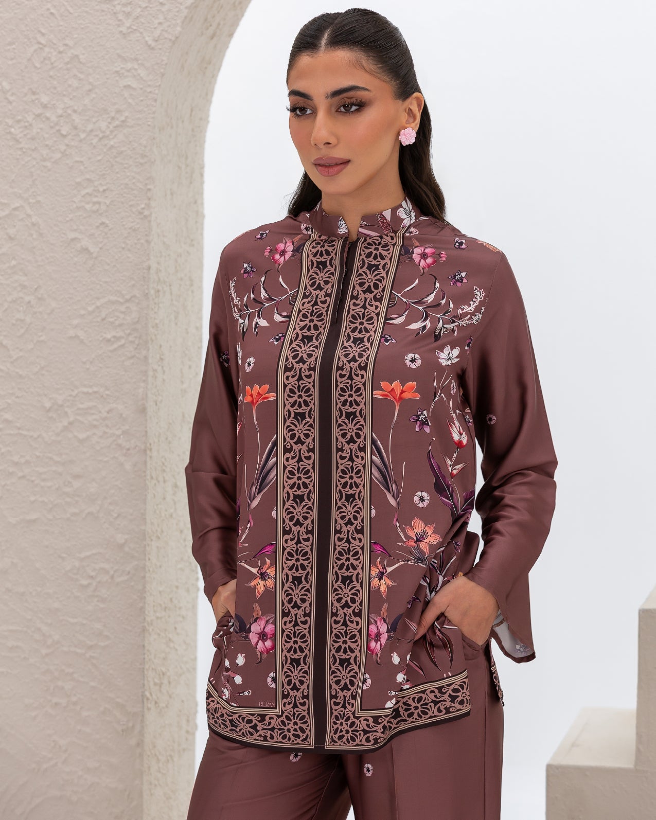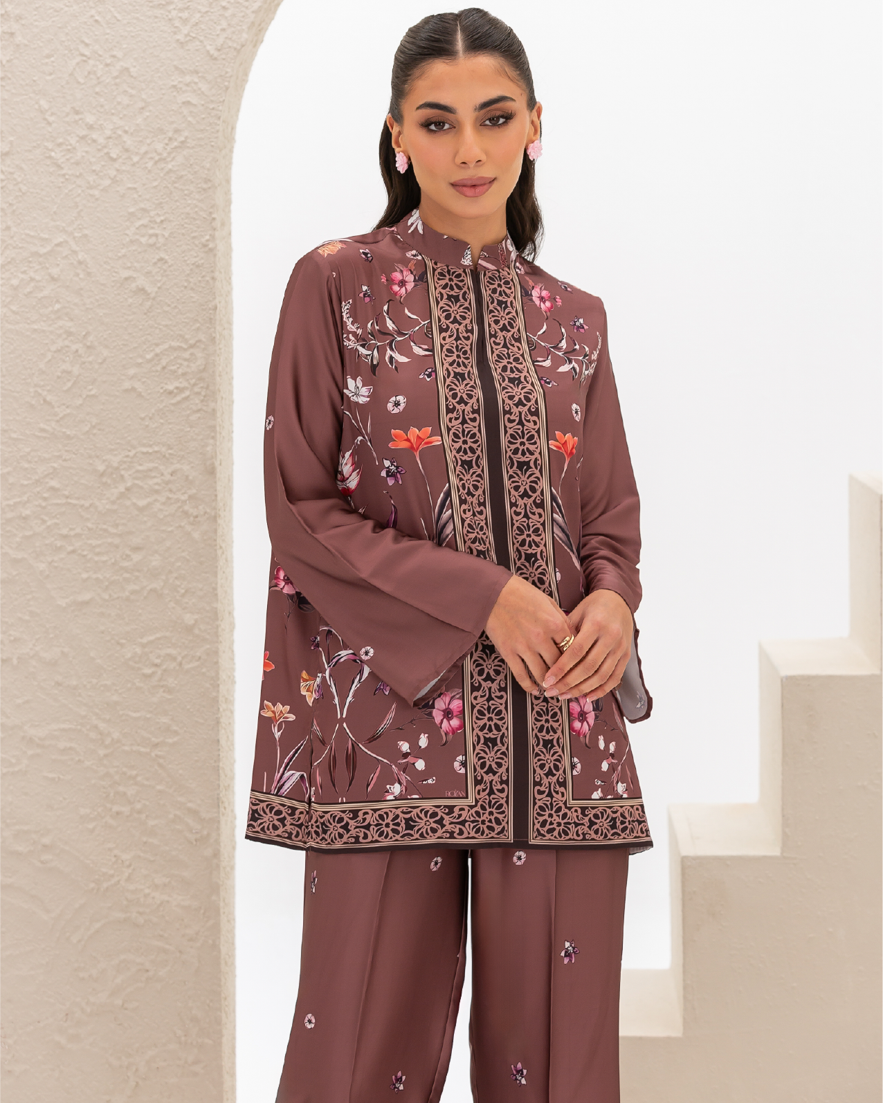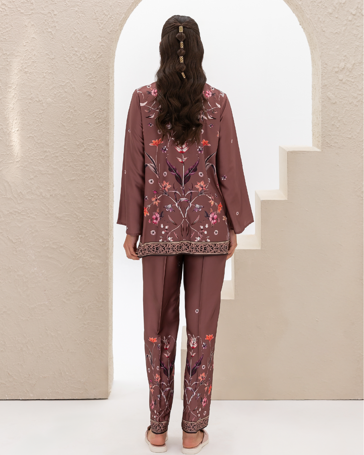 Armani Silk Set Featuring a Floral Print on a Brown Background, with a Loose-Fit Tunic Designed with 4 Tiktak Button and Two Side Slits, Paired with Straight-Cut Elastic-Waist Pants with Pockets.