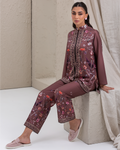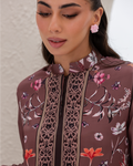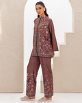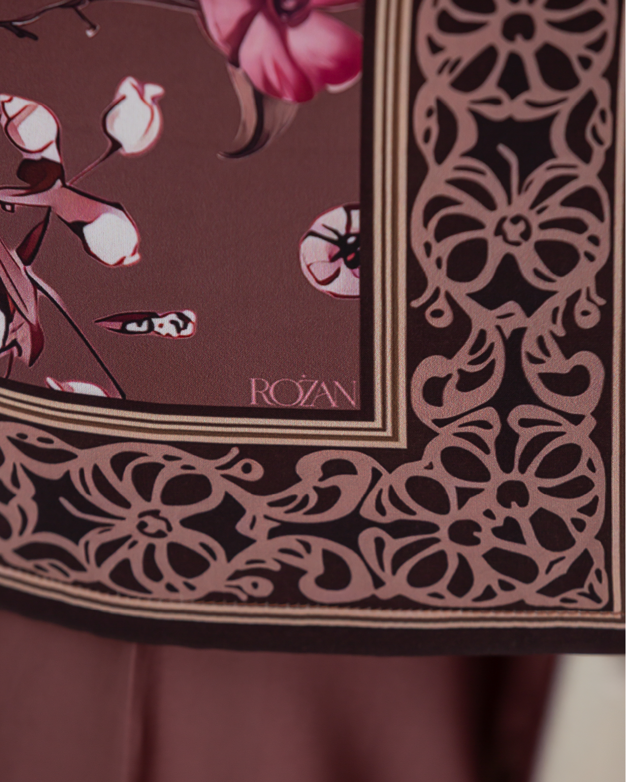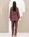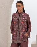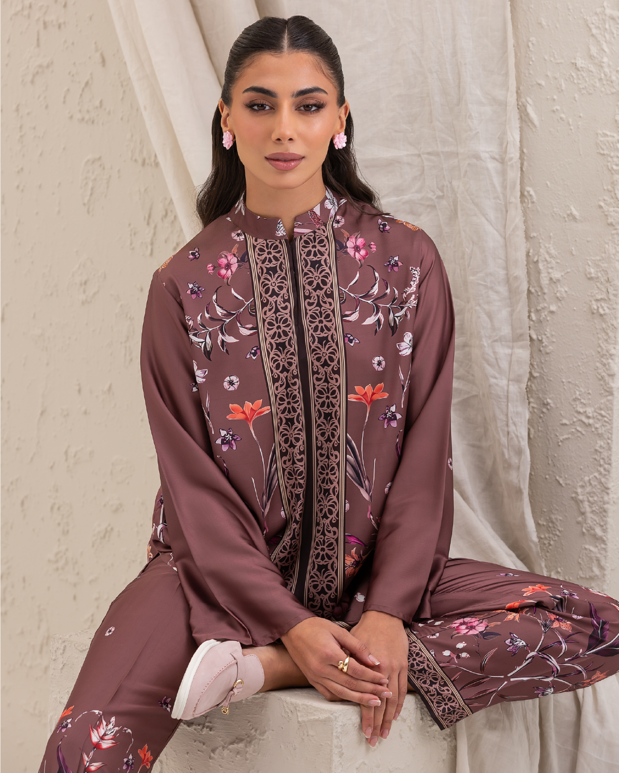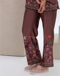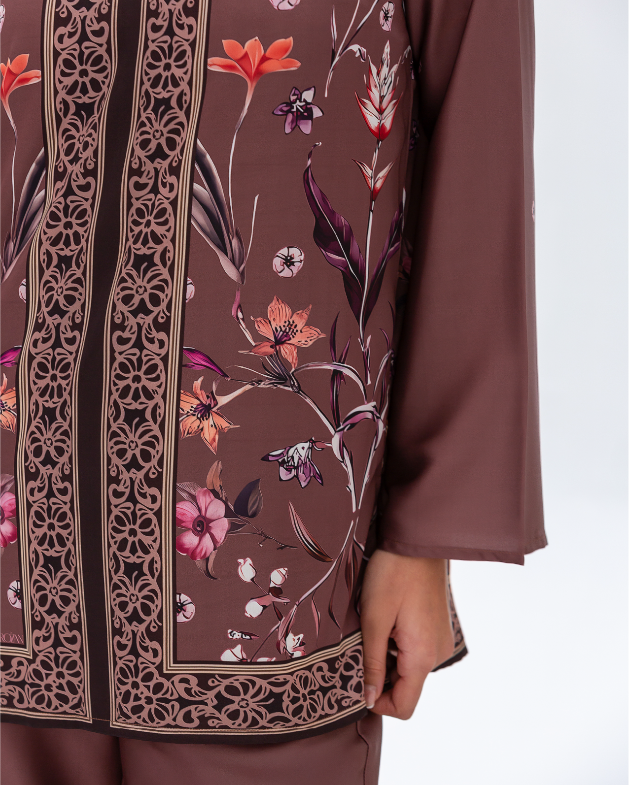 Armani Silk Set Featuring a Floral Print on a Brown Background, with a Loose-Fit Tunic Designed with 4 Tiktak Button and Two Side Slits, Paired with Straight-Cut Elastic-Waist Pants with Pockets.